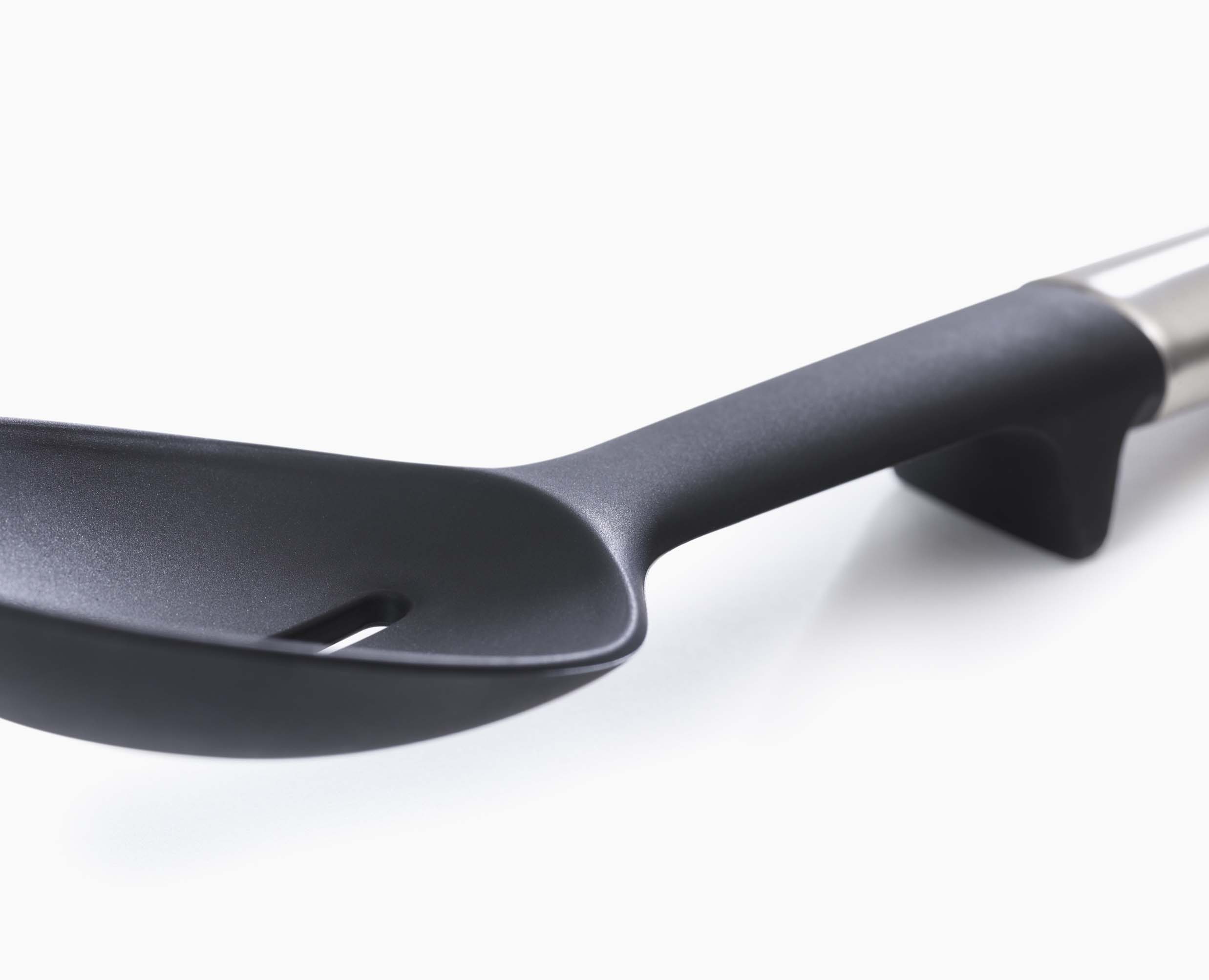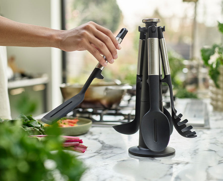 This 5-piece utensil carousel set includes all the core kitchen utensils in a rotating storage stand for easy access. It features Elevate™ technology with integrated rests to keep the head off countertops, improving hygiene and reducing mess.