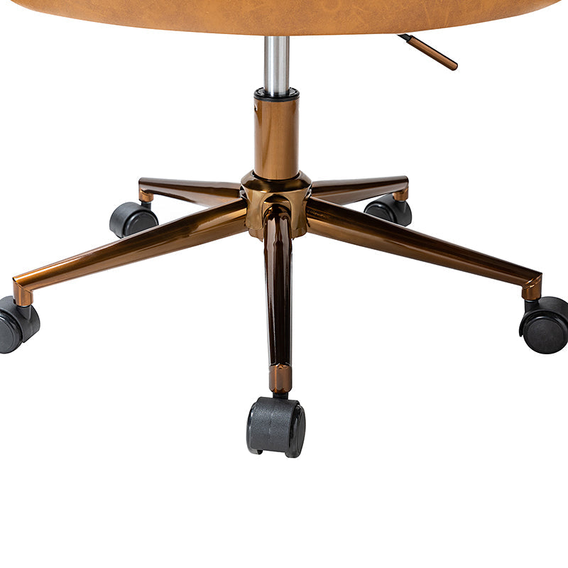 The vegan leather office chair with a mid-century design features a sleek and sophisticated aesthetic that adds a touch of elegance to any workspace. Its key feature is the channel barrel back, which provides excellent support and comfort for long hours of sitting. The chair is equipped with wheels, allowing for easy mobility and seamless movement across different areas of the office. Additionally, it offers the convenience of adjustable height, enabling users to customize the position of the chair to their preferred level of comfort. The combination of vegan leather upholstery, mid-century design, channel barrel back, wheels, and adjustable height makes this office chair a stylish and practical choice for any professional environment.