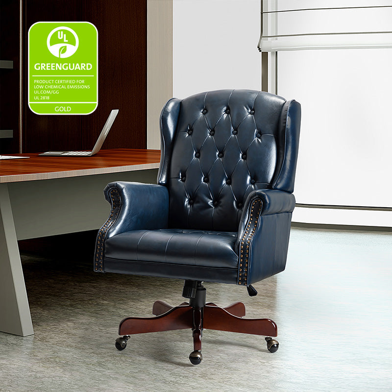 Add a touch of classic elegance to your space with a design that is equally functional and stylish. This swivel office chair is a wonderful addition to any office or home office with its variety of vibrant colors-vegan leather upholstery that blends with any design taste. Designed in an attractive style with tufted buttons-dotting wingback and integrated rolled arms lend a tailored touch, this executive chair features a sturdy solid and manufactured frame and beautiful red-brown finished base combined with 360-degree metal wheels allow you to glide to anywhere in the room. Glam nailhead trim embellishes the rolled arms and outlines the shape of it while a lever-operated lift to adjust the seat height tailors your professional space. This piece also offers you extreme comfort and support with its foam filled backrest as well as pocket spring built-in seat. Luxurious executive chair is the perfect use-it-everywhere piece, it will create a glamorous, eye-catching look and could be used in their bedroom, entryway or office.