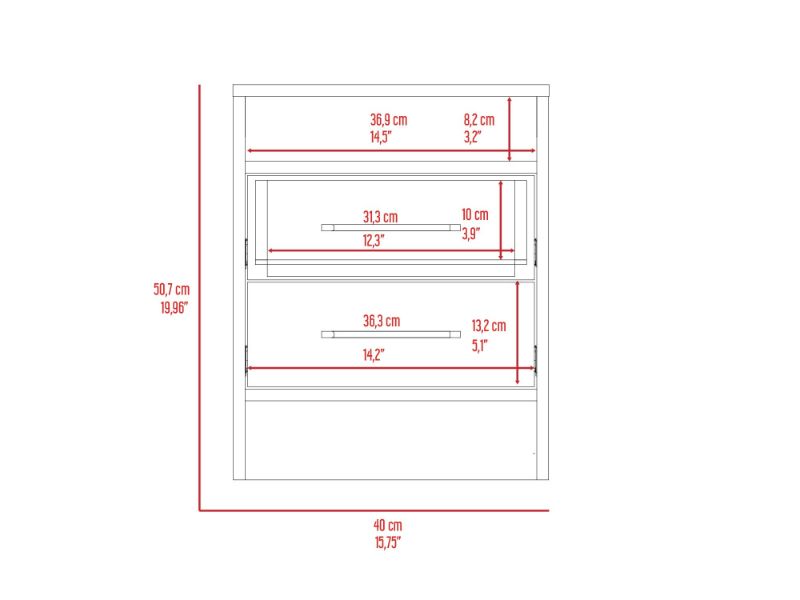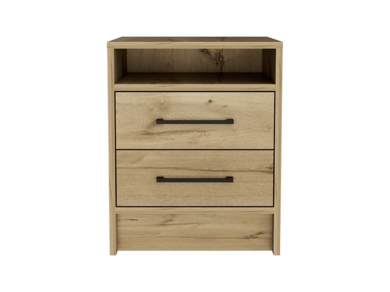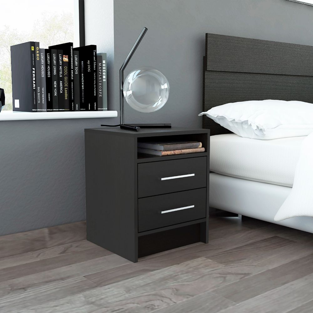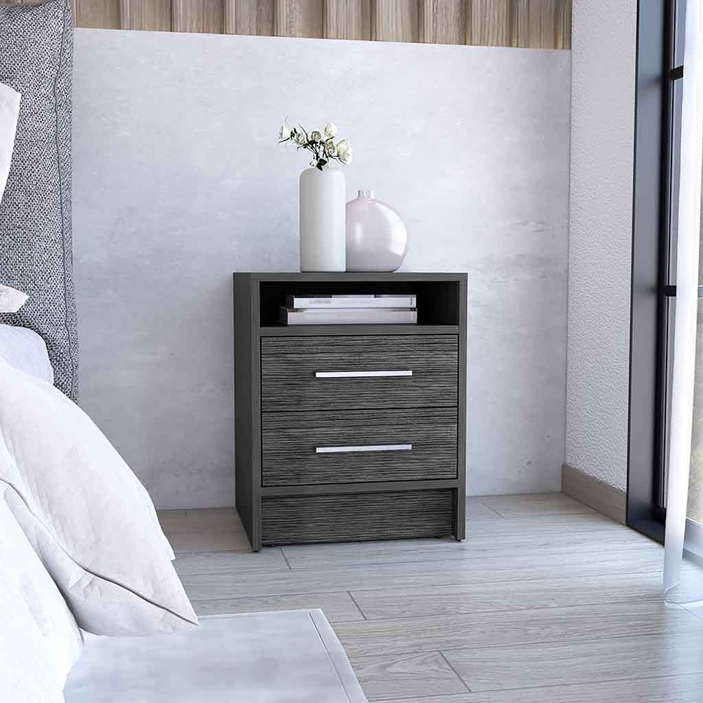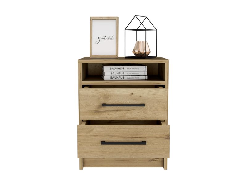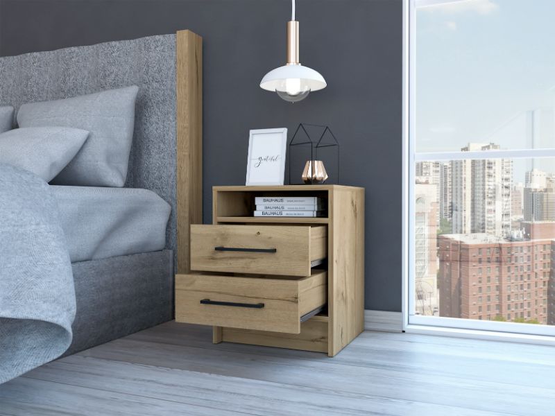 The Bianco Nightstand You'll love the look of this sleek and modern nightstand in your bedroom or living room. It has a fresh, contemporary design that will complement any décor. Designed with a unique touch of smoky oak-white particleboard finish, the Bianco Nightstand comes with two drawers ( 14,2''W X 5,1''H) for extra storage and safety with an open compartment for books or your mobile devices.
