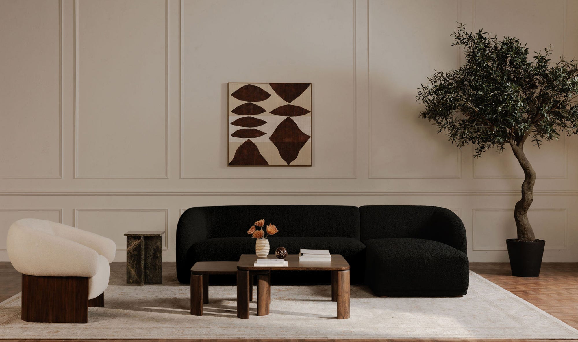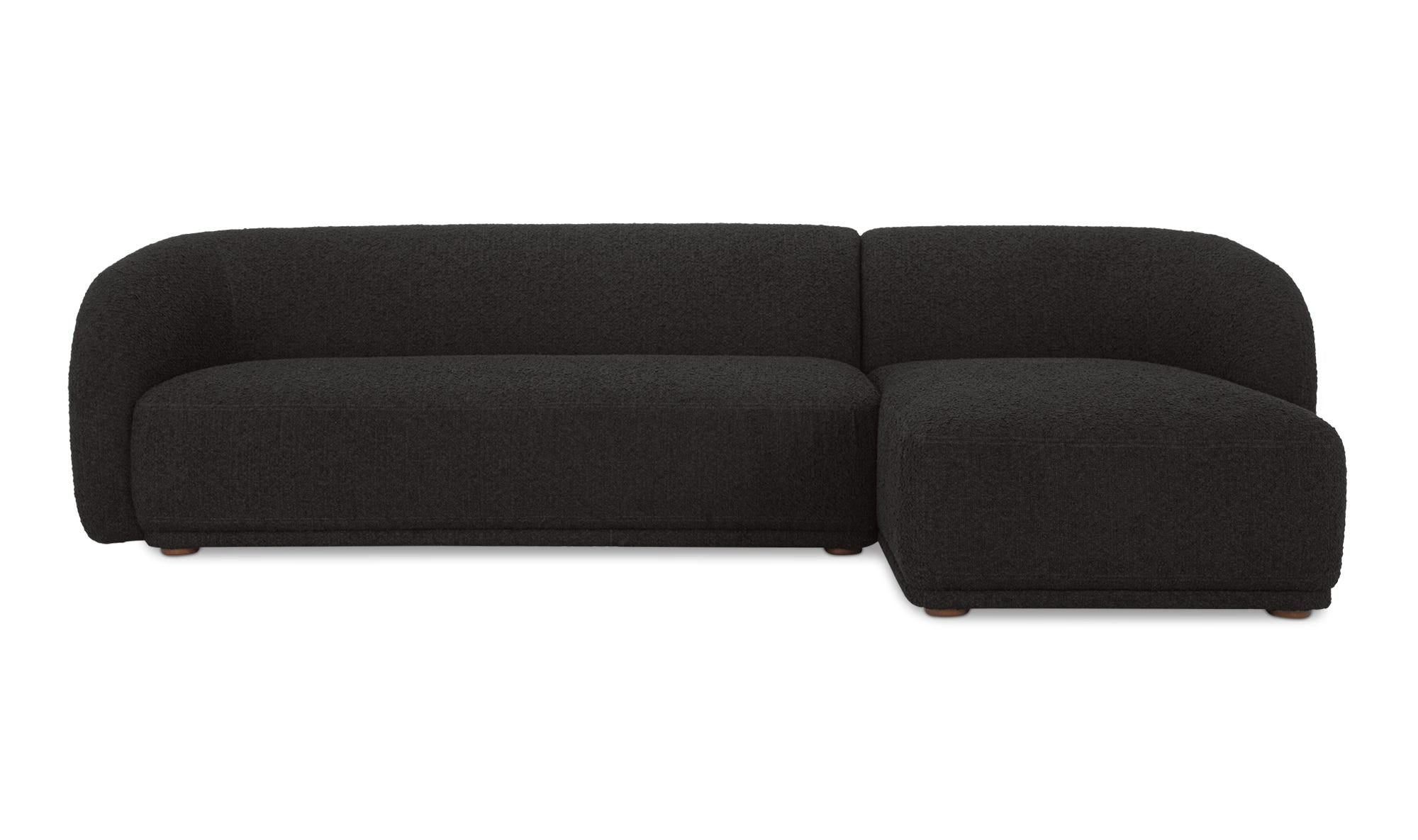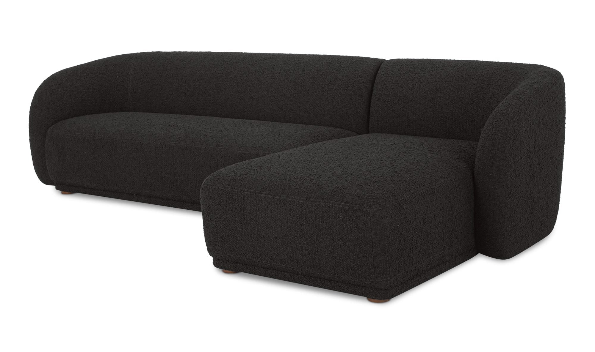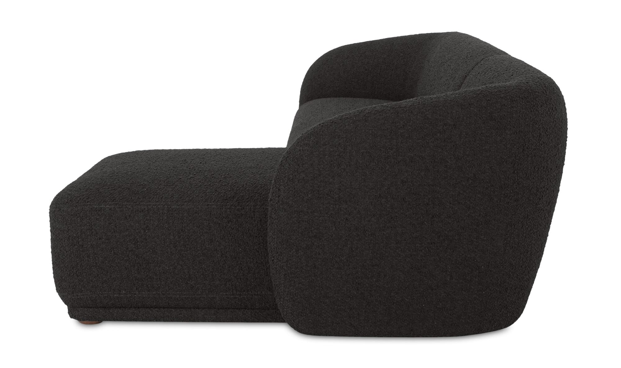Constructed from solid beech and plywood, the Faye sectional's unique curved back and firm, fixed bench seat rest on petite, rounded rubberwood legs. The exaggerated boucle fabric has a robust 100,000 rub count bringing depth and an art deco feel to its contemporary form--a touch of elegance to expansive living.
