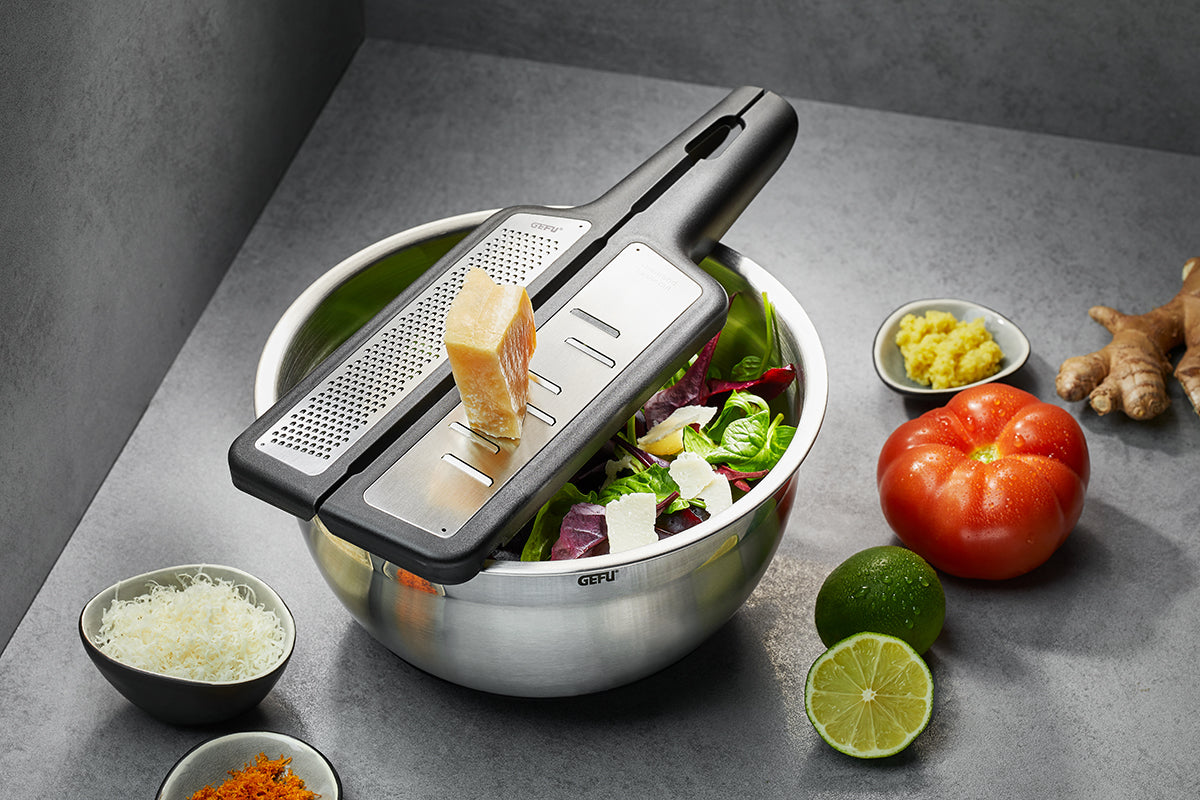 This makes grating twice as much fun! When folded, RAFINO stands on a practical non-slip foot and, thanks to the extremely sharp DIAMOND LASER CUT technology, its fine grater effortlessly produces the finest gratings, and the slicer produces wonderfully delicate shavings. When opened, RAFINO lies ergonomically flat on pots or bowls and saves space in every drawer.