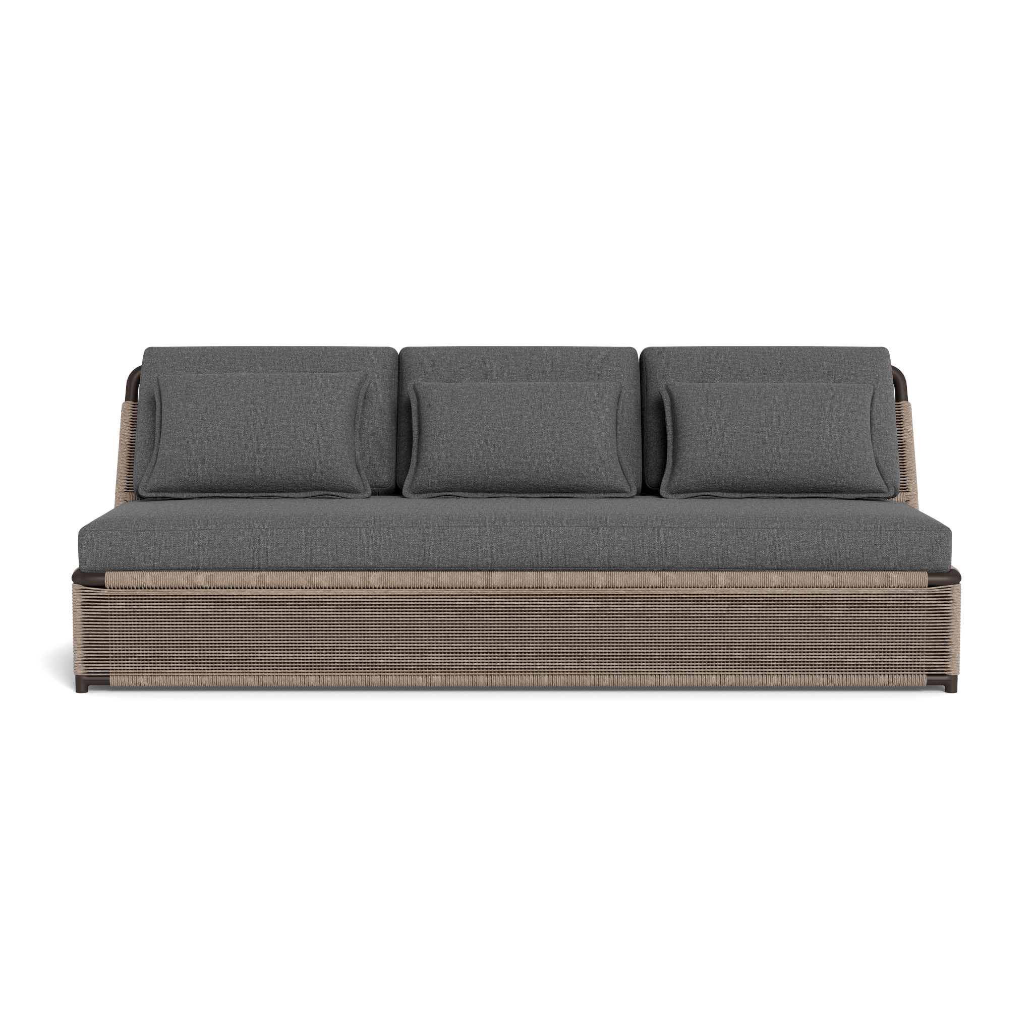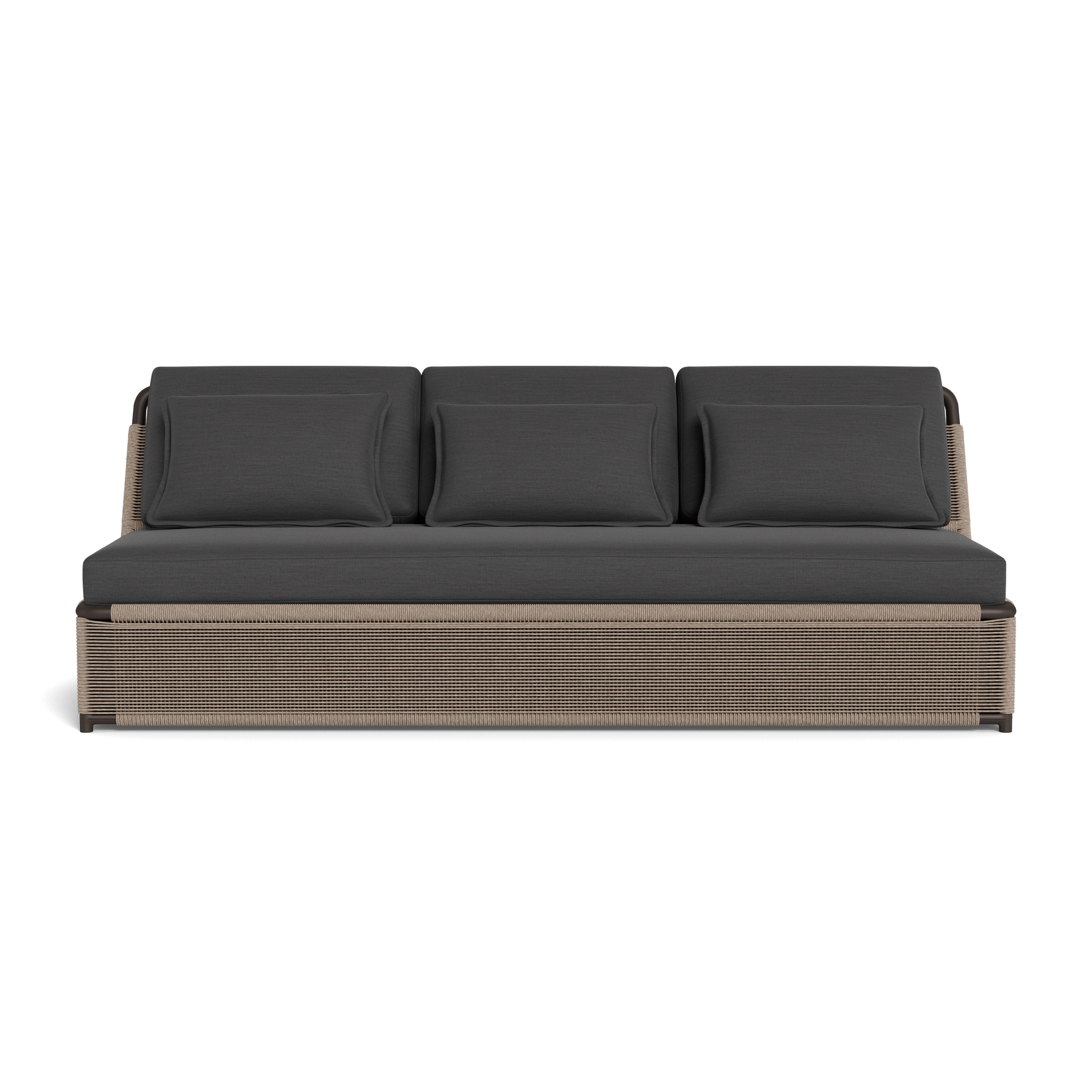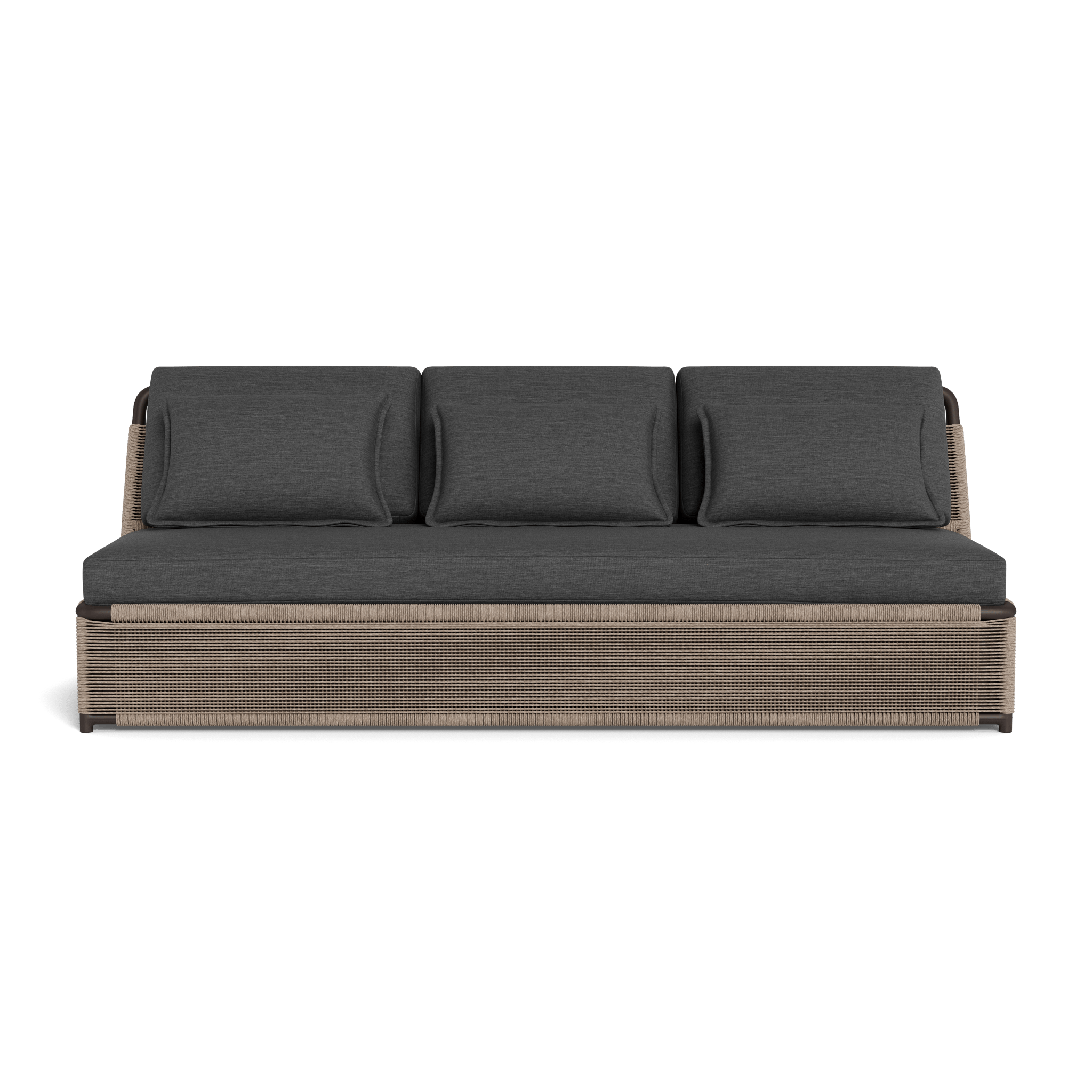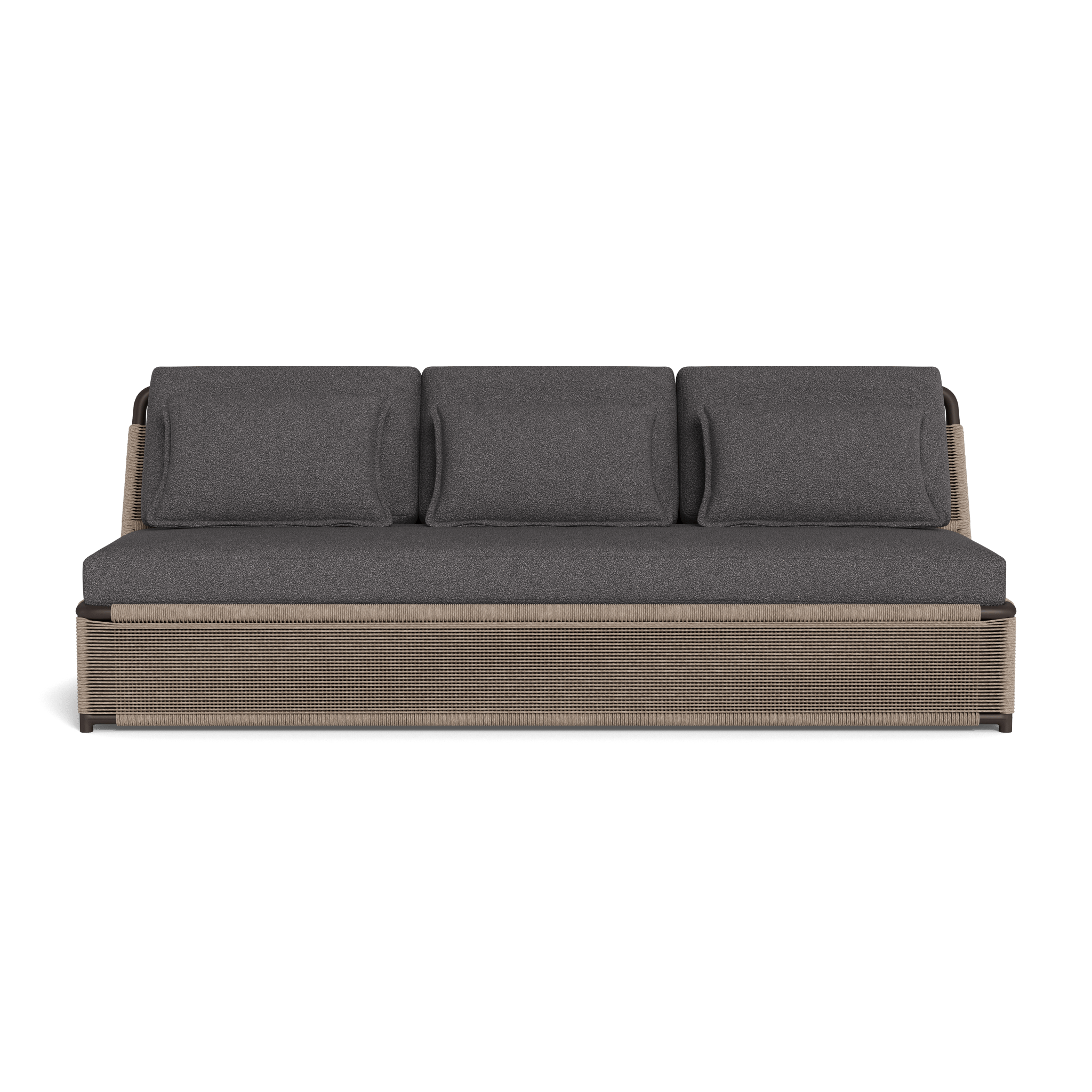 Designed by Kara Mann. Featuring exposed aluminum tube, twisted all-weather rope and deep green marble, our Formentera collection is organic luxury. The Formentera 3 Seat Armless Sofa transforms traditional aesthetics for a coastal lifestyle — enjoy outdoor cushions with extra Dacron for a plush appearance and lumbar support on an angled silhouette of tubular extruded aluminum, powder coated in bronze and hand woven with all-weather rope in our workshop. The rope features a twisted detail that recalls functional nautical ropes. Contemporary in proportion, this armless piece offers ease of use and bold shapes. Also available as a 2 Seat Armless Sofa and Lounge Chair.