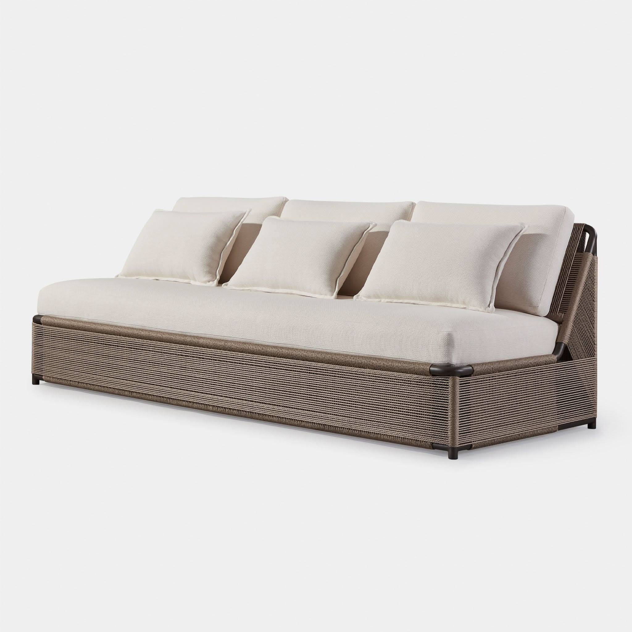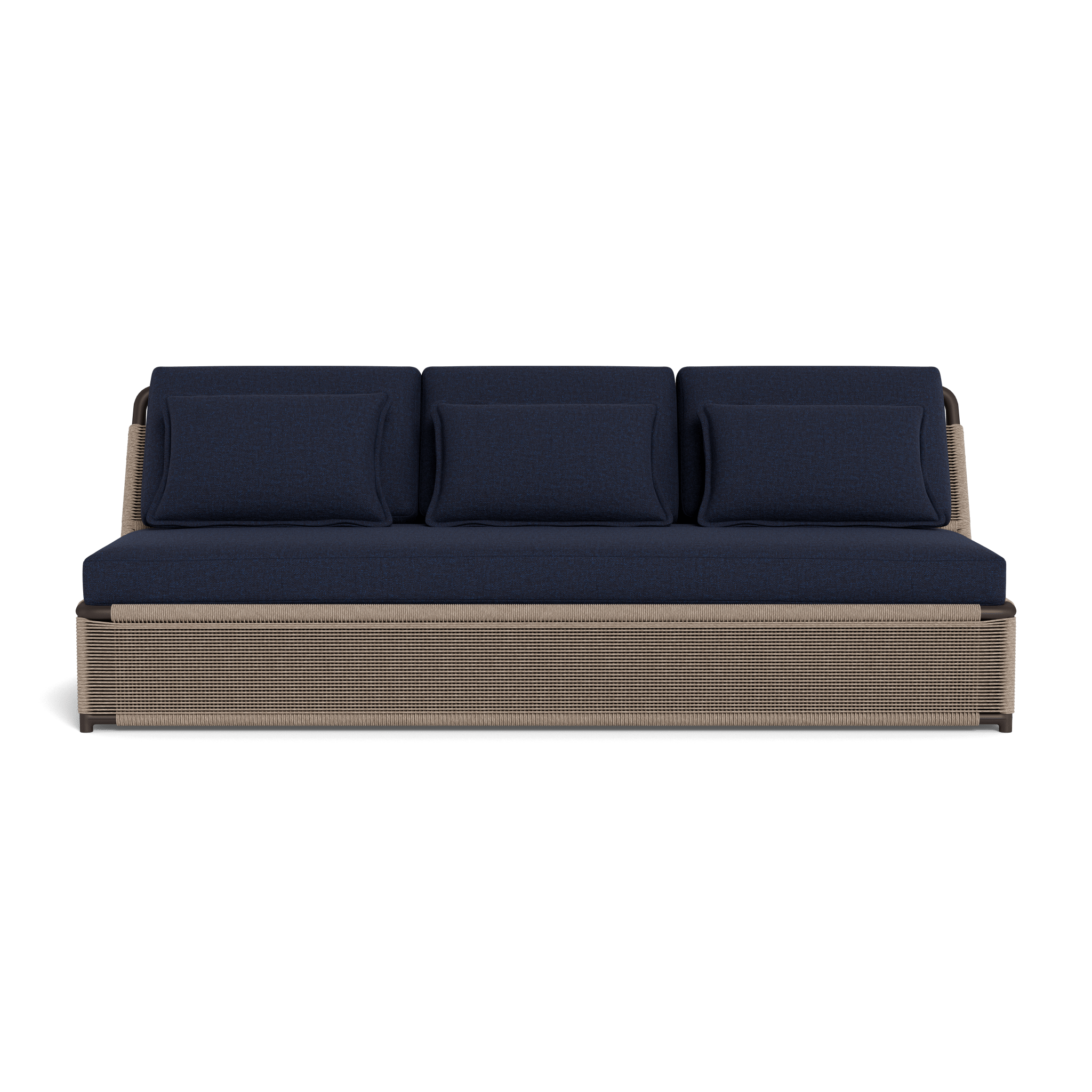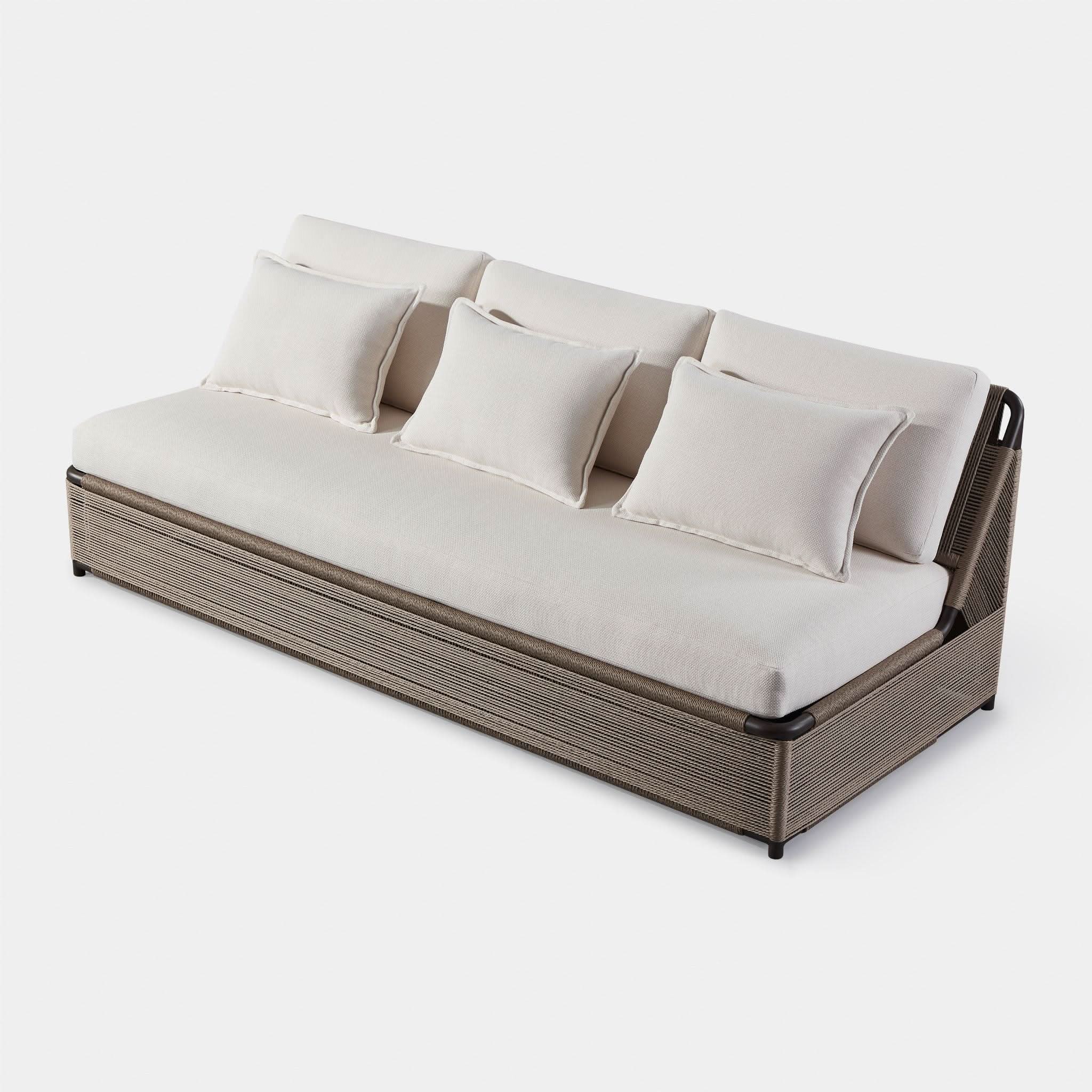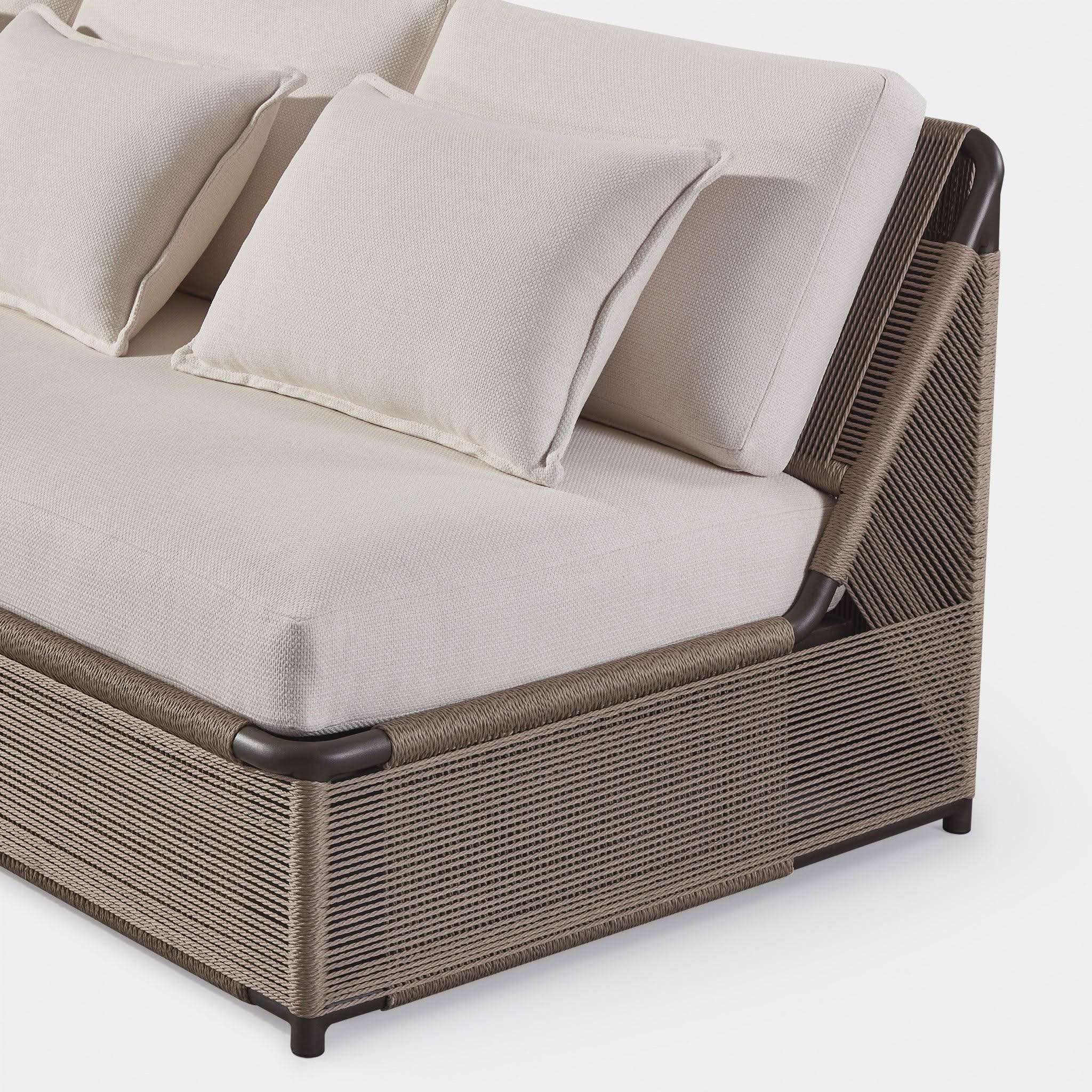 Designed by Kara Mann. Featuring exposed aluminum tube, twisted all-weather rope and deep green marble, our Formentera collection is organic luxury. The Formentera 3 Seat Armless Sofa transforms traditional aesthetics for a coastal lifestyle — enjoy outdoor cushions with extra Dacron for a plush appearance and lumbar support on an angled silhouette of tubular extruded aluminum, powder coated in bronze and hand woven with all-weather rope in our workshop. The rope features a twisted detail that recalls functional nautical ropes. Contemporary in proportion, this armless piece offers ease of use and bold shapes. Also available as a 2 Seat Armless Sofa and Lounge Chair.