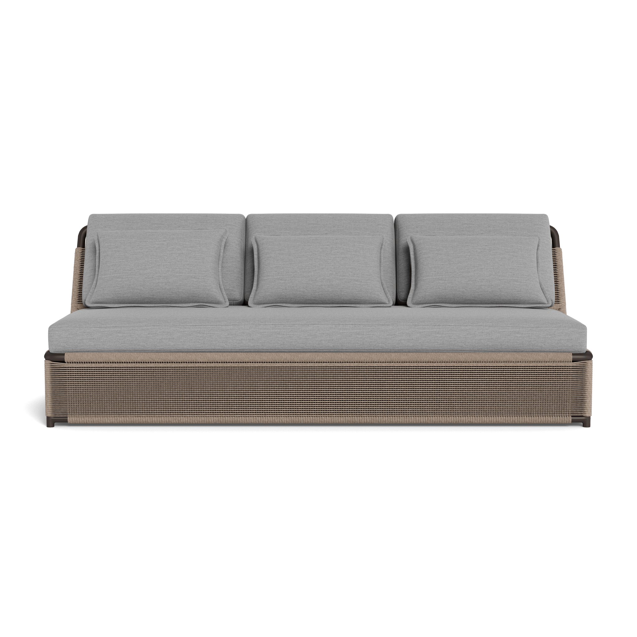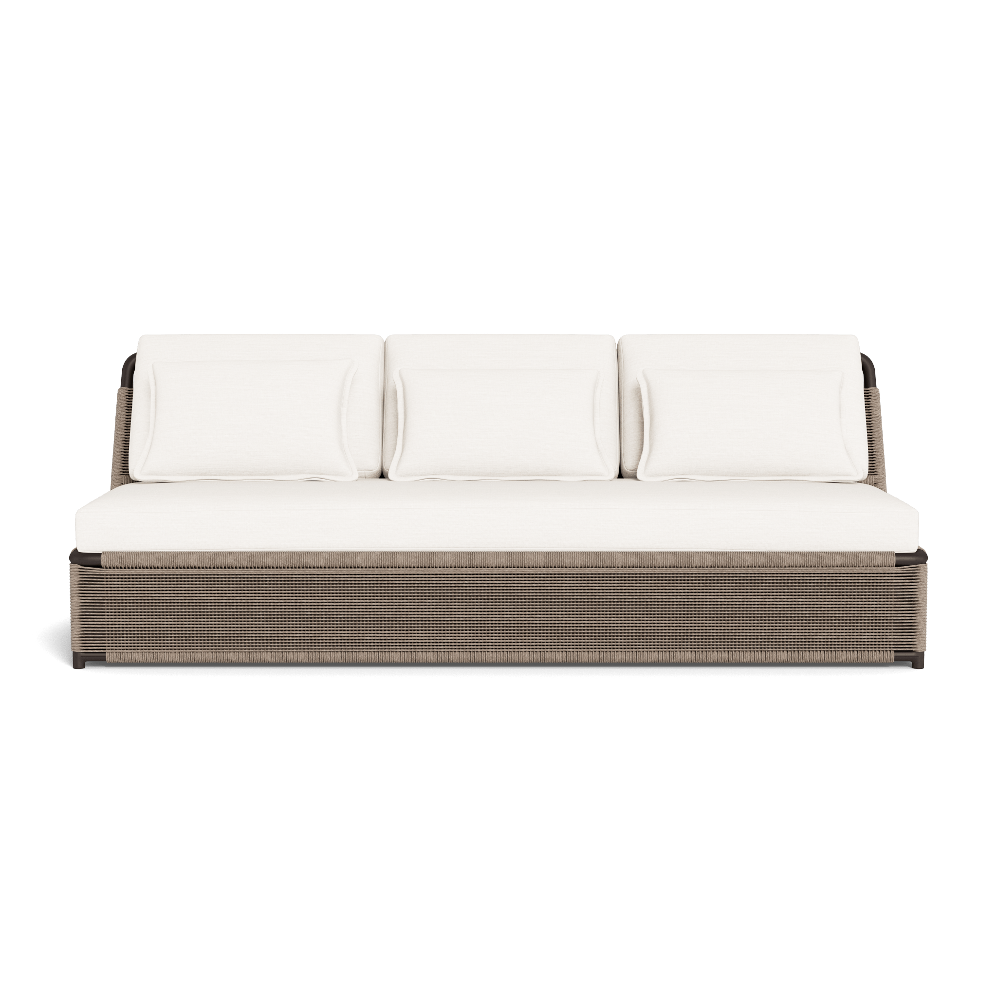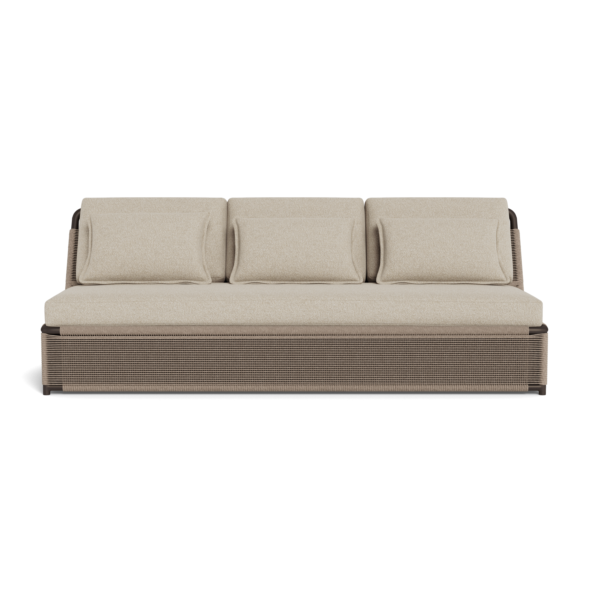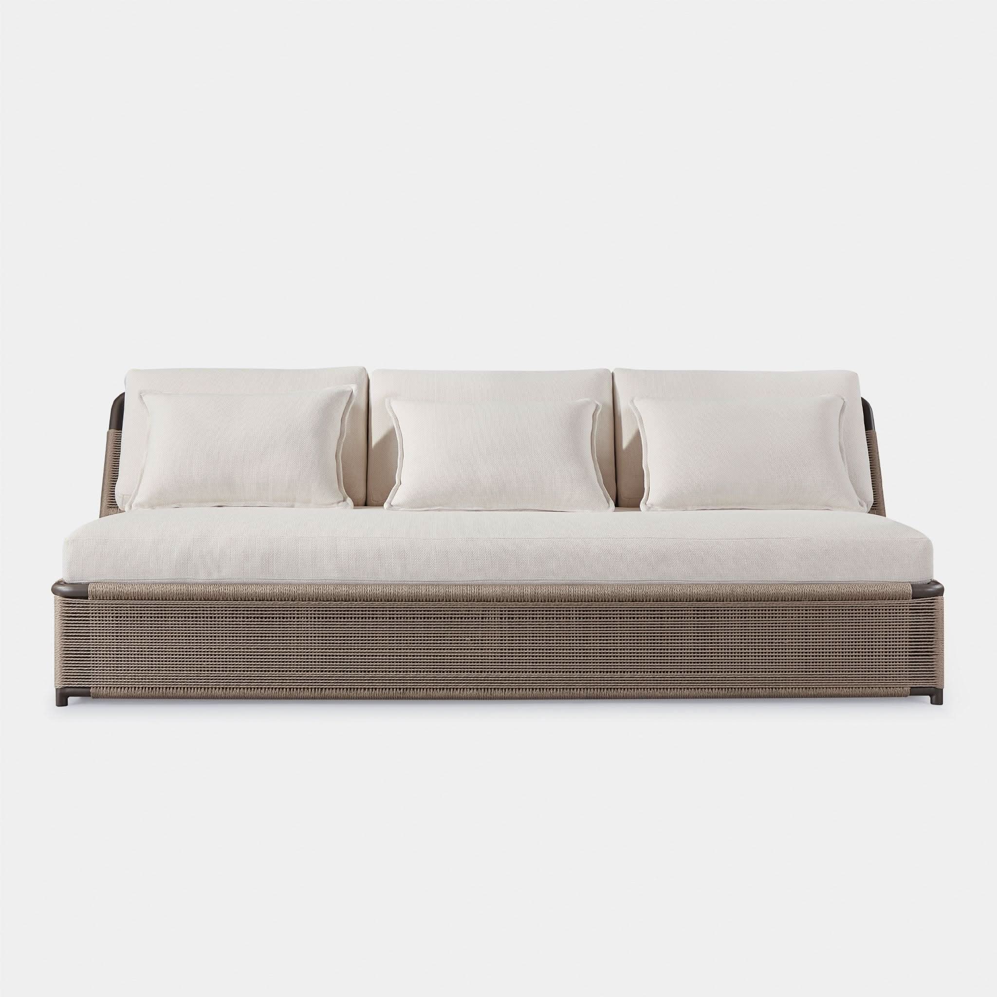 Designed by Kara Mann. Featuring exposed aluminum tube, twisted all-weather rope and deep green marble, our Formentera collection is organic luxury. The Formentera 3 Seat Armless Sofa transforms traditional aesthetics for a coastal lifestyle — enjoy outdoor cushions with extra Dacron for a plush appearance and lumbar support on an angled silhouette of tubular extruded aluminum, powder coated in bronze and hand woven with all-weather rope in our workshop. The rope features a twisted detail that recalls functional nautical ropes. Contemporary in proportion, this armless piece offers ease of use and bold shapes. Also available as a 2 Seat Armless Sofa and Lounge Chair.