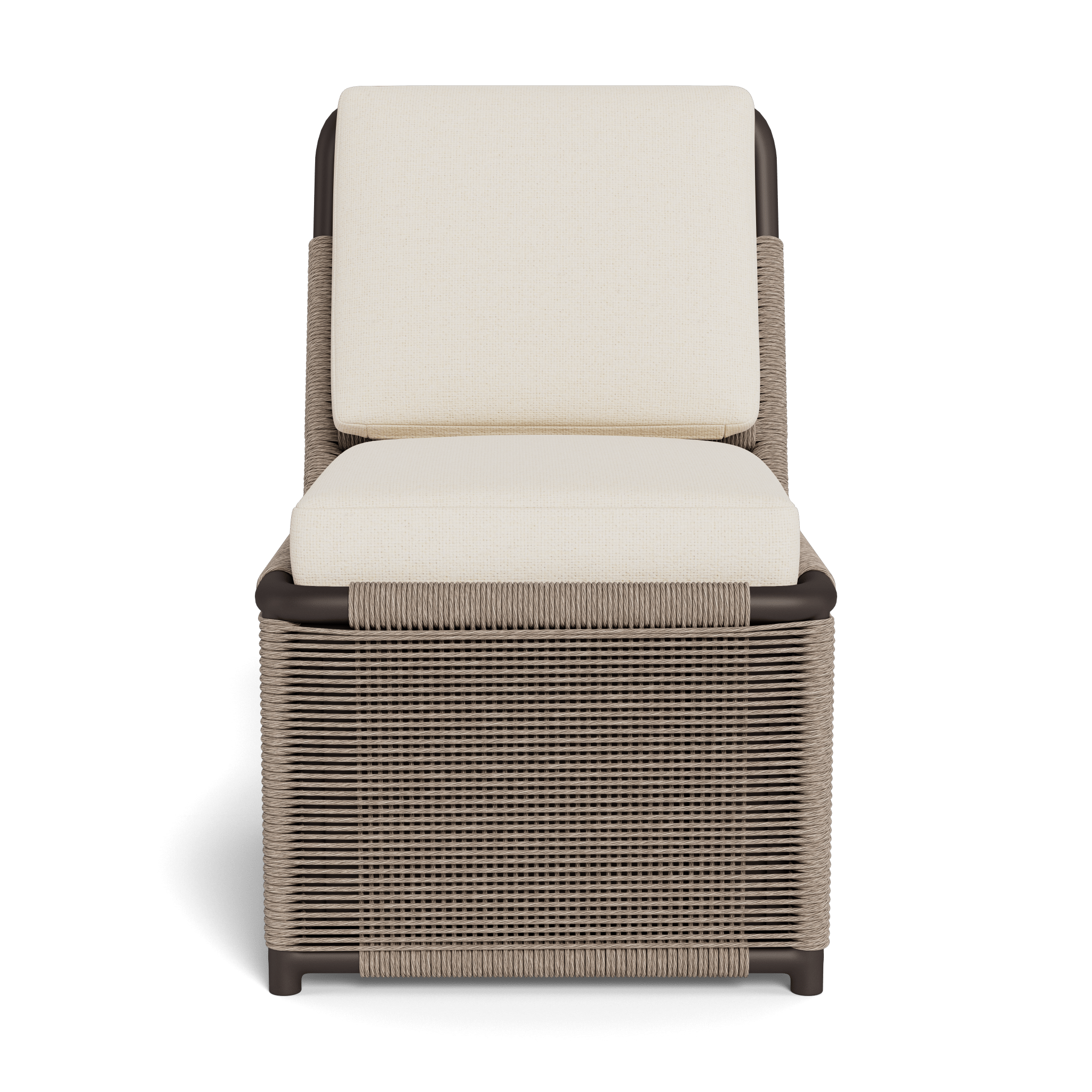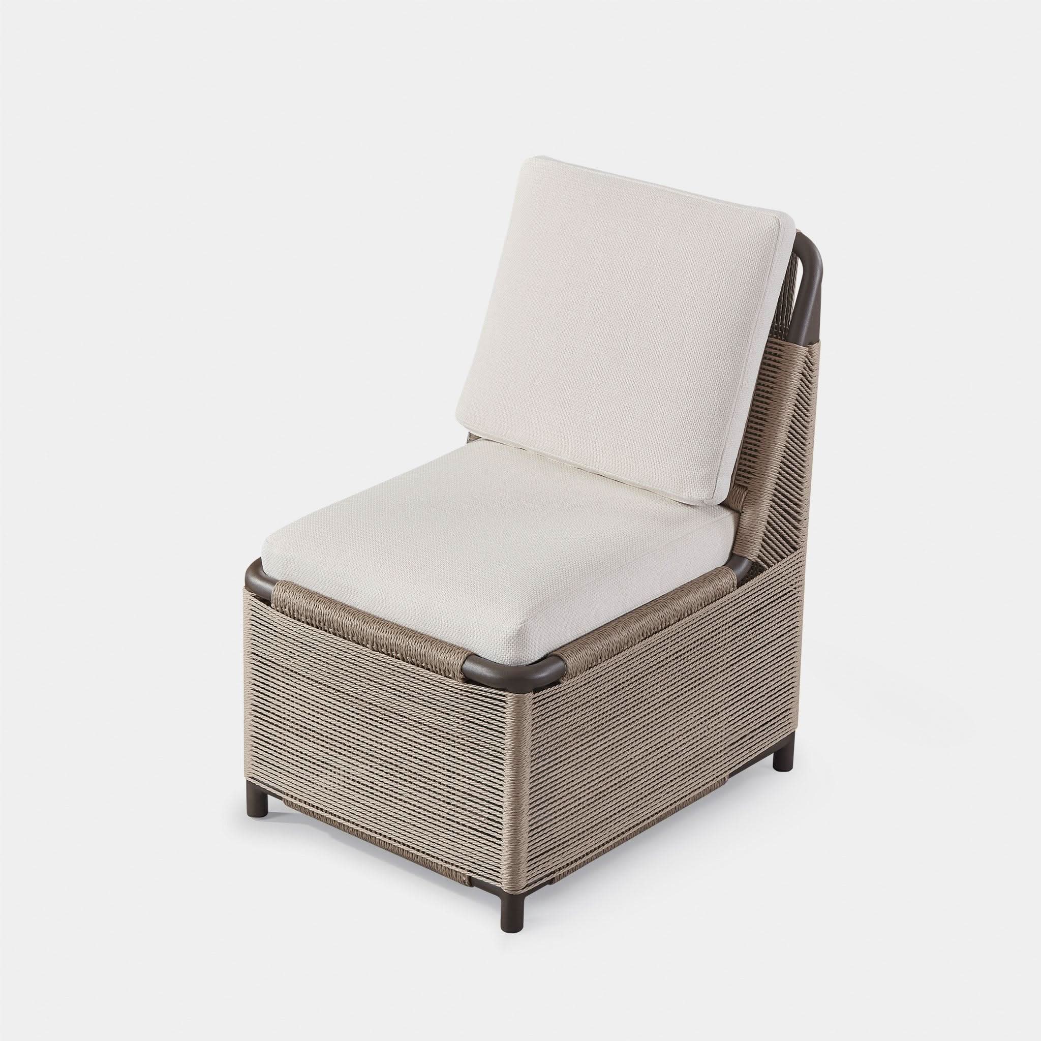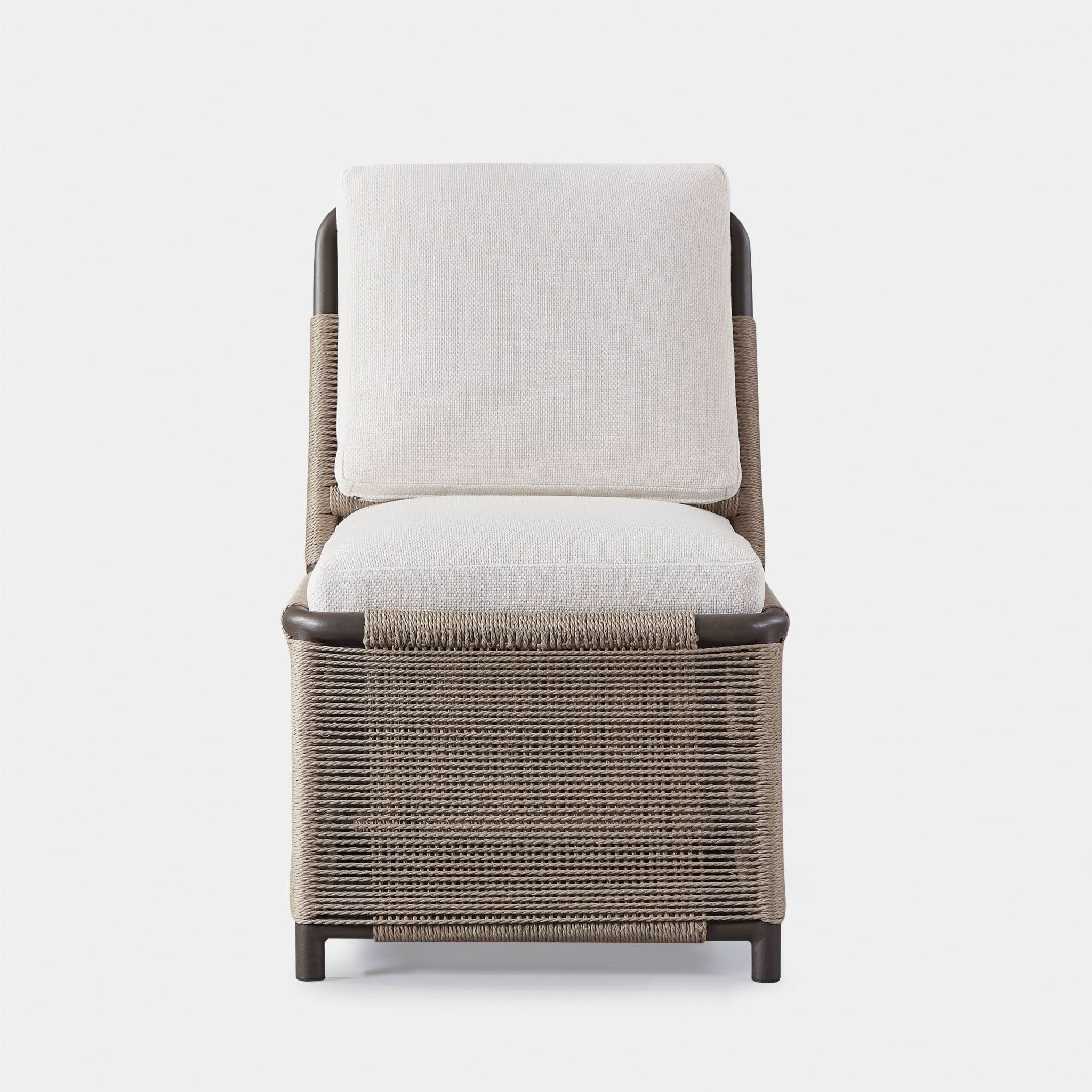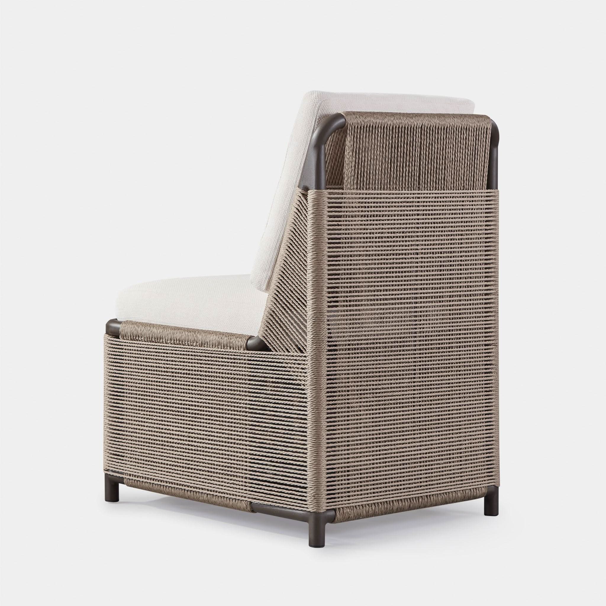 Designed by Kara Mann. Featuring exposed aluminum tube, twisted all-weather rope and deep green marble, our Formentera collection is organic luxury. Generous in scale and comfort, the Formentera Armless Dining Chair transforms traditional aesthetics for a coastal lifestyle — enjoy outdoor cushions with extra Dacron for a plush appearance framed by a relaxed pitched back of tubular extruded aluminum, powder coated in bronze and hand woven with all-weather rope in our workshop. The rope features a twisted detail that recalls functional nautical ropes. Contemporary in proportion, this armless piece offers ease of use and a striking silhouette.