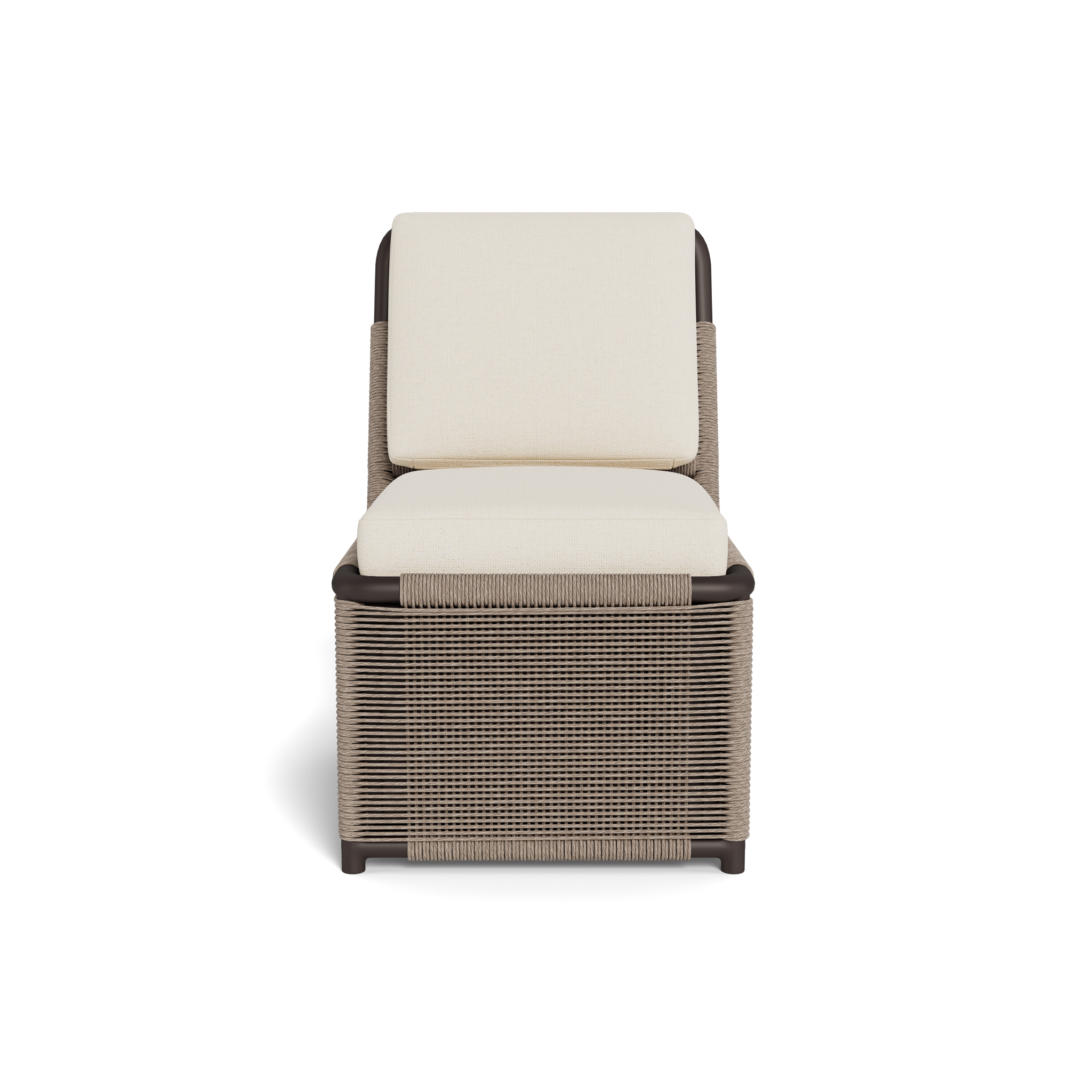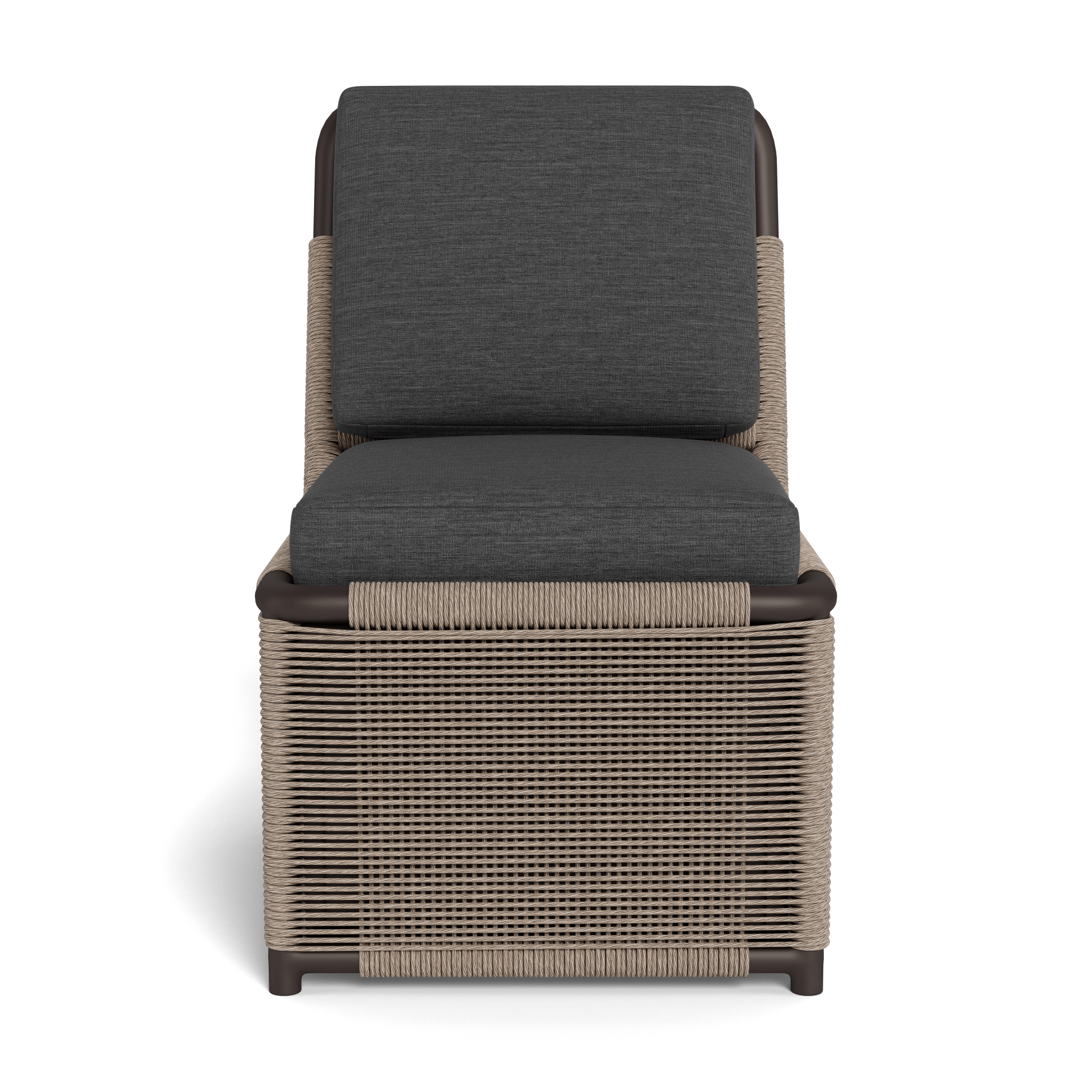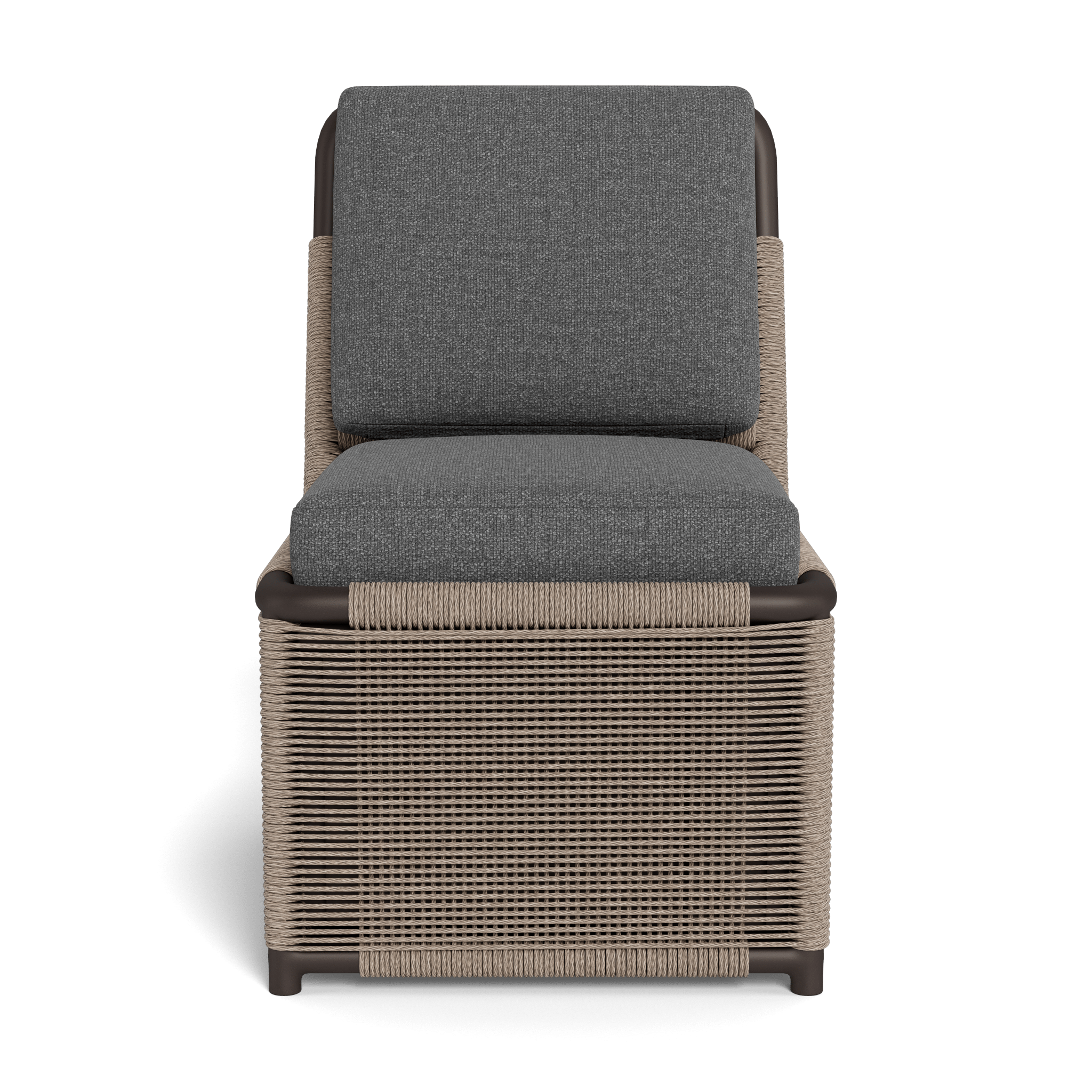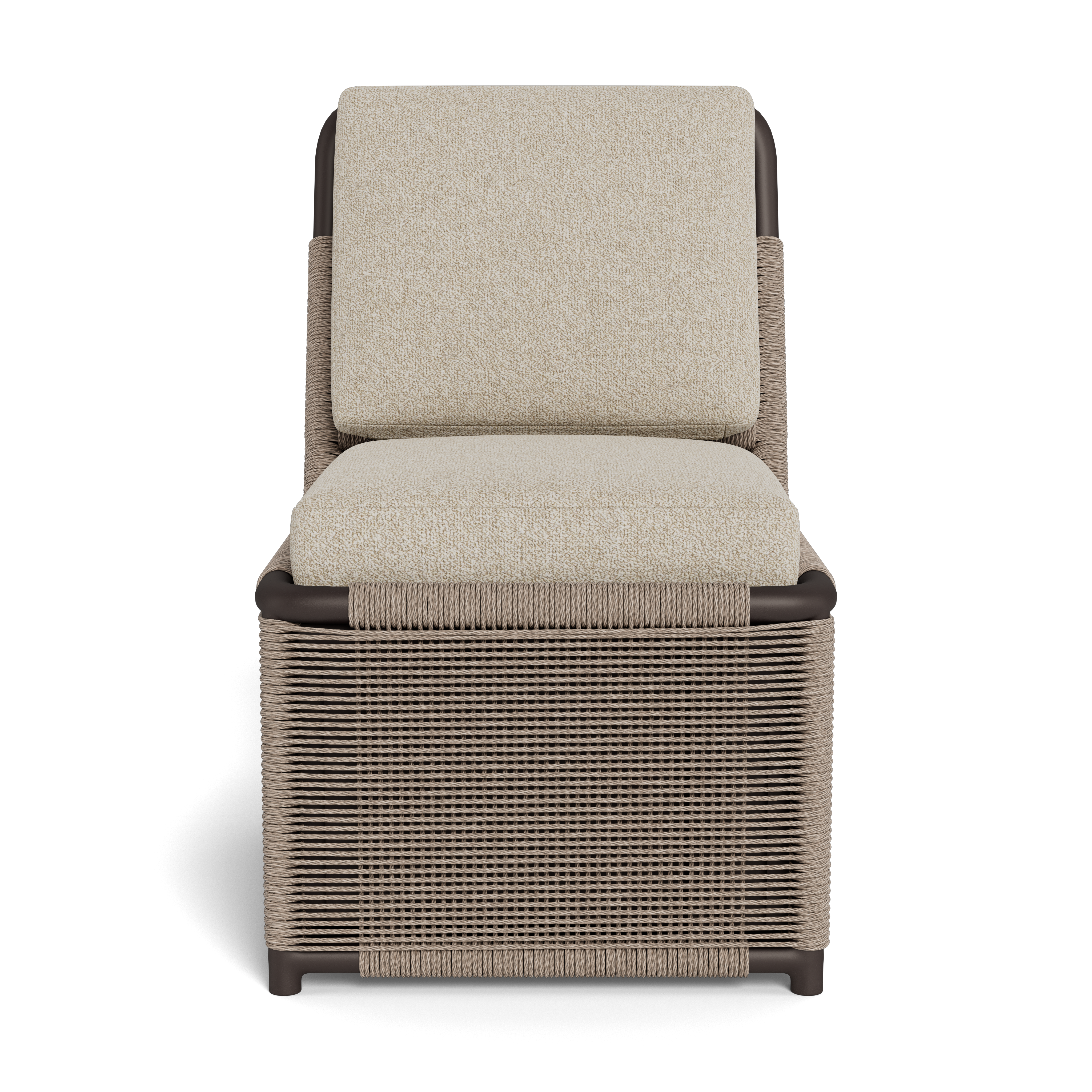 Designed by Kara Mann. Featuring exposed aluminum tube, twisted all-weather rope and deep green marble, our Formentera collection is organic luxury. Generous in scale and comfort, the Formentera Armless Dining Chair transforms traditional aesthetics for a coastal lifestyle — enjoy outdoor cushions with extra Dacron for a plush appearance framed by a relaxed pitched back of tubular extruded aluminum, powder coated in bronze and hand woven with all-weather rope in our workshop. The rope features a twisted detail that recalls functional nautical ropes. Contemporary in proportion, this armless piece offers ease of use and a striking silhouette.