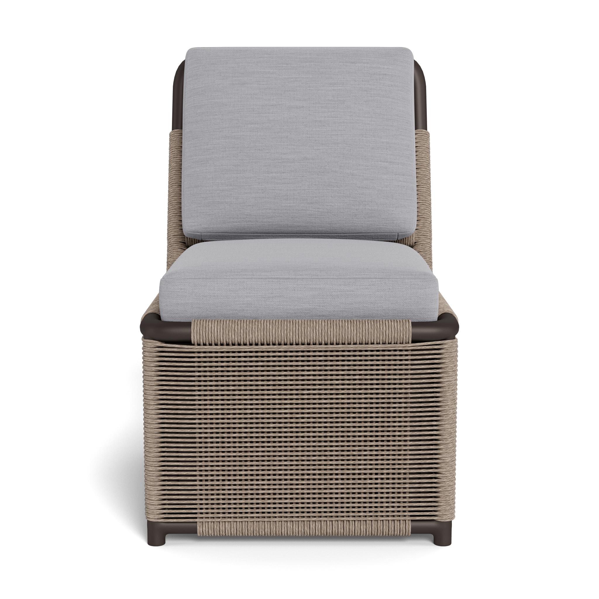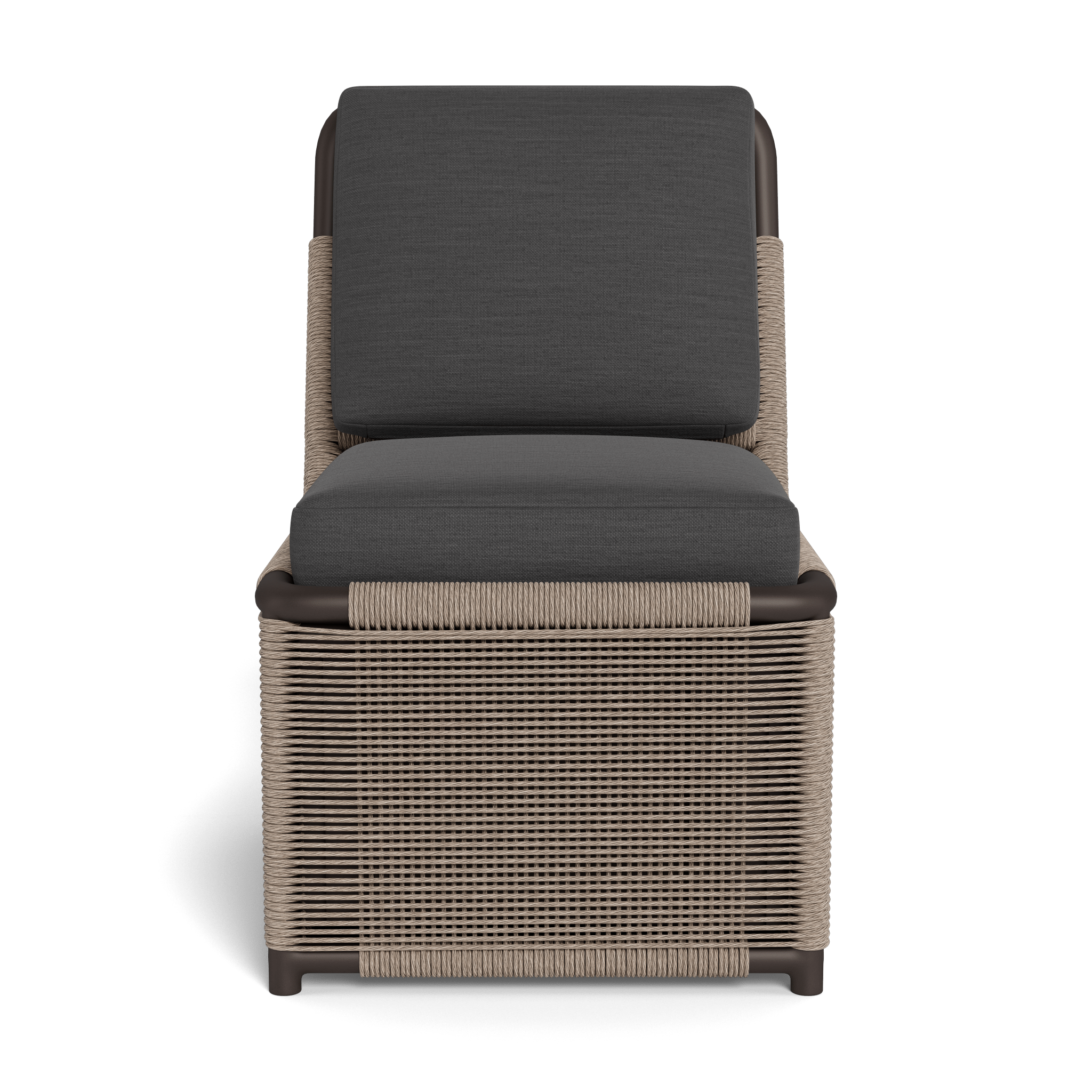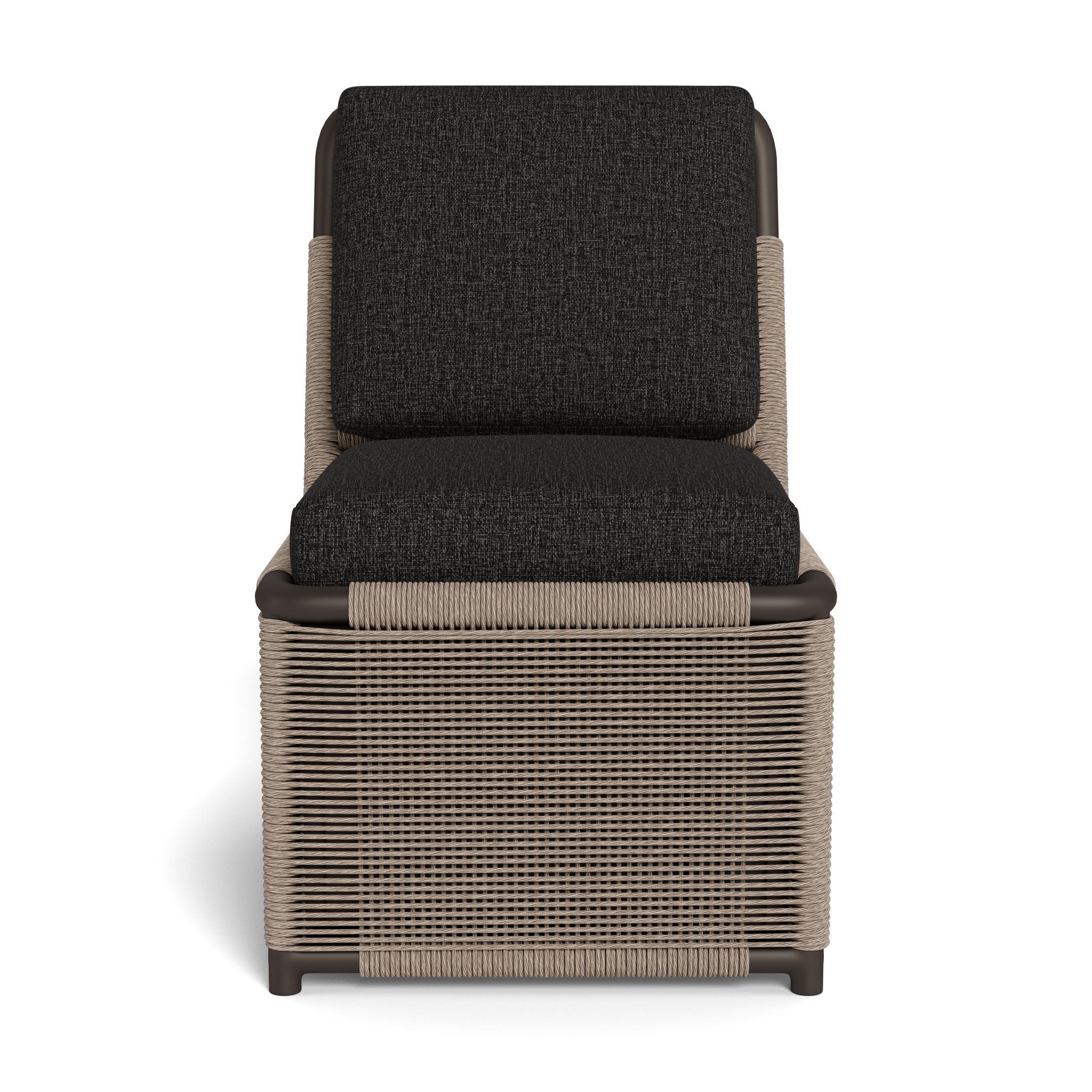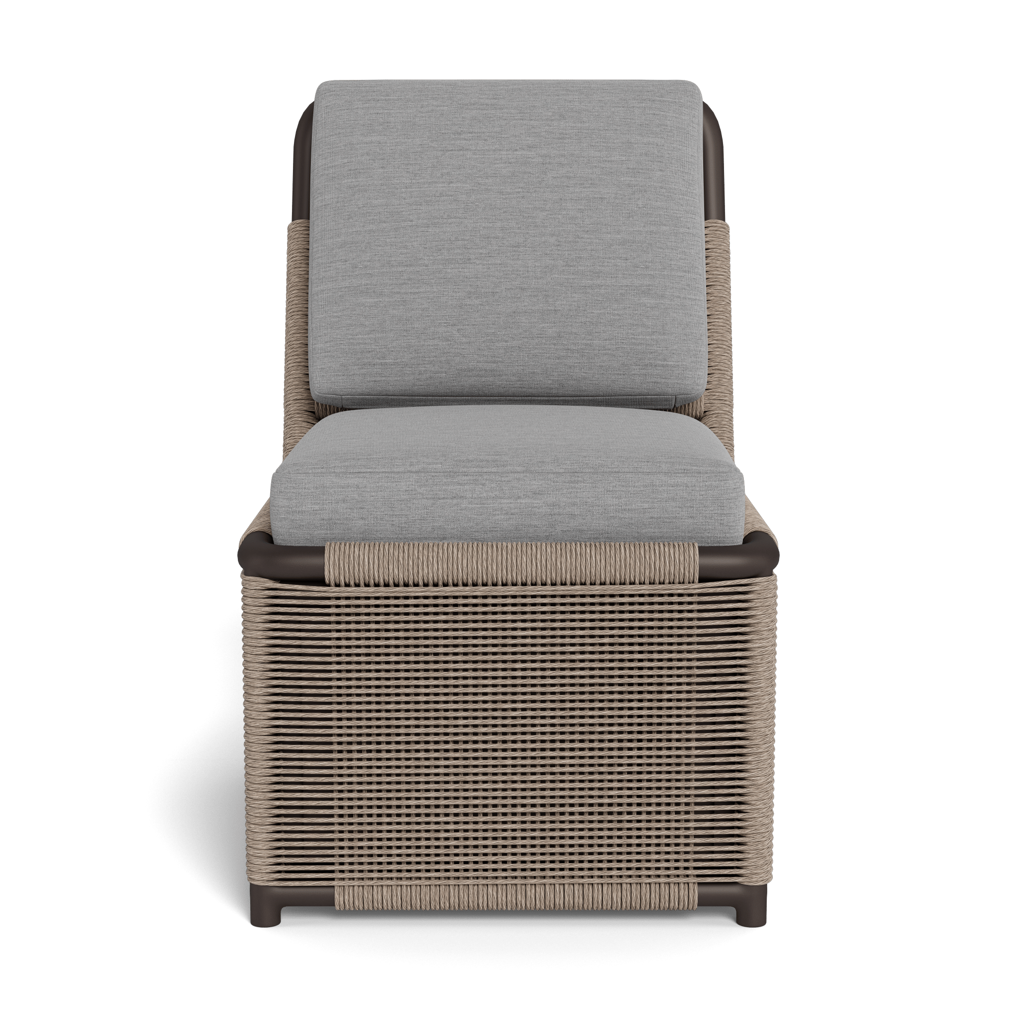Designed by Kara Mann. Featuring exposed aluminum tube, twisted all-weather rope and deep green marble, our Formentera collection is organic luxury. Generous in scale and comfort, the Formentera Armless Dining Chair transforms traditional aesthetics for a coastal lifestyle — enjoy outdoor cushions with extra Dacron for a plush appearance framed by a relaxed pitched back of tubular extruded aluminum, powder coated in bronze and hand woven with all-weather rope in our workshop. The rope features a twisted detail that recalls functional nautical ropes. Contemporary in proportion, this armless piece offers ease of use and a striking silhouette.
