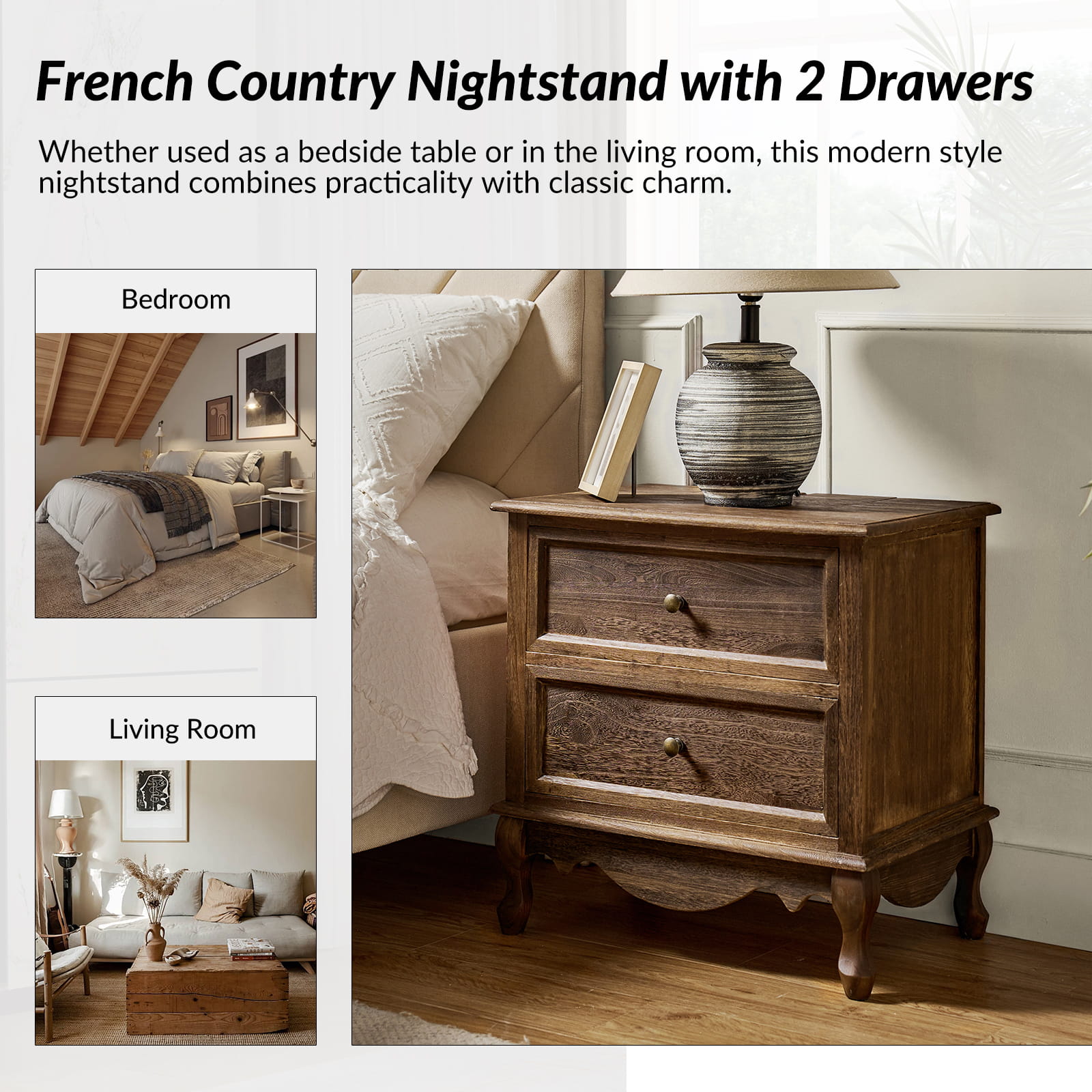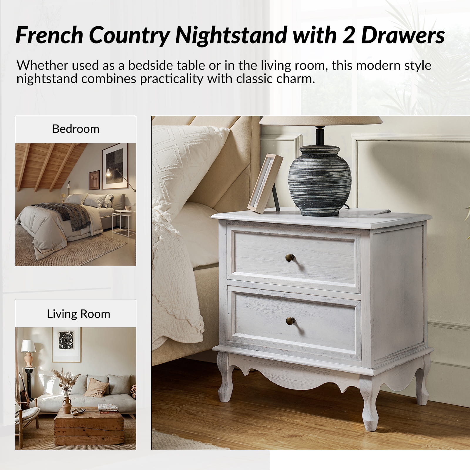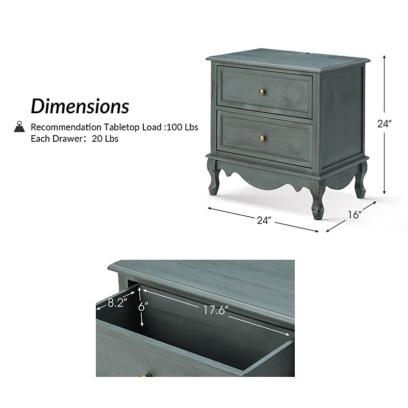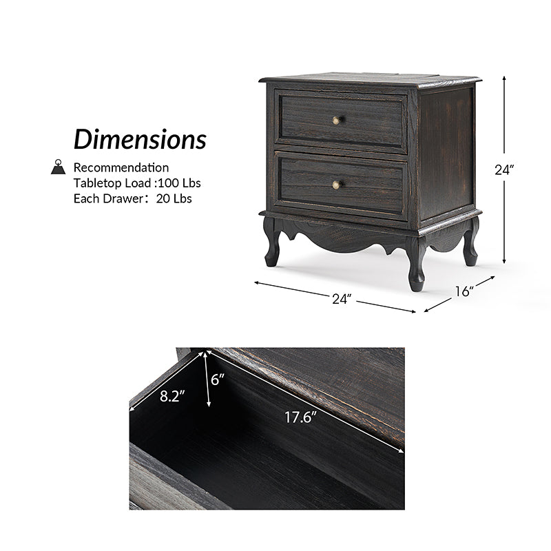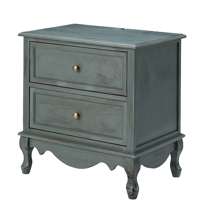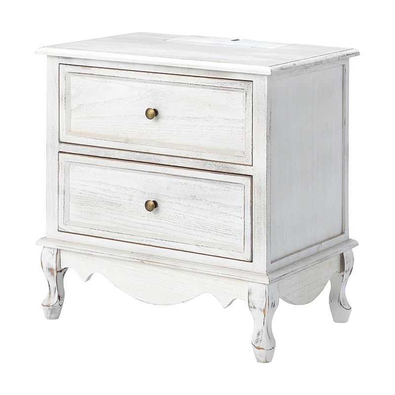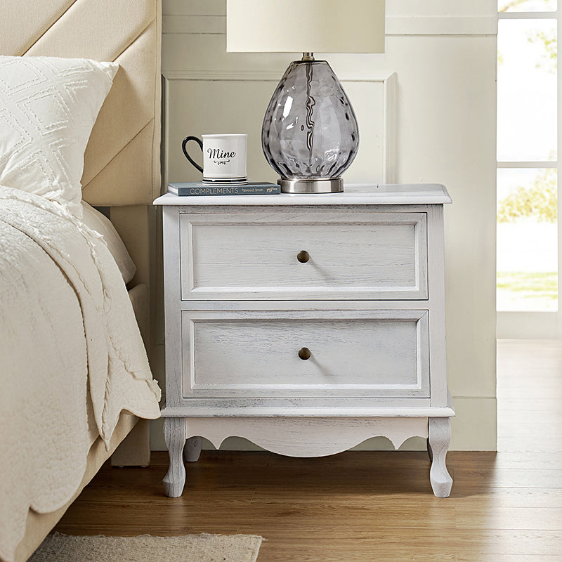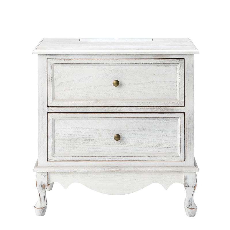 A marriage of comfortable experience and transitional style, this French country nightstand finished in a stylish yet glamorous profile is a good addition to elevating elegance. The nightstand includes 2 convenient and practical drawers with smooth metal drawer slides and durable metal handles. The top of the nightstand has a charging station space where you can charge your electronics and also manage your cords, helping you with annoying wires for a neater and more aesthetically pleasing look. Featuring a manufactured frame finished in a glamorous hue for perfect stability and durability, this reliable design can accompany you for a long time and share. Made of a high-quality wood frame, this sturdy frame showcases sleek lines and boasts a geometric shape, adding a striking look to your room. Wake up your style with this chic nightstand and put some sophistication into your daily routine, from the bedroom to the living space.