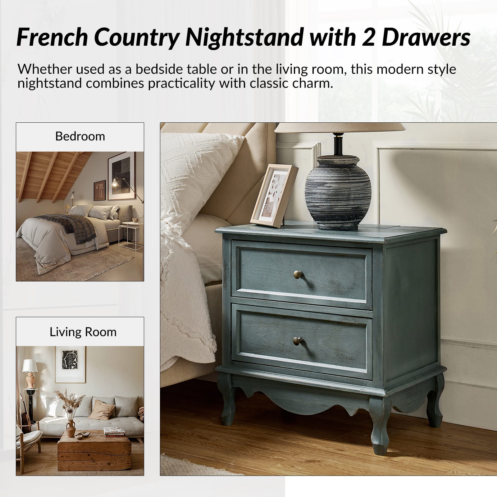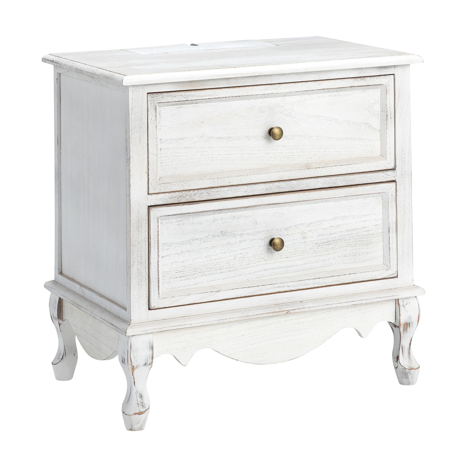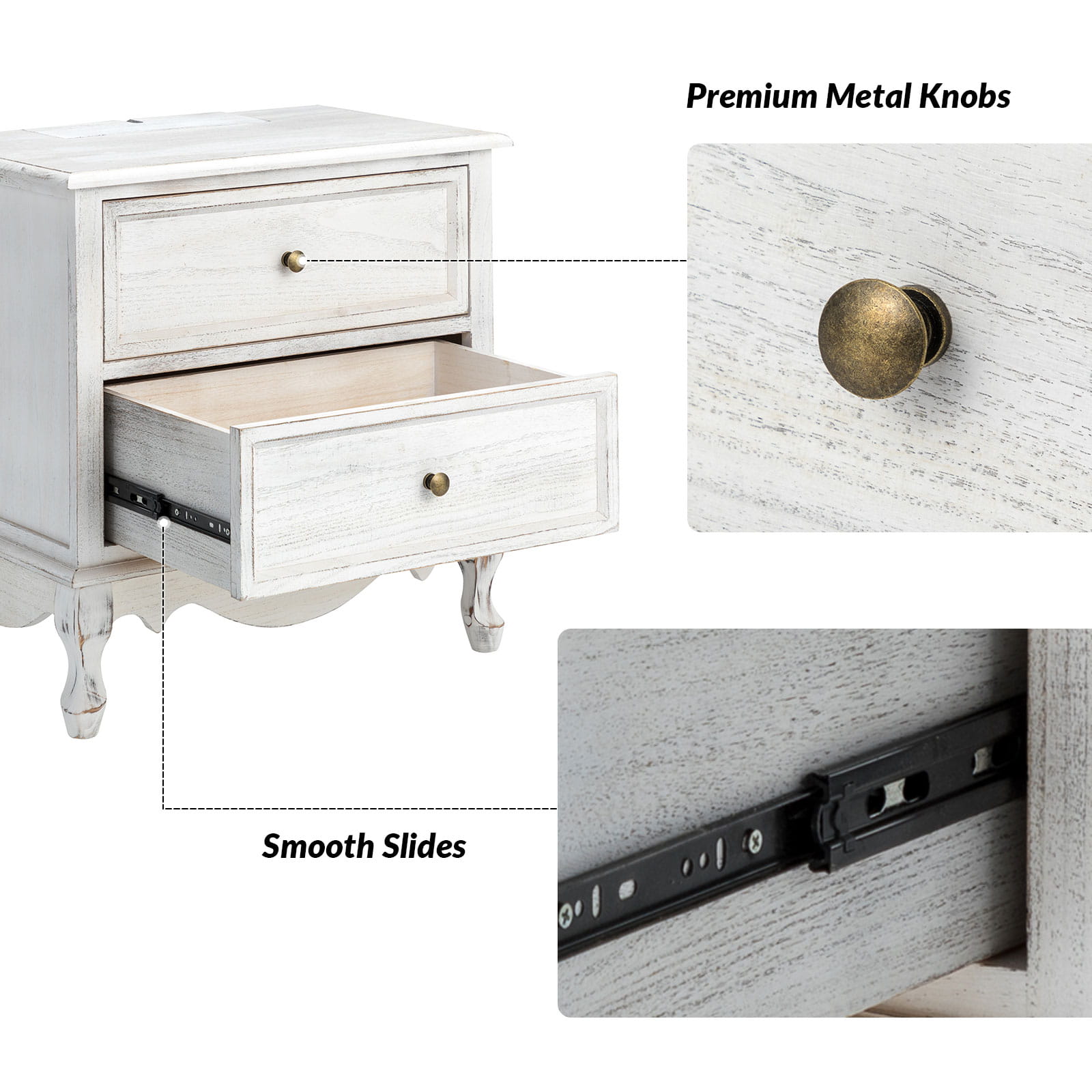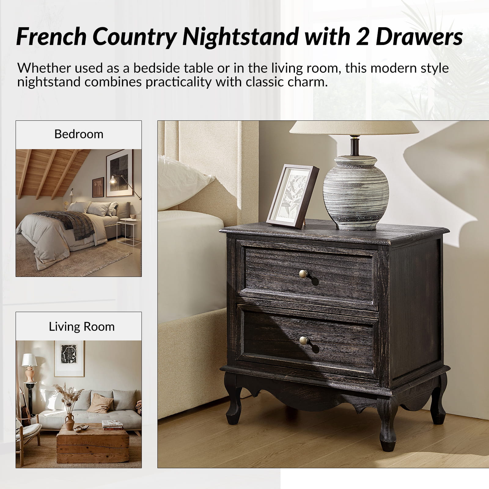 A marriage of comfortable experience and transitional style, this French country nightstand finished in a stylish yet glamorous profile is a good addition to elevating elegance. The nightstand includes 2 convenient and practical drawers with smooth metal drawer slides and durable metal handles. The top of the nightstand has a charging station space where you can charge your electronics and also manage your cords, helping you with annoying wires for a neater and more aesthetically pleasing look. Featuring a manufactured frame finished in a glamorous hue for perfect stability and durability, this reliable design can accompany you for a long time and share. Made of a high-quality wood frame, this sturdy frame showcases sleek lines and boasts a geometric shape, adding a striking look to your room. Wake up your style with this chic nightstand and put some sophistication into your daily routine, from the bedroom to the living space.