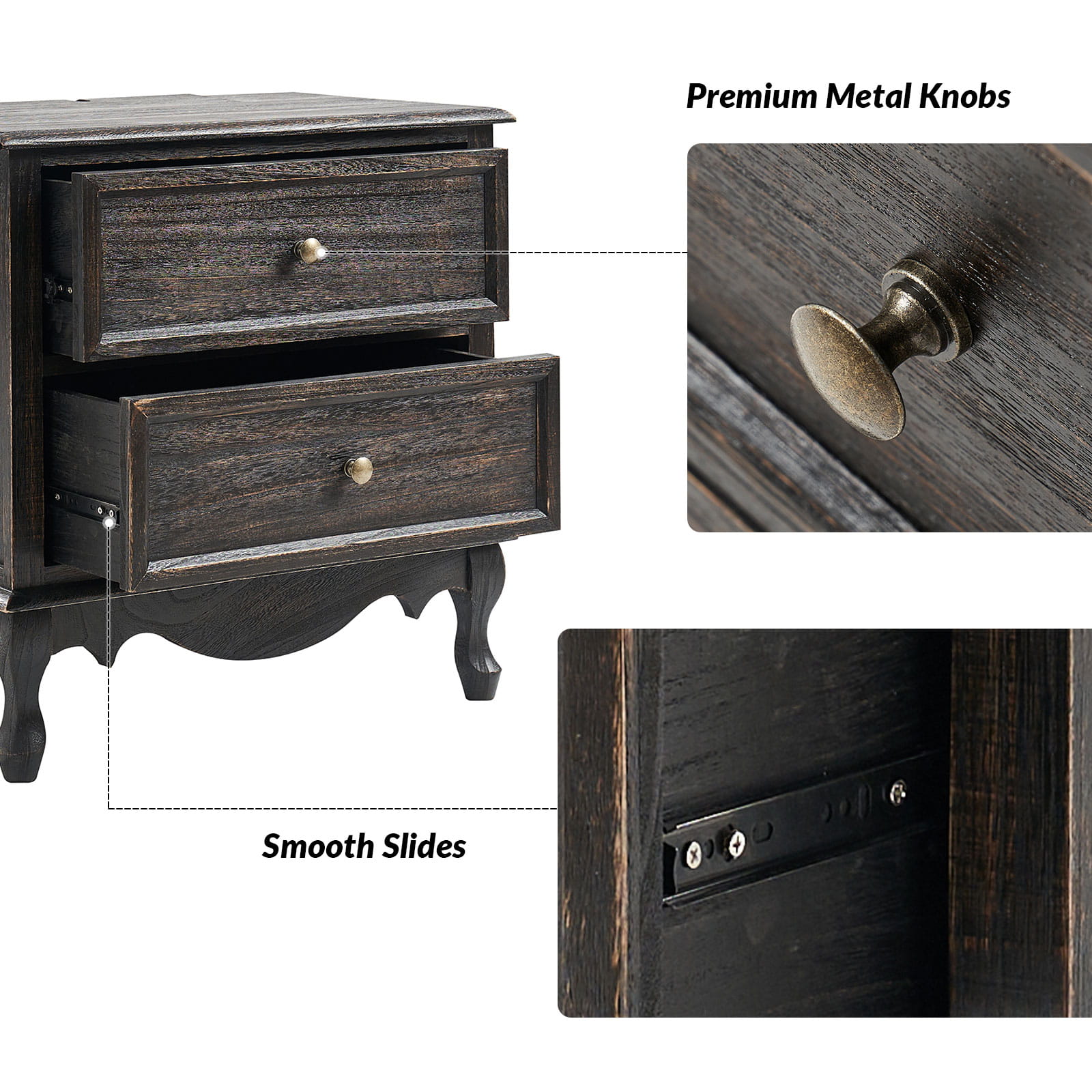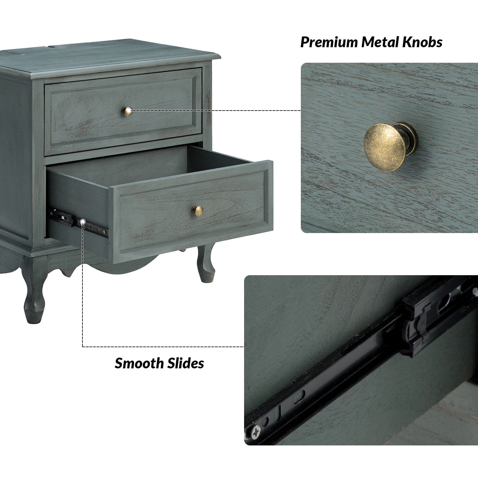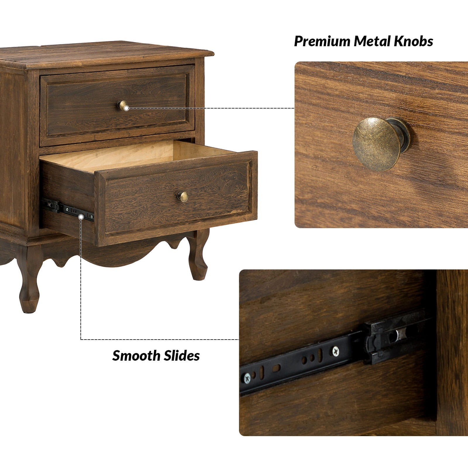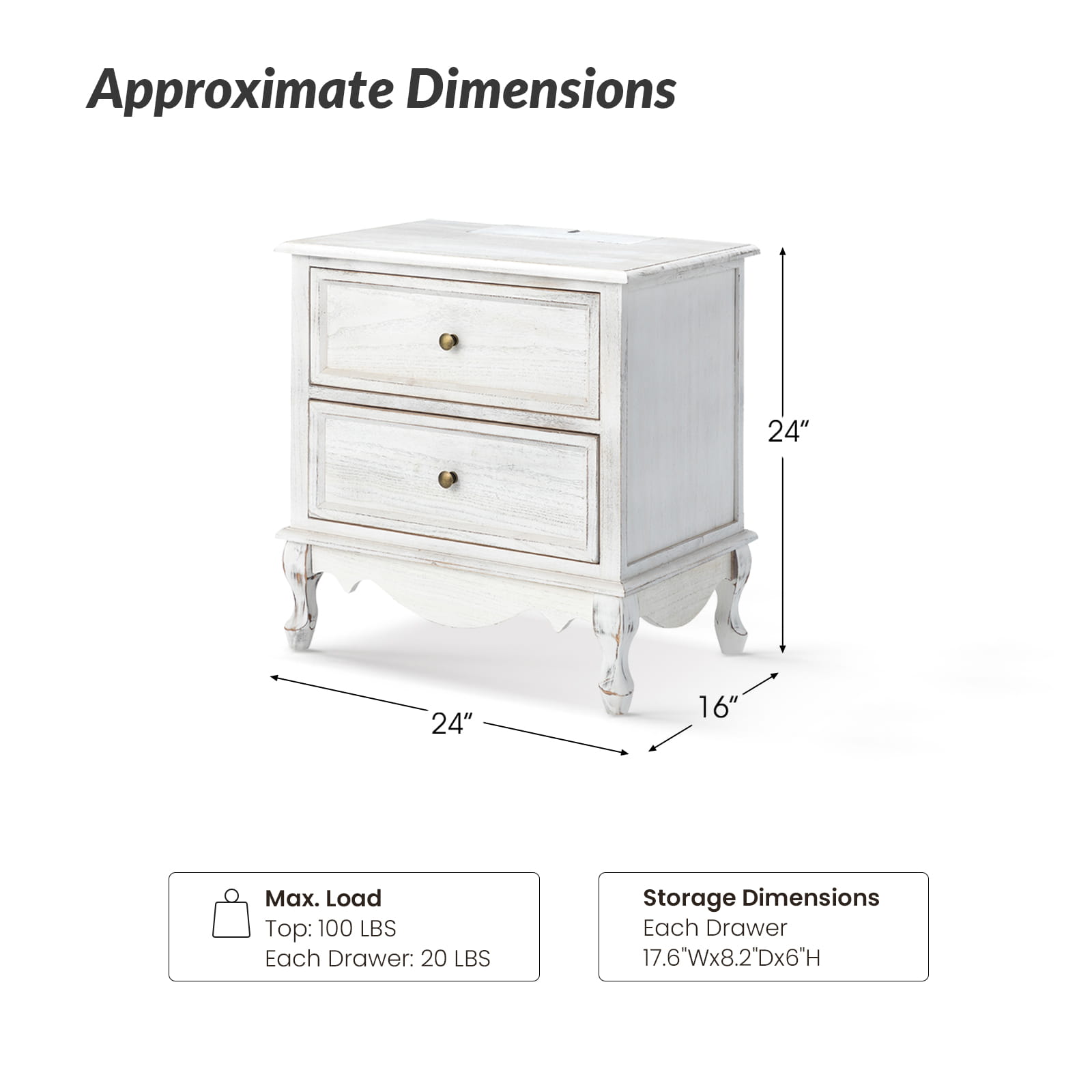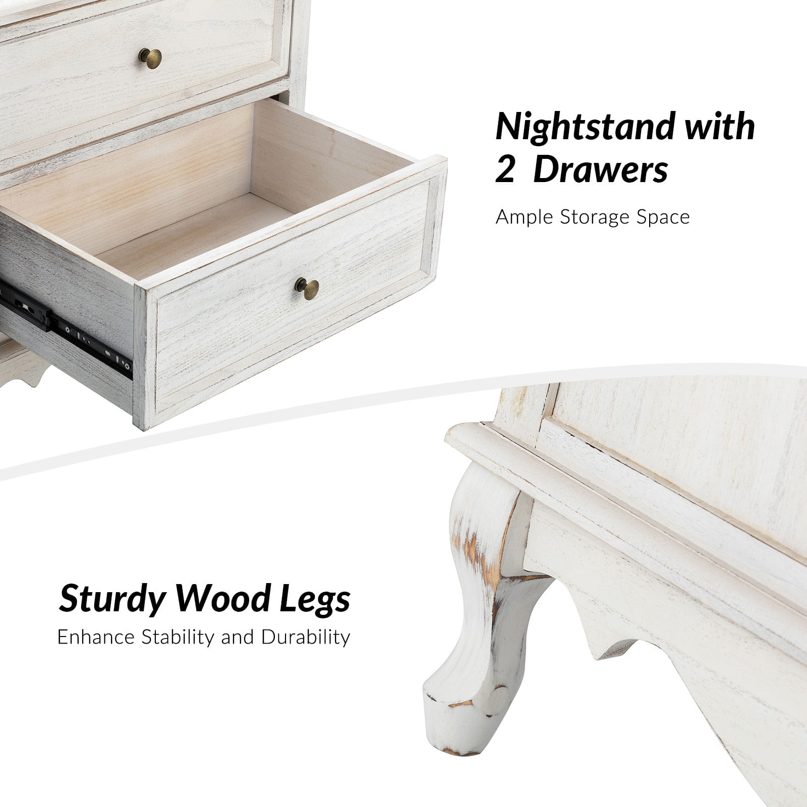 A marriage of comfortable experience and transitional style, this French country nightstand finished in a stylish yet glamorous profile is a good addition to elevating elegance. The nightstand includes 2 convenient and practical drawers with smooth metal drawer slides and durable metal handles. The top of the nightstand has a charging station space where you can charge your electronics and also manage your cords, helping you with annoying wires for a neater and more aesthetically pleasing look. Featuring a manufactured frame finished in a glamorous hue for perfect stability and durability, this reliable design can accompany you for a long time and share. Made of a high-quality wood frame, this sturdy frame showcases sleek lines and boasts a geometric shape, adding a striking look to your room. Wake up your style with this chic nightstand and put some sophistication into your daily routine, from the bedroom to the living space.