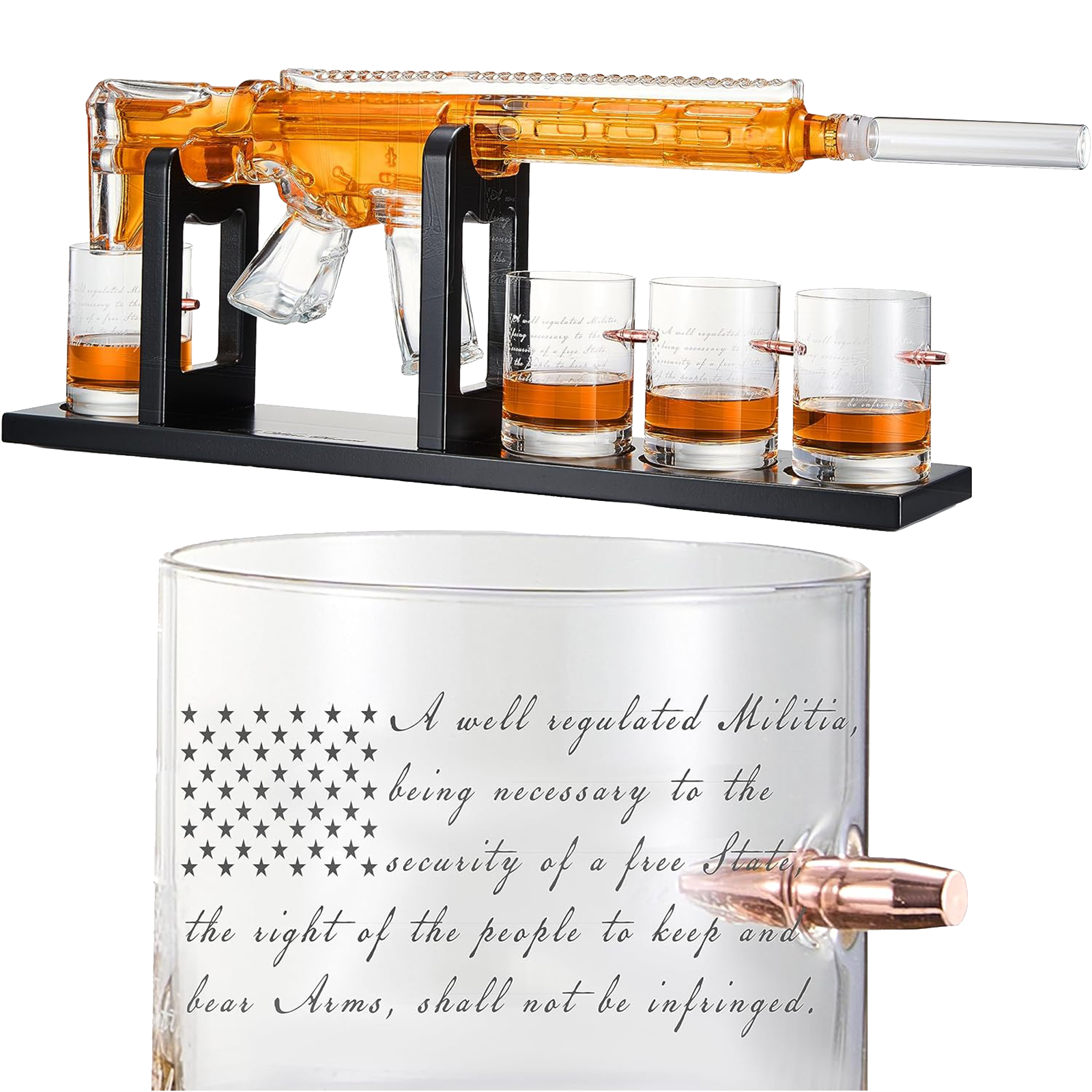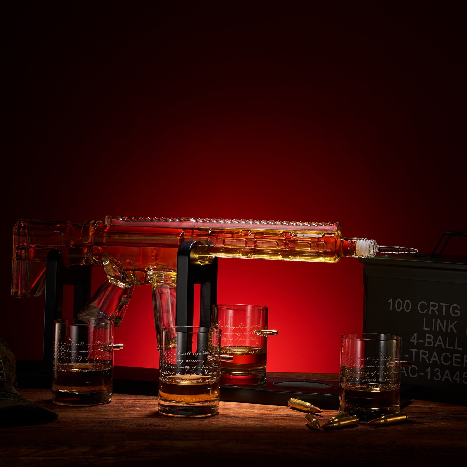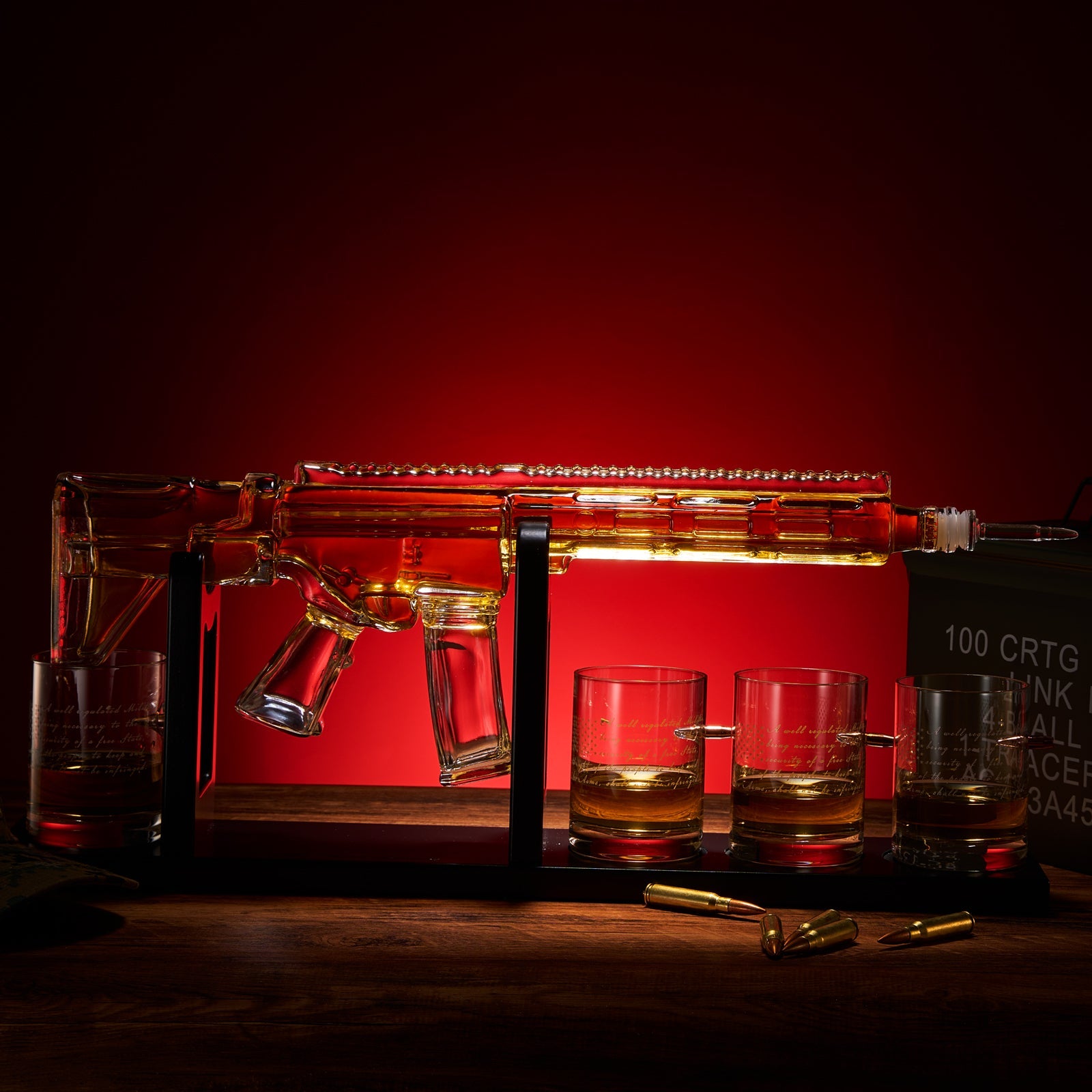 DRINKING WHISKEY WILL NEVER BE THE SAME: AR15 Gun Decanter & 4 Second Amendment whiskey glasses paired with a wooden display stand....