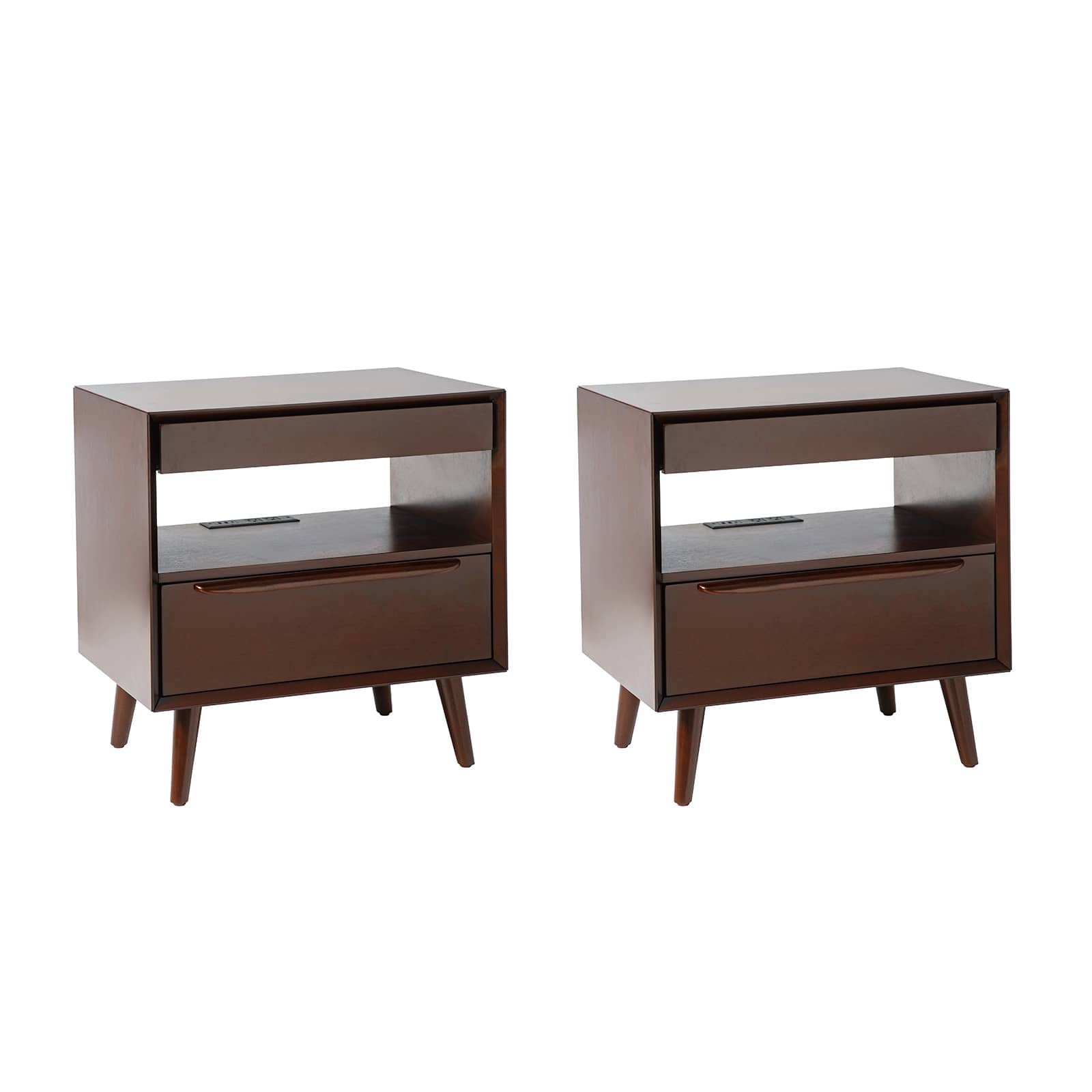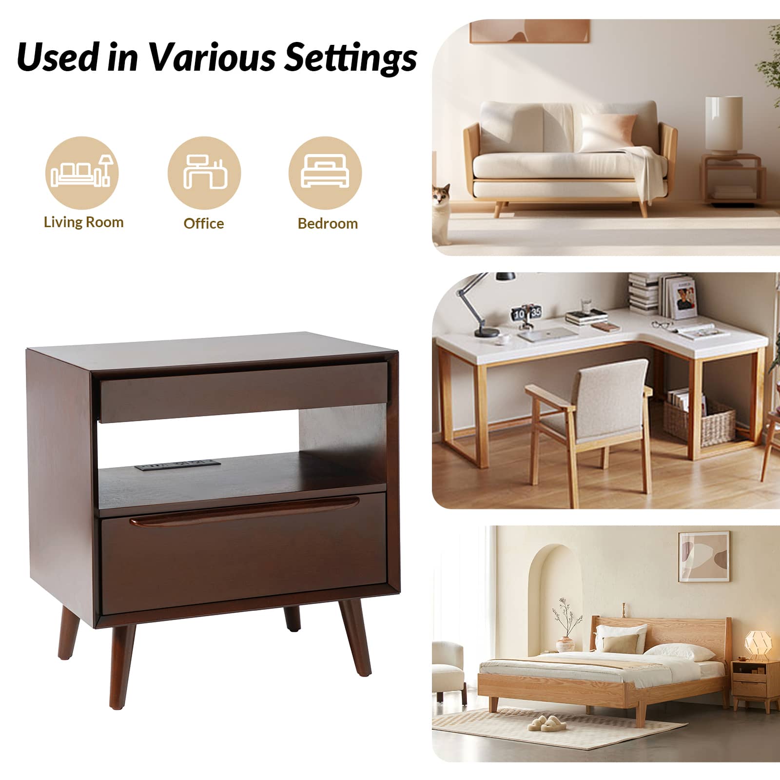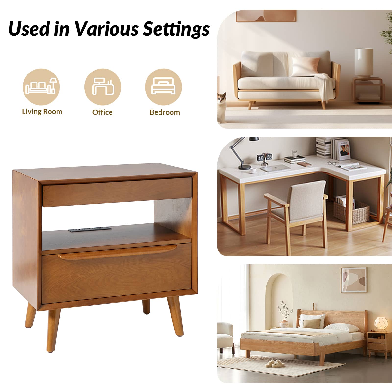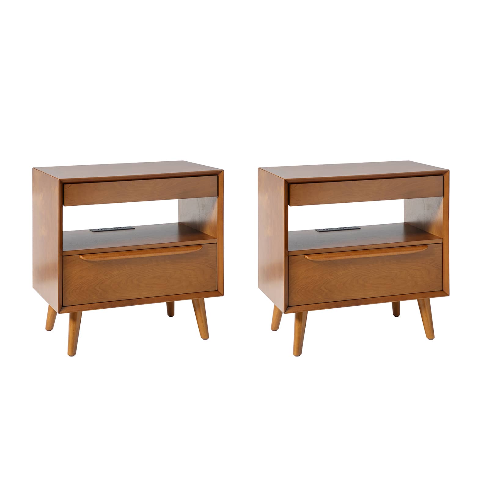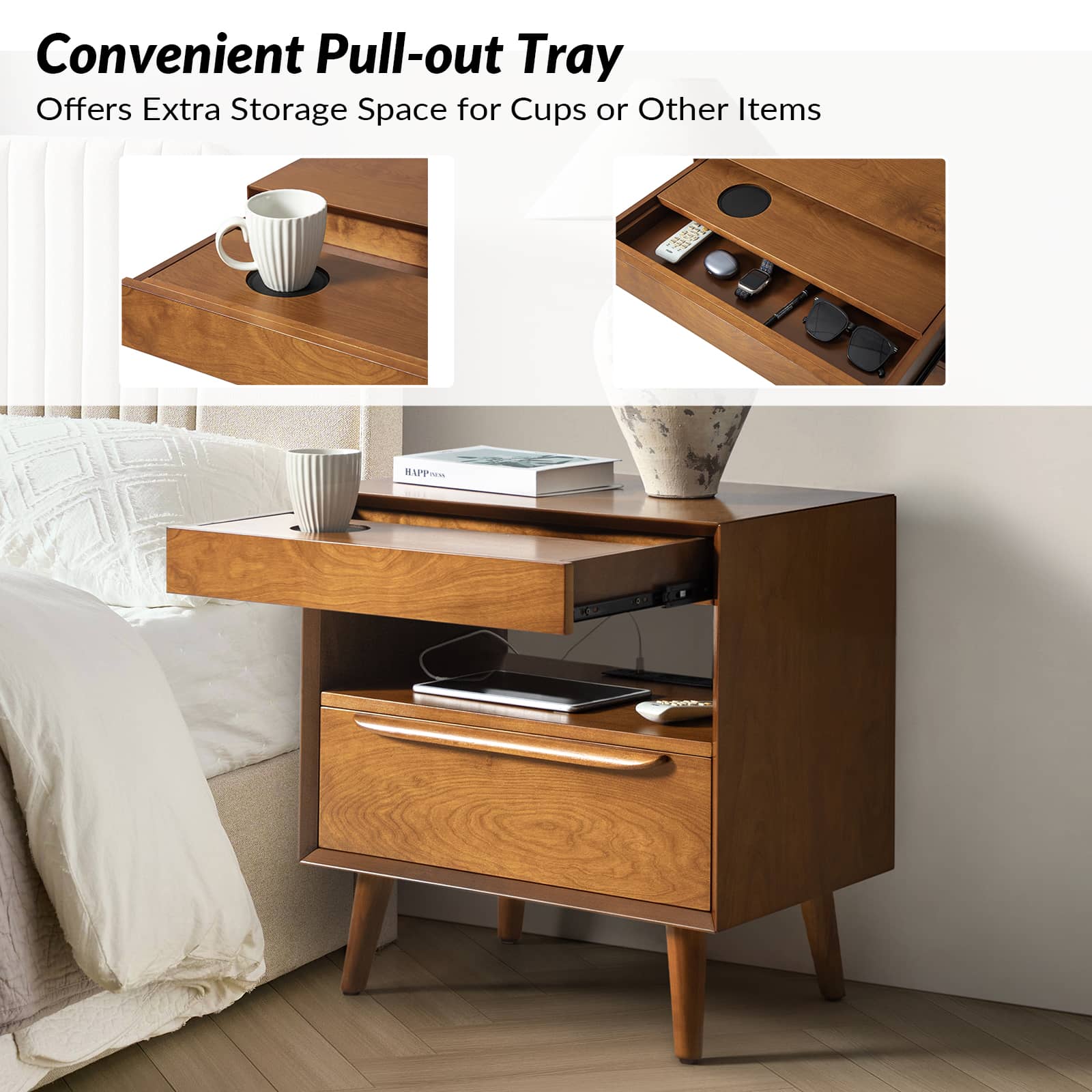 This mid-century modern 2-drawer nightstand is a versatile and stylish addition to your bedroom, study, or living room. The sleek design features wooden handles and flared legs, giving it a classic yet contemporary look. Each of the two drawers provides ample storage space for your items, keeping your room organized and clutter-free. A convenient pull-out tray is suitable for placing a cup, remote control, or other small items. This tray adds an extra layer of practicality, making it easy to keep frequently used items close at hand without cluttering the top surface. Plus, the nightstand includes a built-in charging station, allowing you to conveniently charge your devices overnight without the hassle of tangled cords. This mid-century modern nightstand seamlessly blends into various interior settings, offering both aesthetic appeal and everyday convenience.