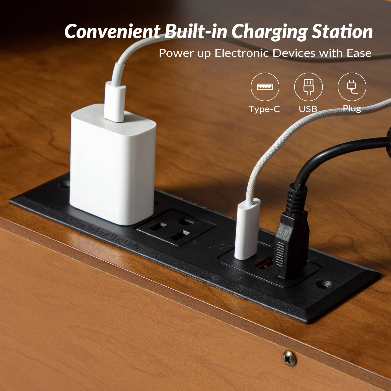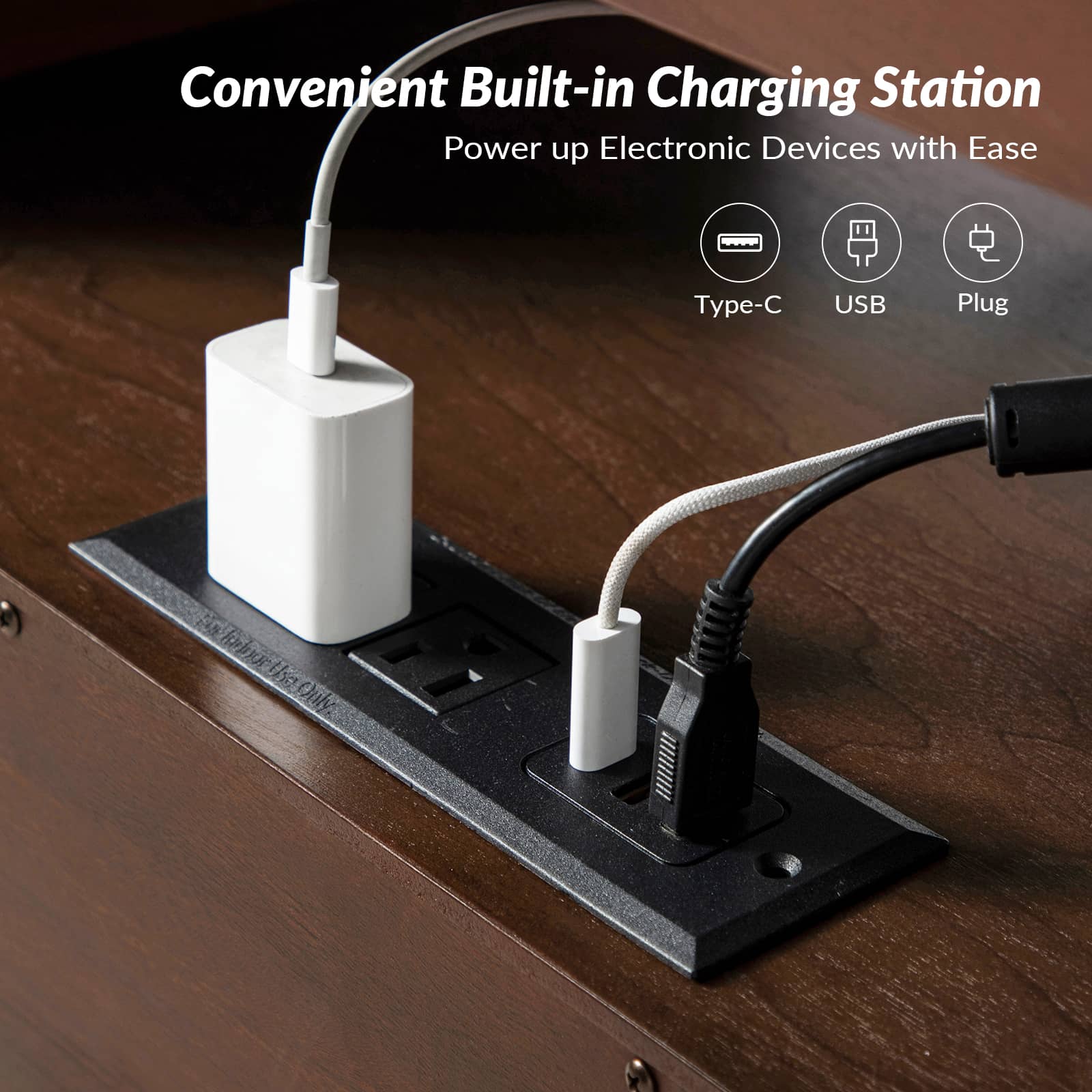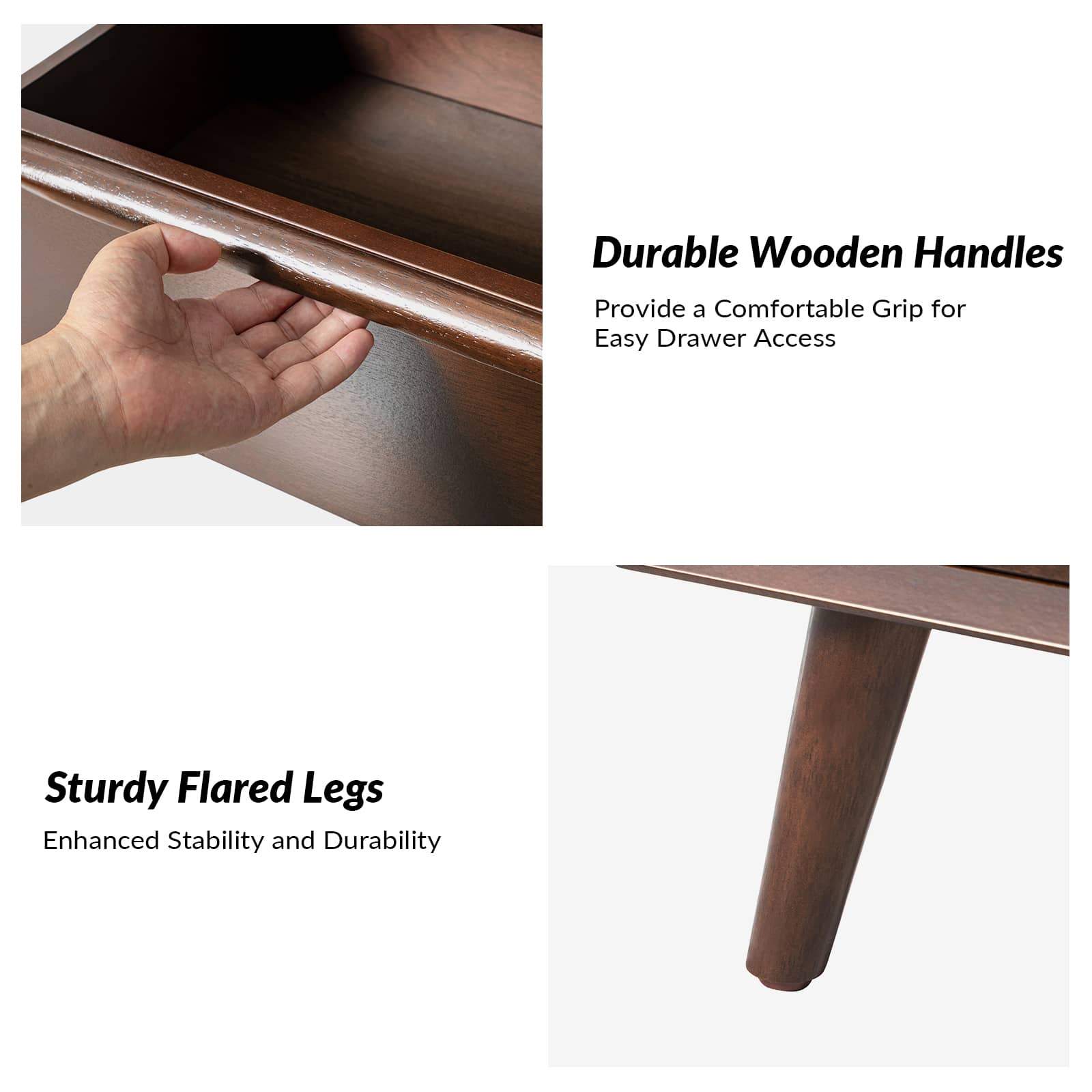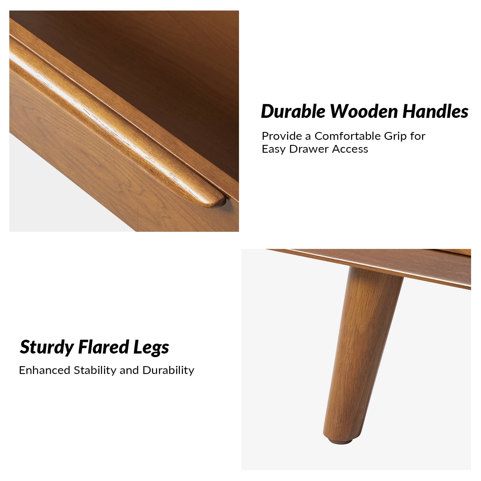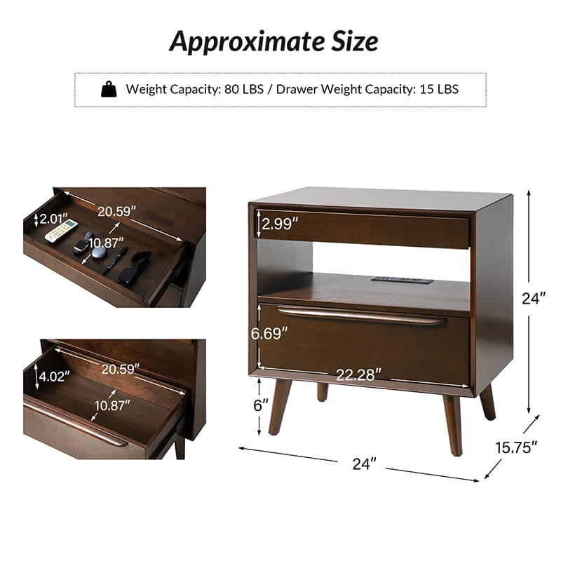 This mid-century modern 2-drawer nightstand is a versatile and stylish addition to your bedroom, study, or living room. The sleek design features wooden handles and flared legs, giving it a classic yet contemporary look. Each of the two drawers provides ample storage space for your items, keeping your room organized and clutter-free. A convenient pull-out tray is suitable for placing a cup, remote control, or other small items. This tray adds an extra layer of practicality, making it easy to keep frequently used items close at hand without cluttering the top surface. Plus, the nightstand includes a built-in charging station, allowing you to conveniently charge your devices overnight without the hassle of tangled cords. This mid-century modern nightstand seamlessly blends into various interior settings, offering both aesthetic appeal and everyday convenience.
