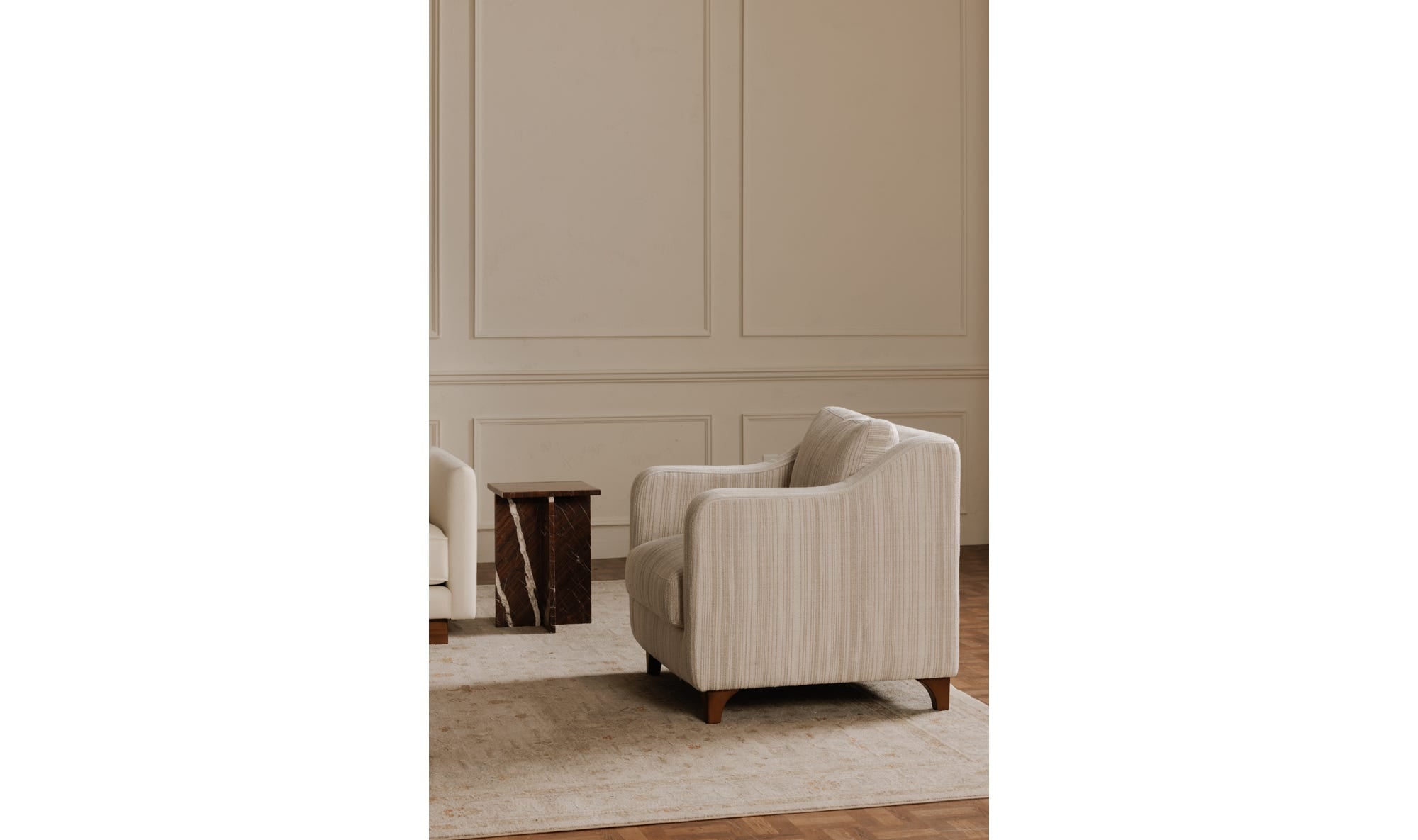 Inspired by traditional and transitional influences, the Hewitt accent chair offers timeless simplicity and commercial appeal with highly textured micro boucle upholstery. It has removable and reversible cushions for versatile comfort, a gentle slope in the arms and high back for an inviting posture, and curved solid birch legs that add elegance to the structure.
