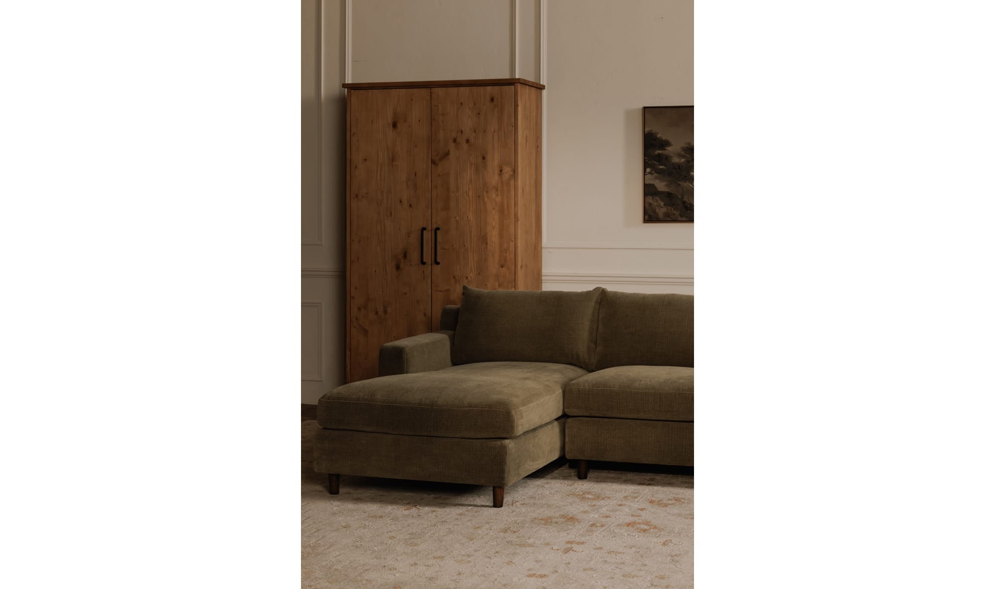 The Hutton sectional features soft-to-the-touch chenille fabric constructed from 100% polyester treated with C0 performance technology. A traditional higher back and tapered dark wood legs nod to mid-century aesthetics while providing contemporary coziness as a plush feather topper ensures unparalleled comfort.