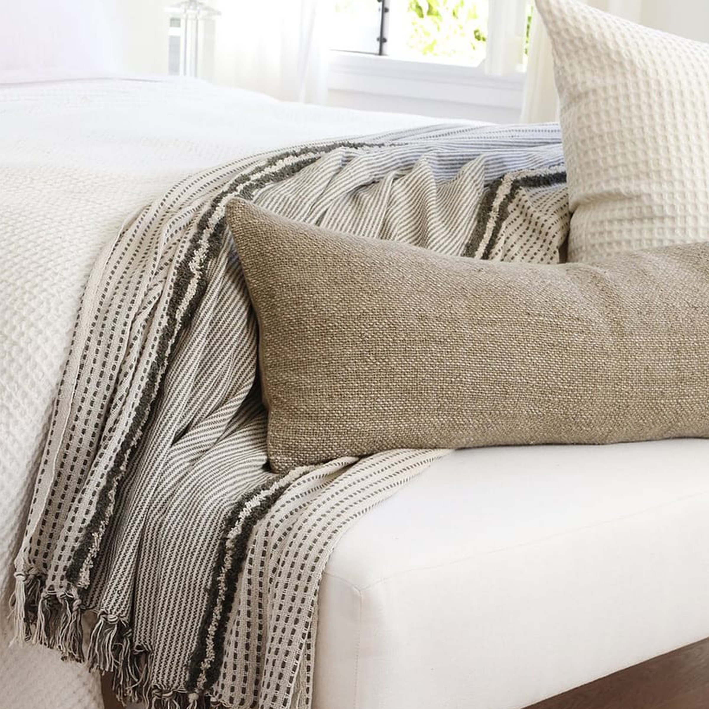 The Jagger combines stripes, stitching, and tassels in 2 subtle earthy colors. 100% cotton.