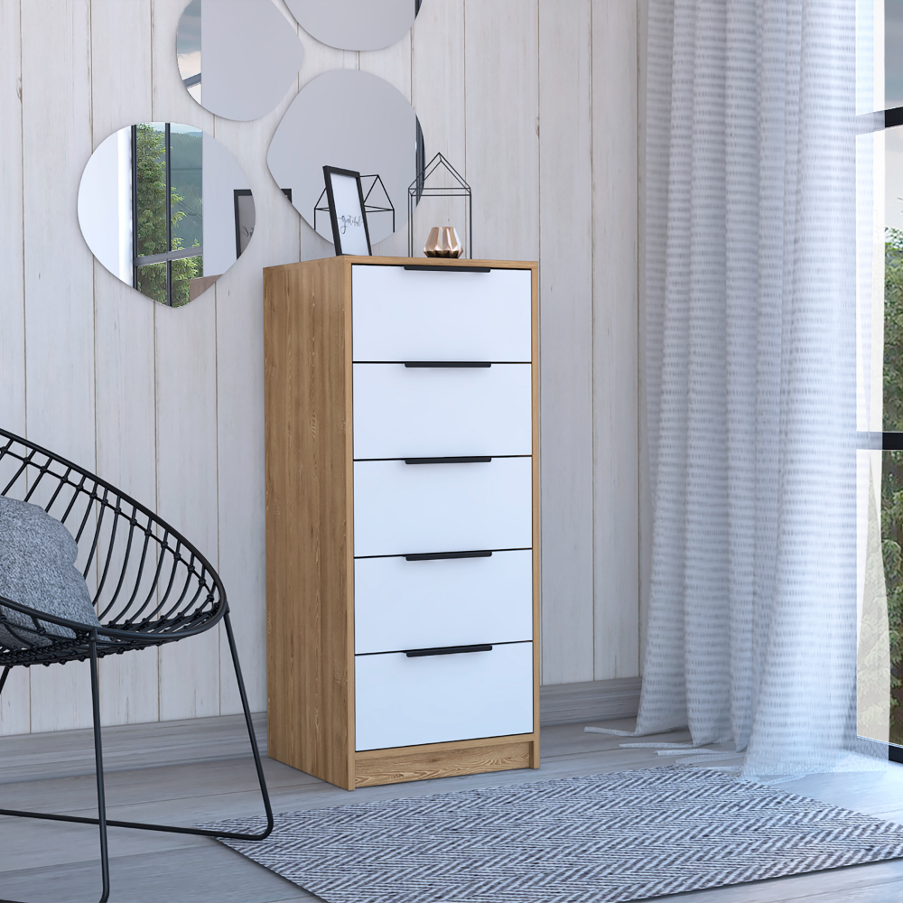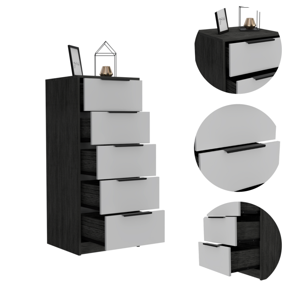 Kaia Five-Drawer Dresser, Bring the best style and design to your room. Its features with five perfect large drawers provide incredible storage space without sacrificing style, instant extra storage for narrow spaces, modern design, and an amazing combination of finishes and easy assembly. Designed with elegant Black Wengue - Light Oak, White, Light Oak - White manufactured wood.