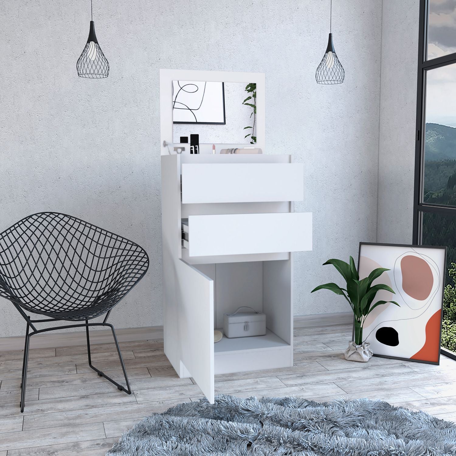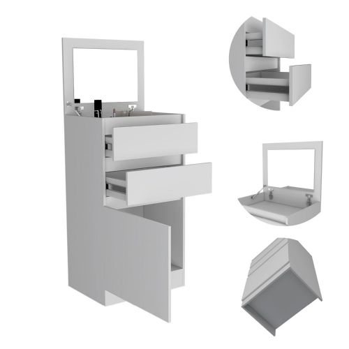 Kamelot Dresser With Jewelry Box, subtlety, elegance, and practicality in the same product, this is the Kamelot dresser. This incredible product will be your favorite. It works perfectly to store your favorite objects in its two drawers (7''H X 23.3''W) and its mobile shelf with a mirror to use as a makeup table, but this is also the ideal complement for your room. You will not find another like it, its Superior Top is ideal (29,4'') Designed with elegant white and dark walnut manufactured wood finish.
