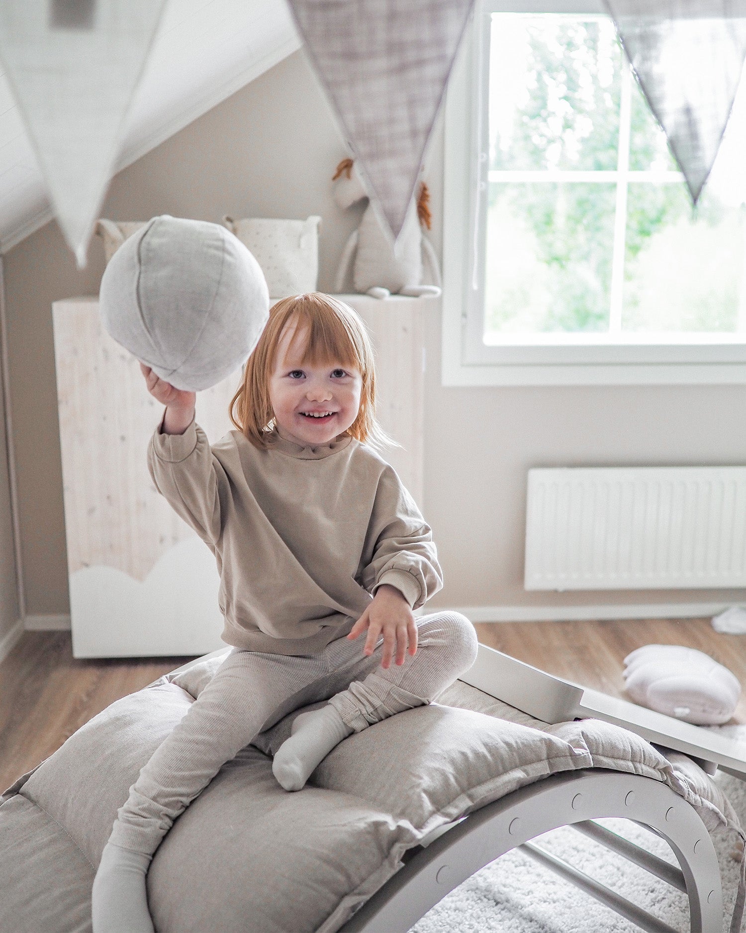 Our range of accessories complements the diverse functions of LUOTO climbing arch: KAURA cushion provides perfect comfort for rocking, TUOHI slide ramp adds excitement to climbing, and LUOTO stool transforms the product into a beautiful workstation for children's activities.