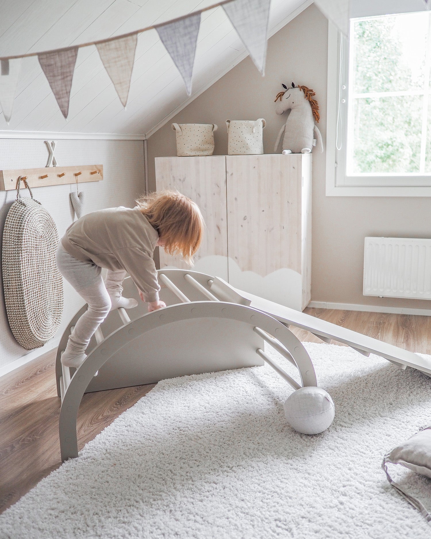 LUOTO climbing arch is a uniquely multifunctional piece of children's furniture that offers various challenges and fun activities suitable for different ages and stages of development. Designed to support active play, it promotes the diverse development of coordination, gross motor skills, balance, and strength, aligning with children's innate drive to learn new things.