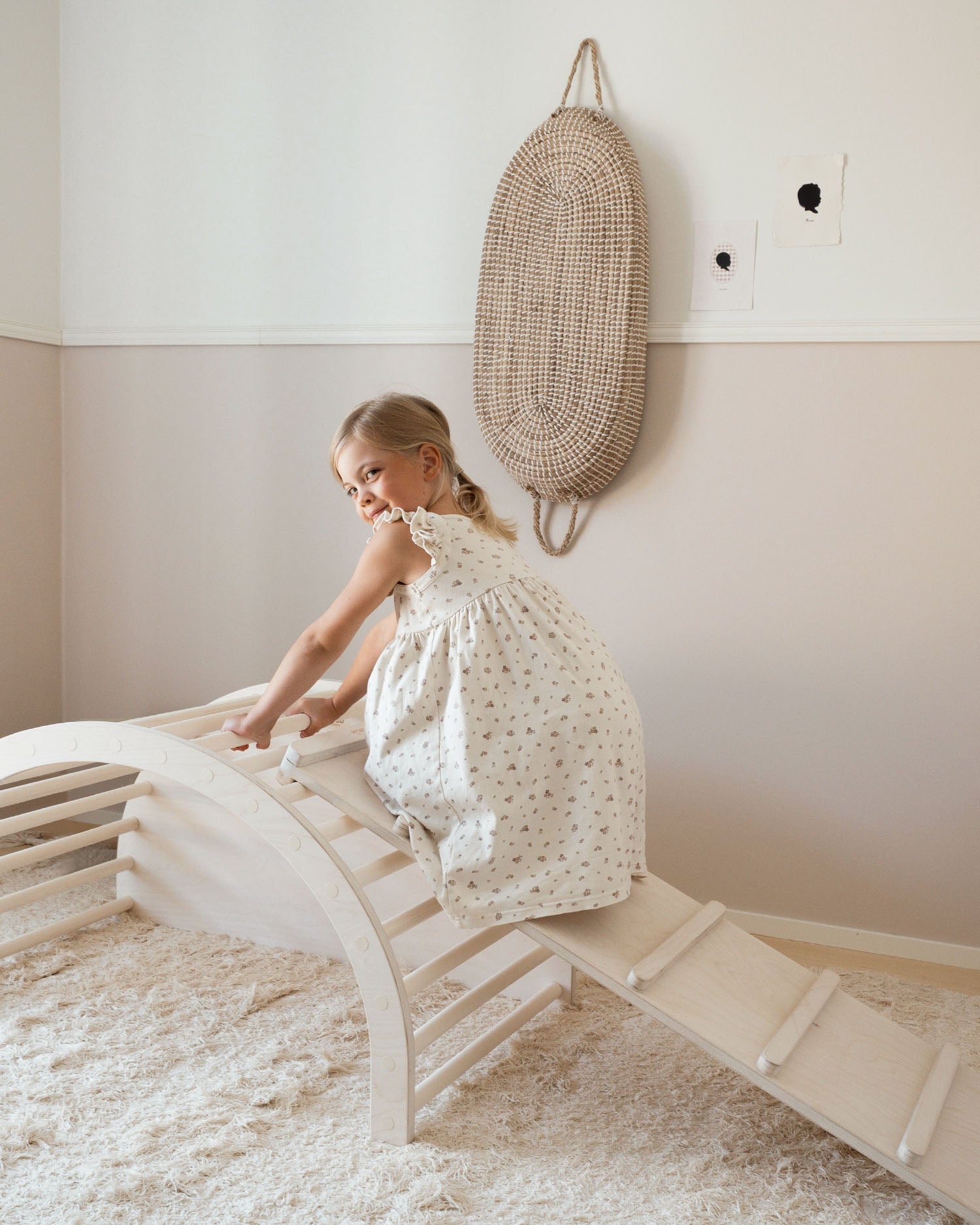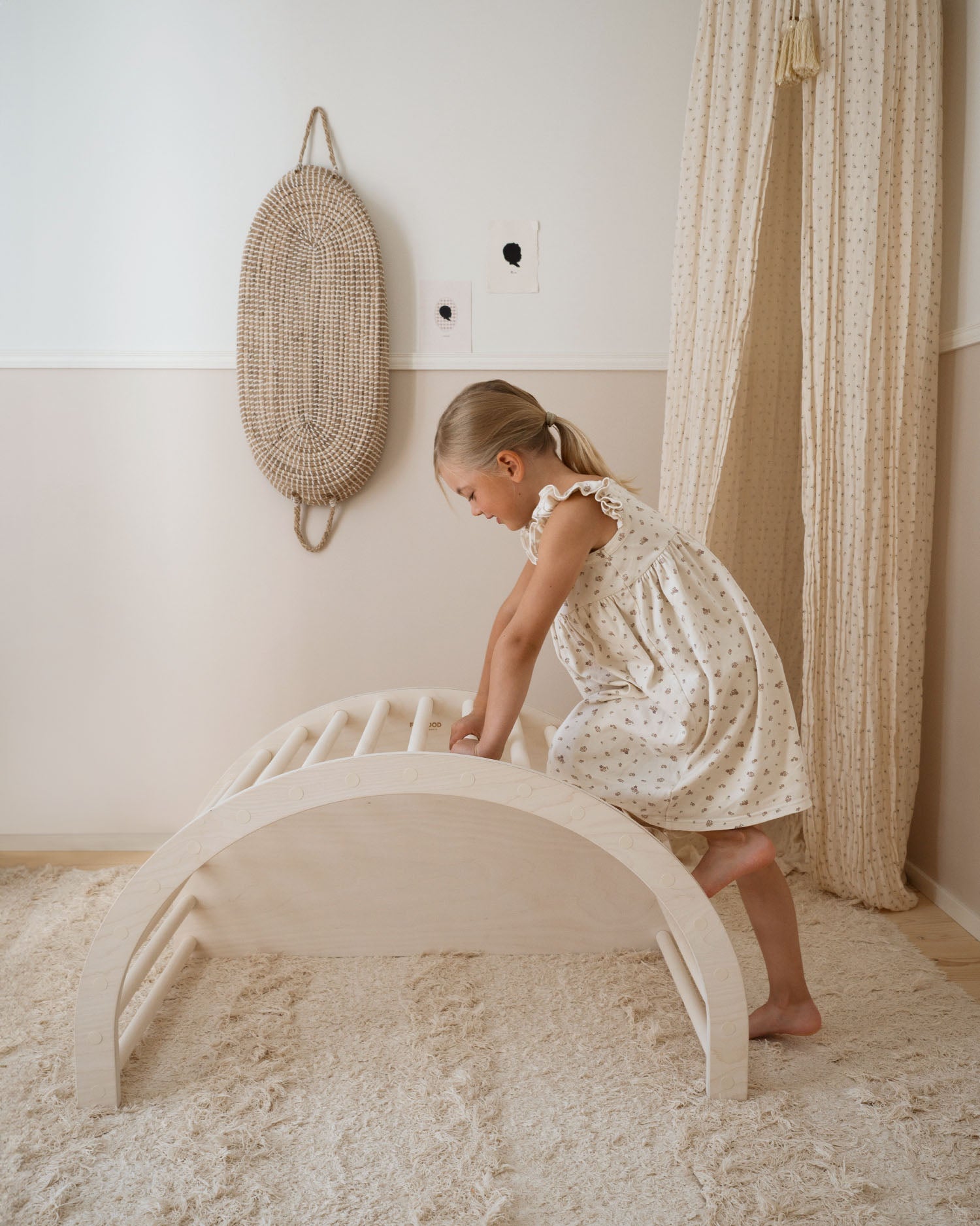 LUOTO II climbing arch is a unique piece of children's furniture that offers various challenges and fun activities suitable for different ages and stages of development. Designed to support active play, it promotes the diverse development of coordination, gross motor skills, balance, and strength, aligning with children's innate drive to learn new things.