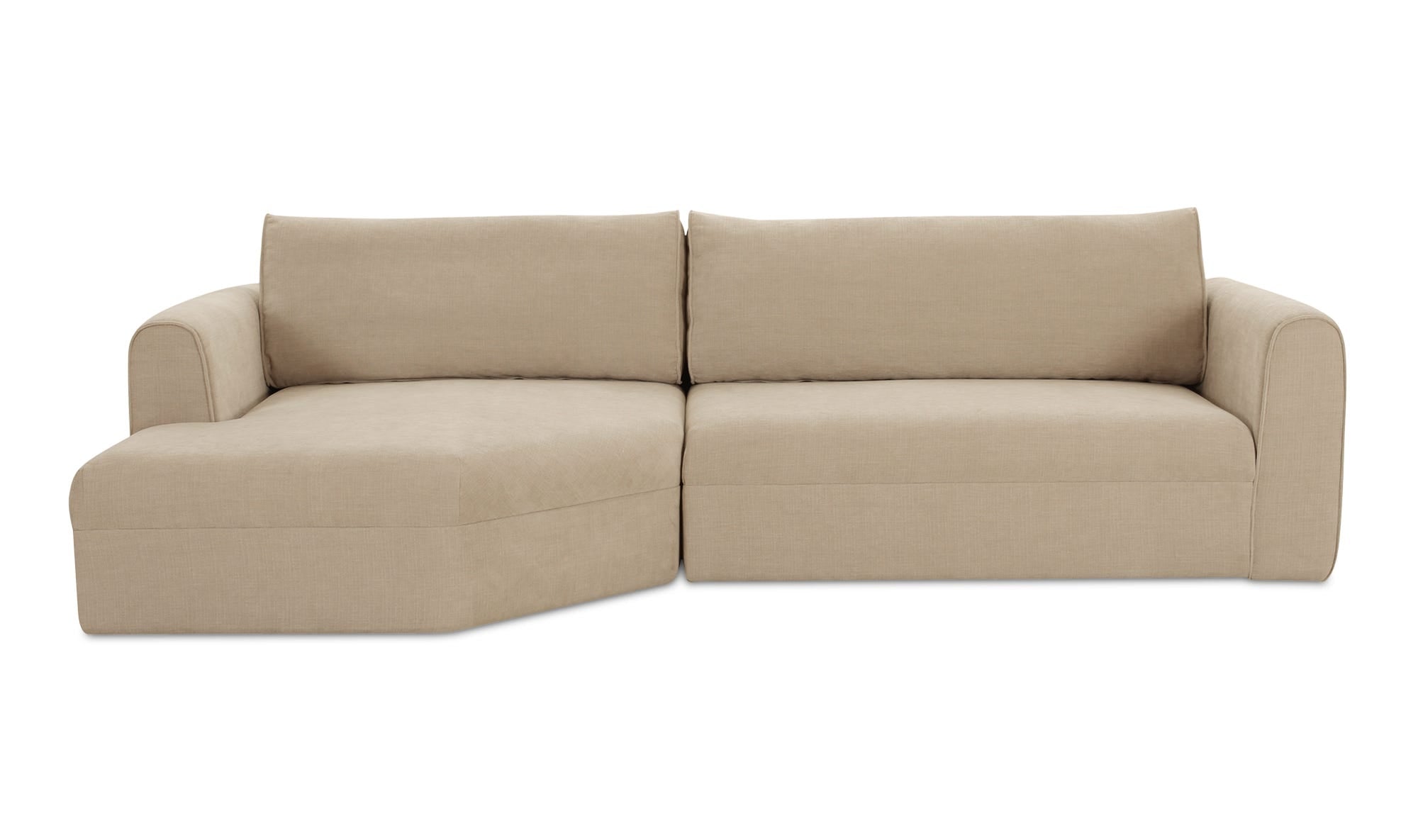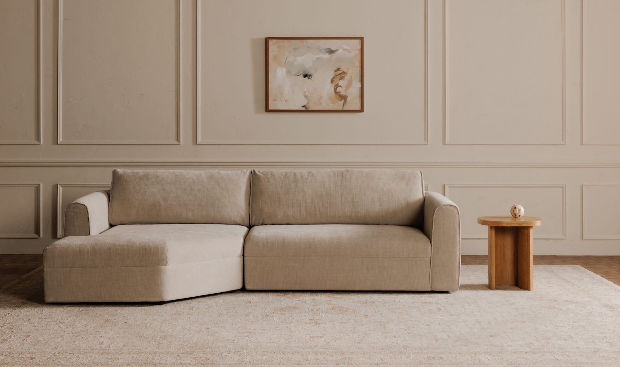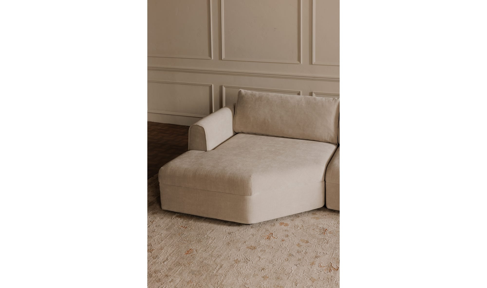 The Madrid sectional's soft chenille fabric upholstery and unique, angled wide chaise make it unlike any other silhouette. Soft, with a railroad weave, it invites the touch, while tonal piping draws the eye. A soft fixed seat and plush removable, reversible back cushions ensure lasting comfort and versatility.