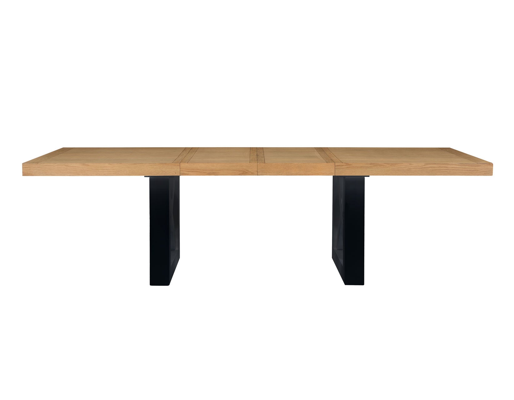 - Substantial planks of wood rest atop two generously scaled cross-hatch pedestal bases in a hearty, yet streamlined look.