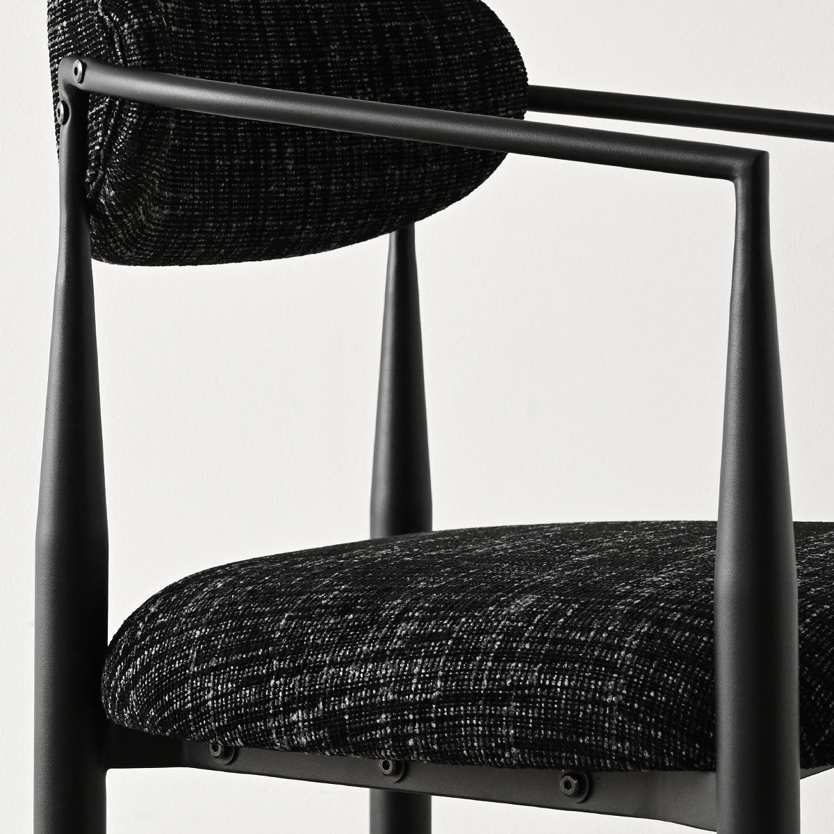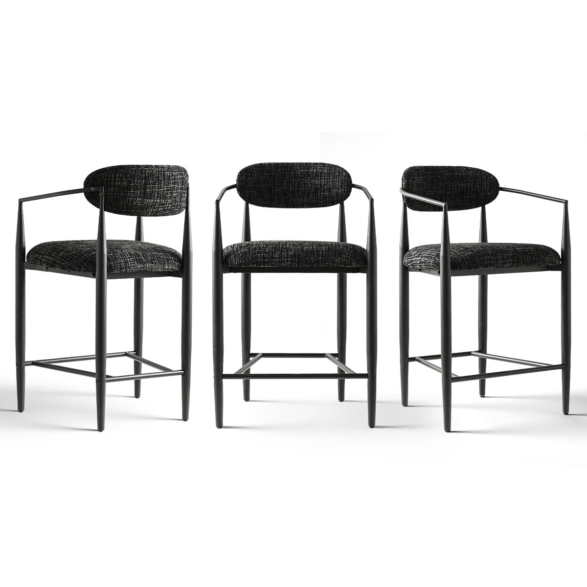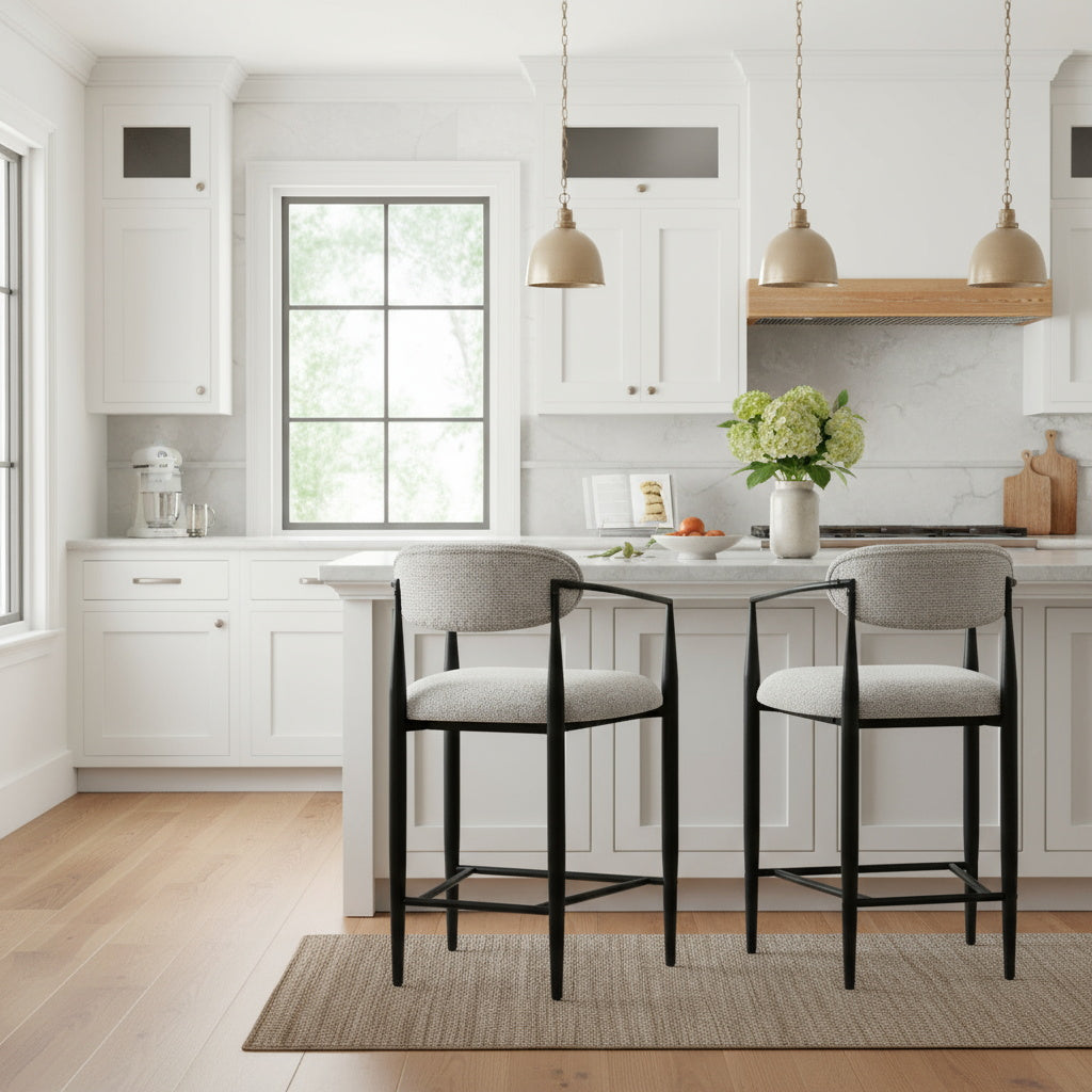 The Manhattan Counter Stool elevates your kitchen or dining area with a blend of modern minimalism and everyday comfort. Its sleek black metal frame and sculptural curved backrest create a clean, contemporary silhouette, while the soft textured fabric seat and back provide inviting support. The exceptionally wide 22" seat delivers superior comfort compared to standard stools, making it ideal for relaxed dining or extended seating. With ergonomic armrests, a supportive footrest, and a versatile 25.5" seat height, this stool fits most counters and islands with ease. Durable yet lightweight, it pairs beautifully with marble or wooden surfaces, adding understated sophistication to any modern home.