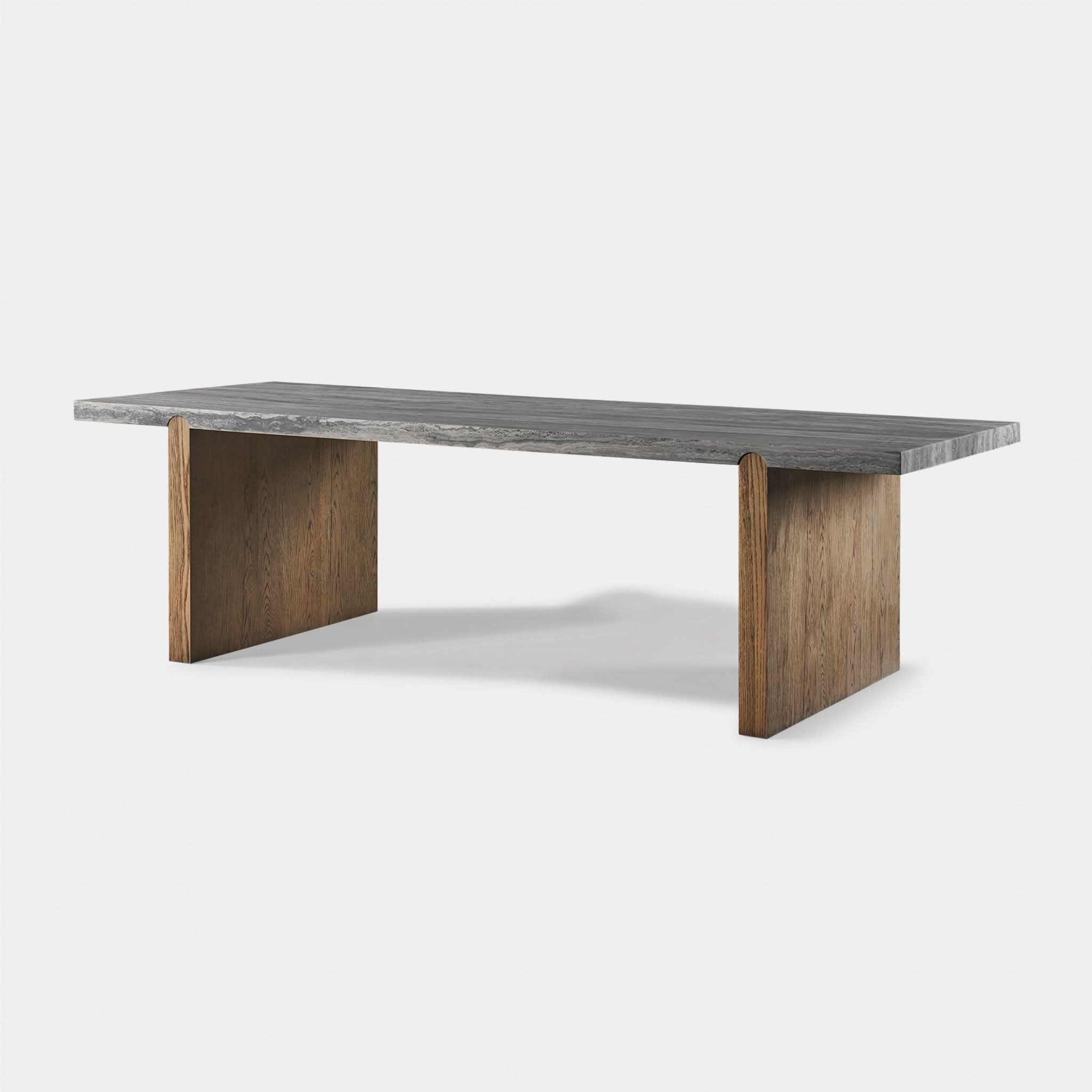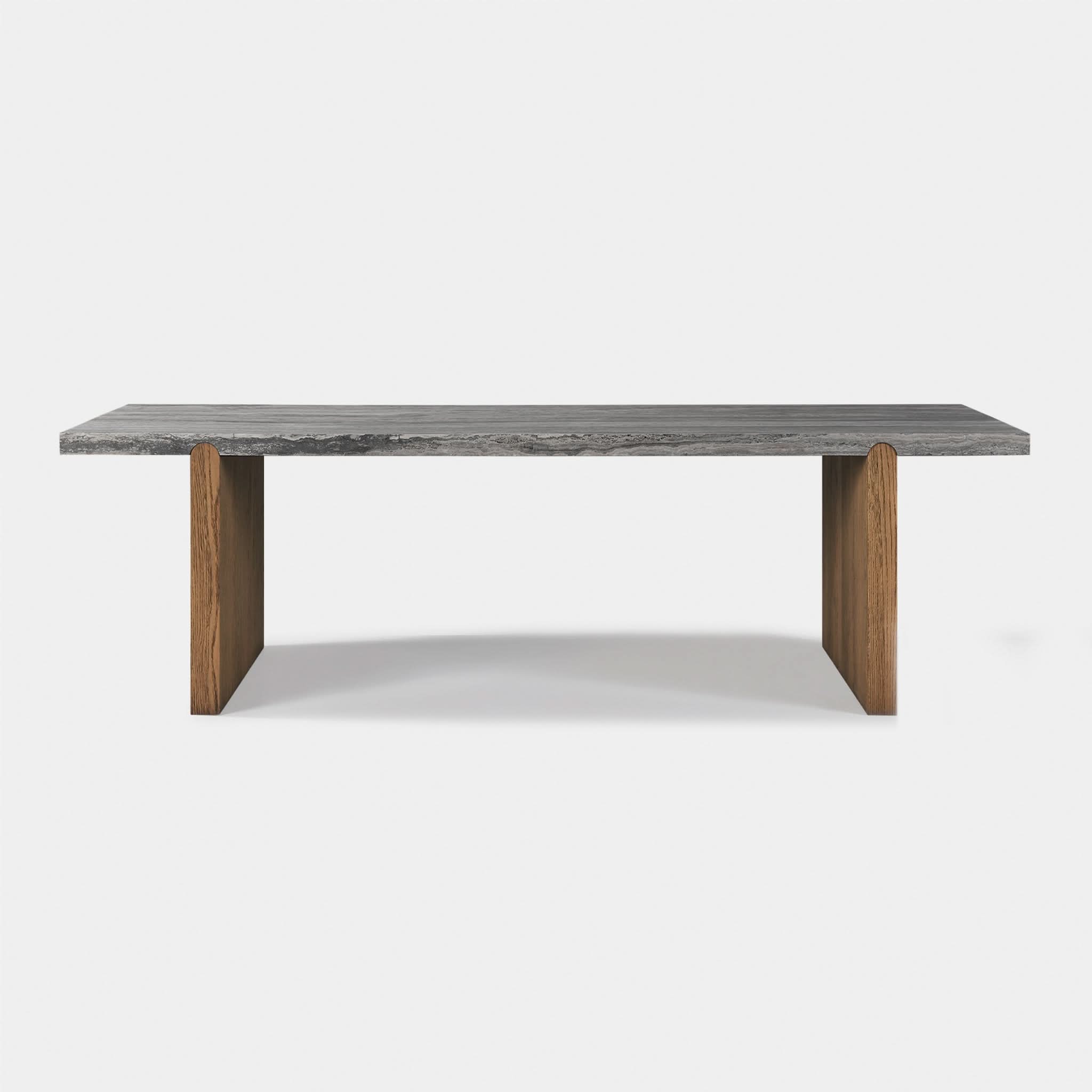 Our Marcello collection perfectly mixes elemental forms and natural materials. A classic table with a twist, the Marcello Dining Table 2600 is the perfect outdoor table for up to ten — featuring solid oak plank legs in parallel supporting a travertine stone top with natural swirling patterns. The final design detail — joining the legs and top with a half–circle curve — introduces a thoughtful detail to this luxurious piece that elevates any outdoor space.
