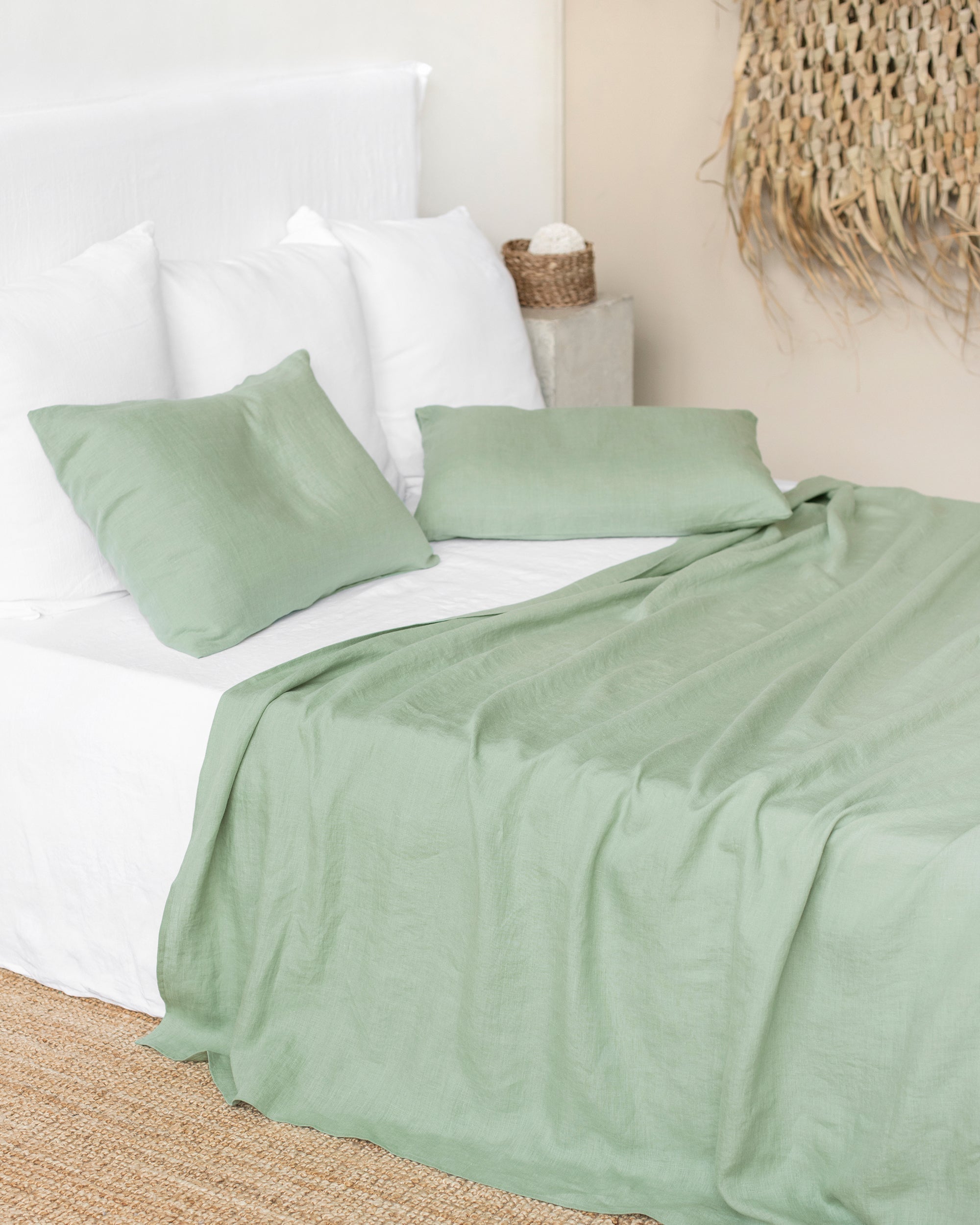 Linen flat sheet in matcha green color. Luxuriously soft and breathable linen sheets will become a staple of every modern bedroom. The natural thermoregulating and moisture-wicking properties of linen guarantee the feeling of comfort all year round. Flat sheets can be used as top sheets or bedcovers as well.