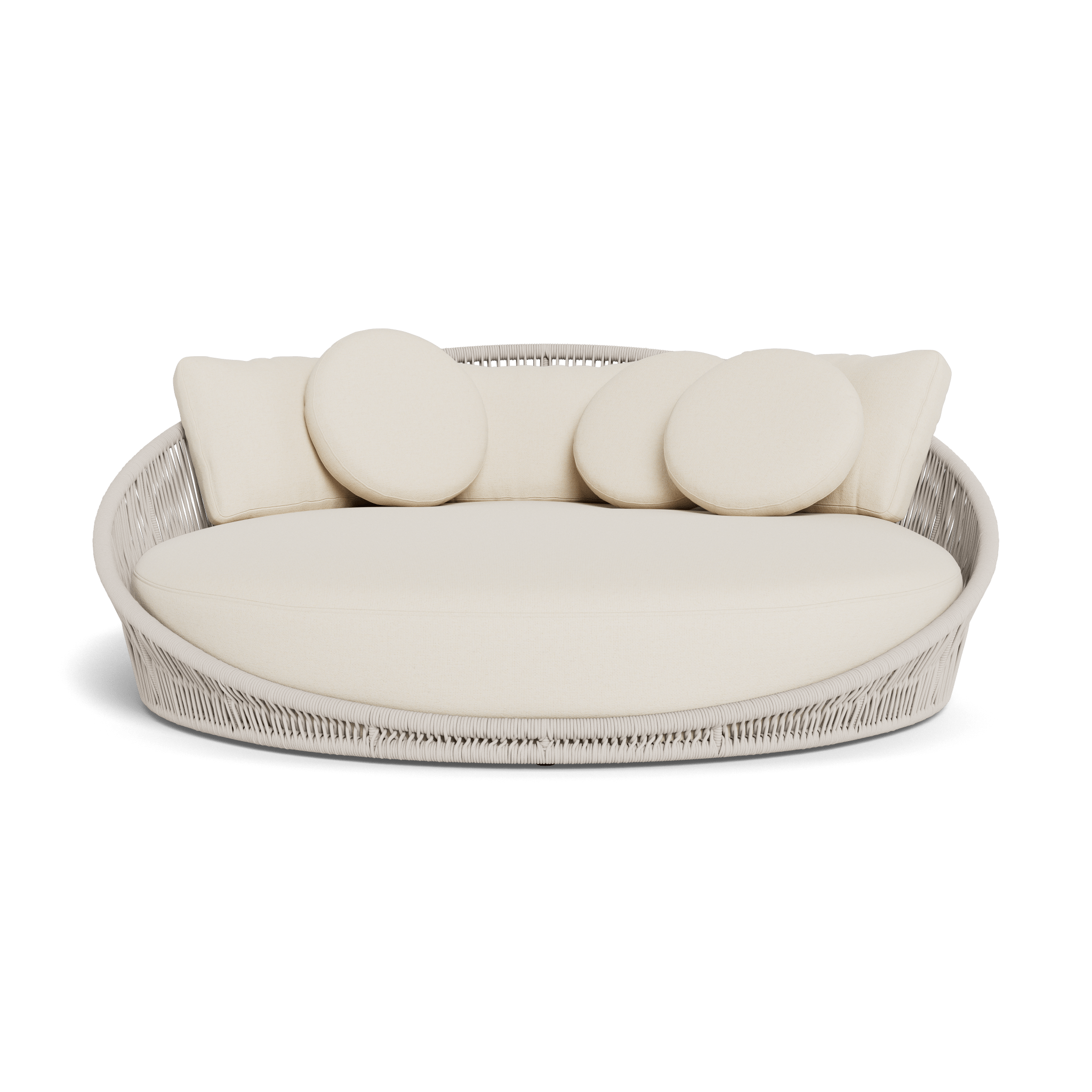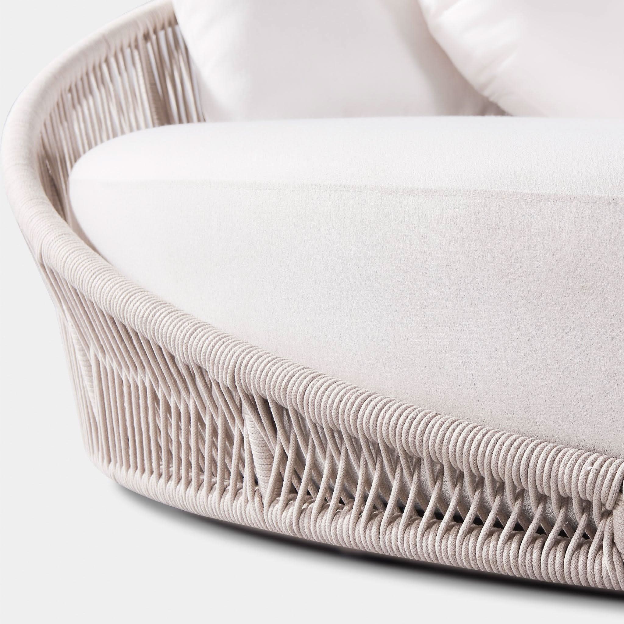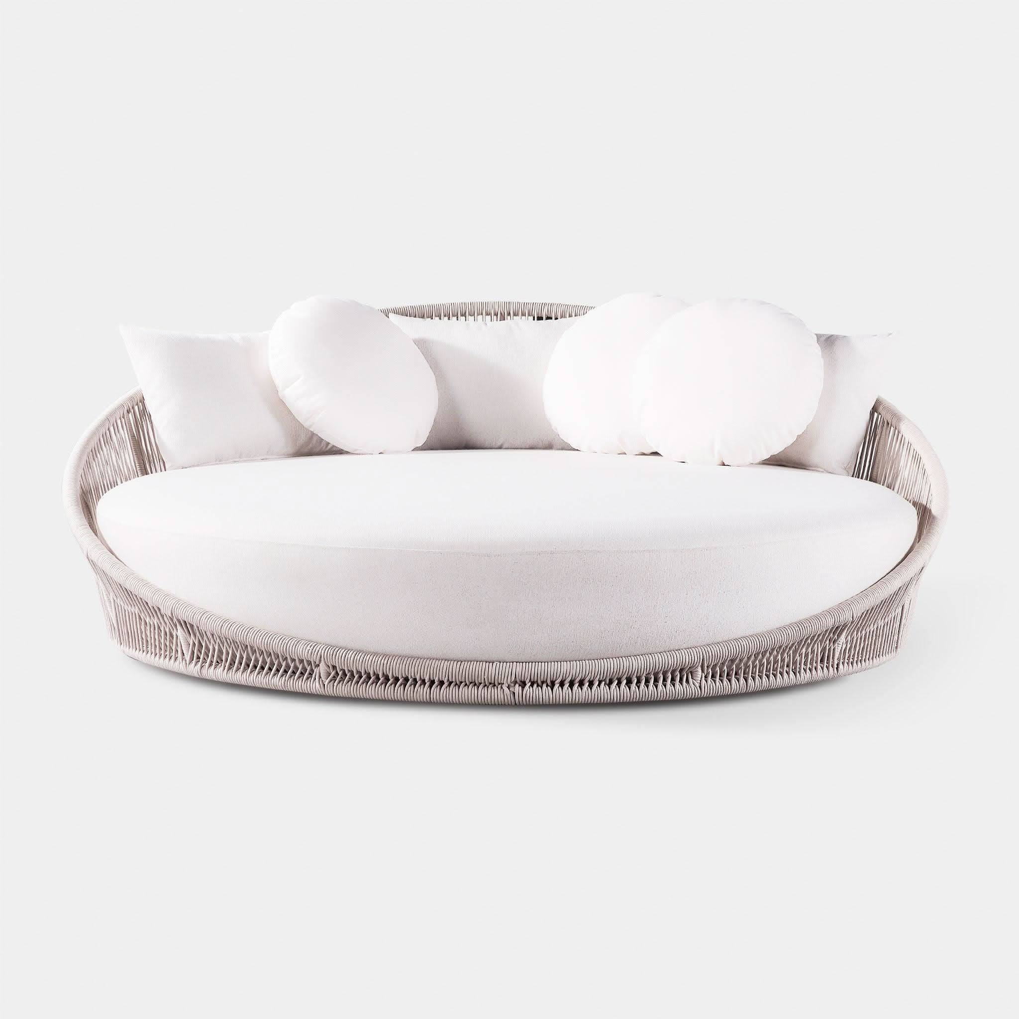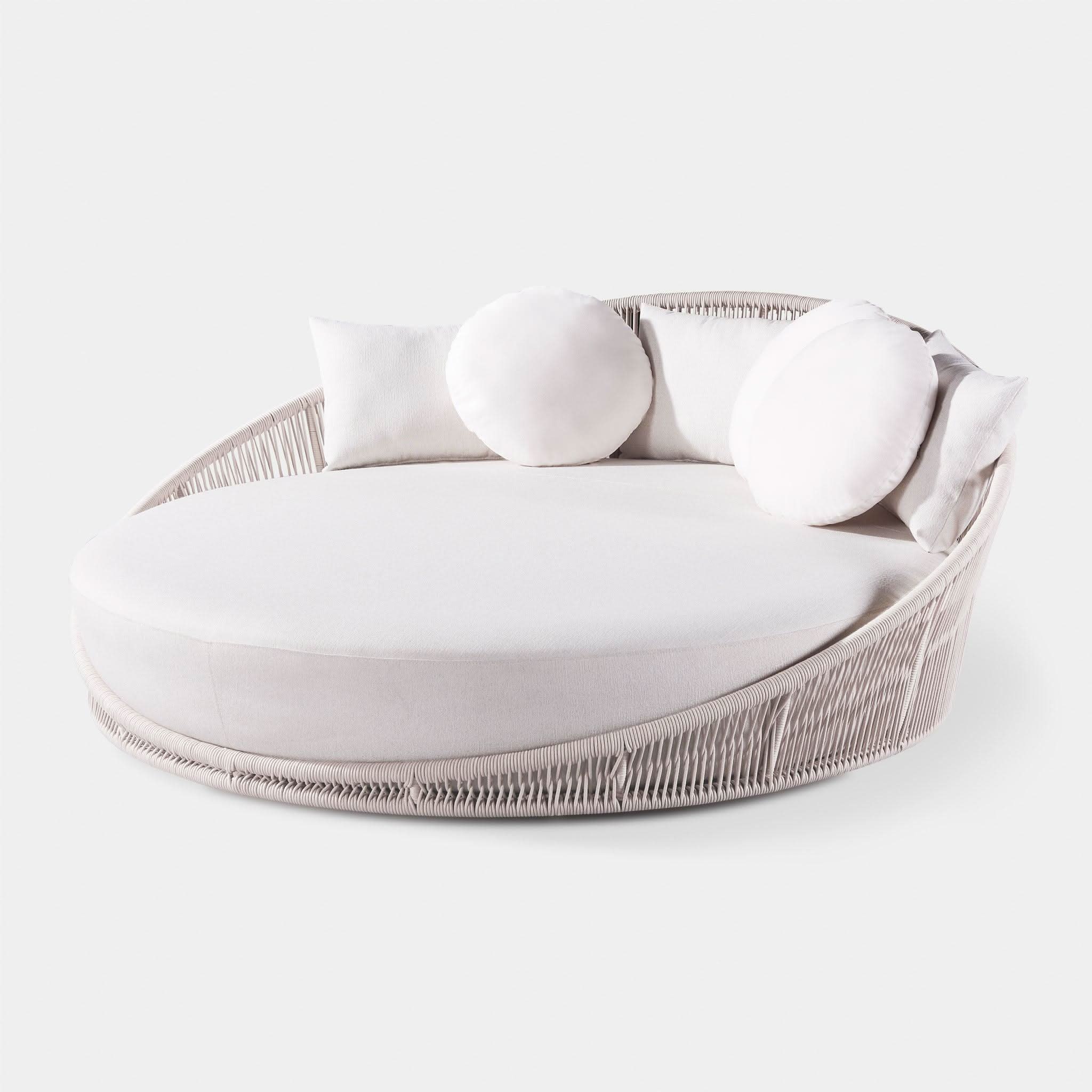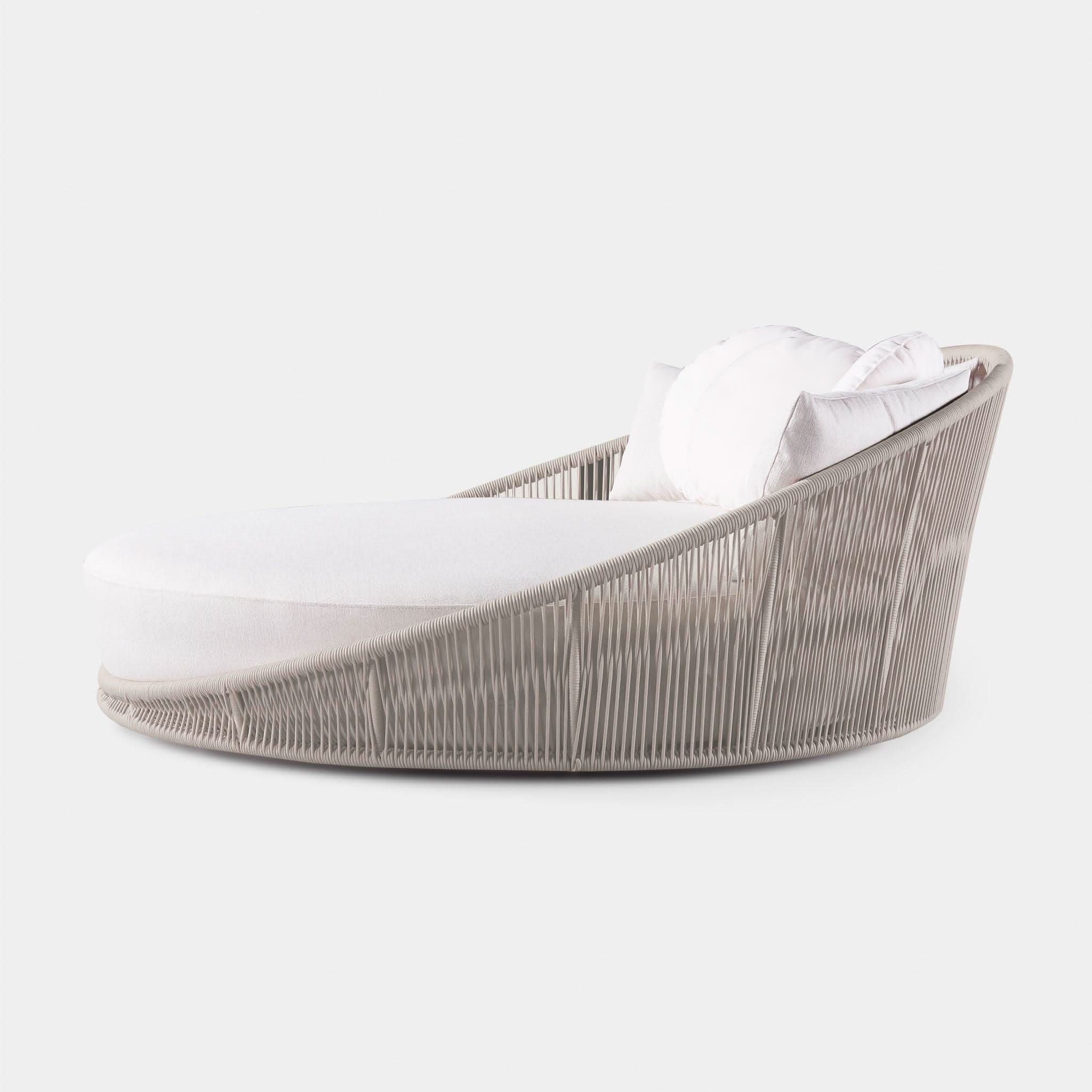 Designed by Marcel Wanders Studio. Featuring a signature radial rope pattern that creates a sophisticated rhythm, our Maui collection is nomadic luxury. Interpreting the elements of the Maui style in a poolside daybed, the Maui Daybed is a fun, bold focal point for your space — enjoy a plush lounge cushion with room for several, hand wrapped with rope in a naturally tapering shape. A casual mix of round and rectangular back pillows completes the aesthetic. Refined and yet Bohemian, this conversation piece amplifies any space.