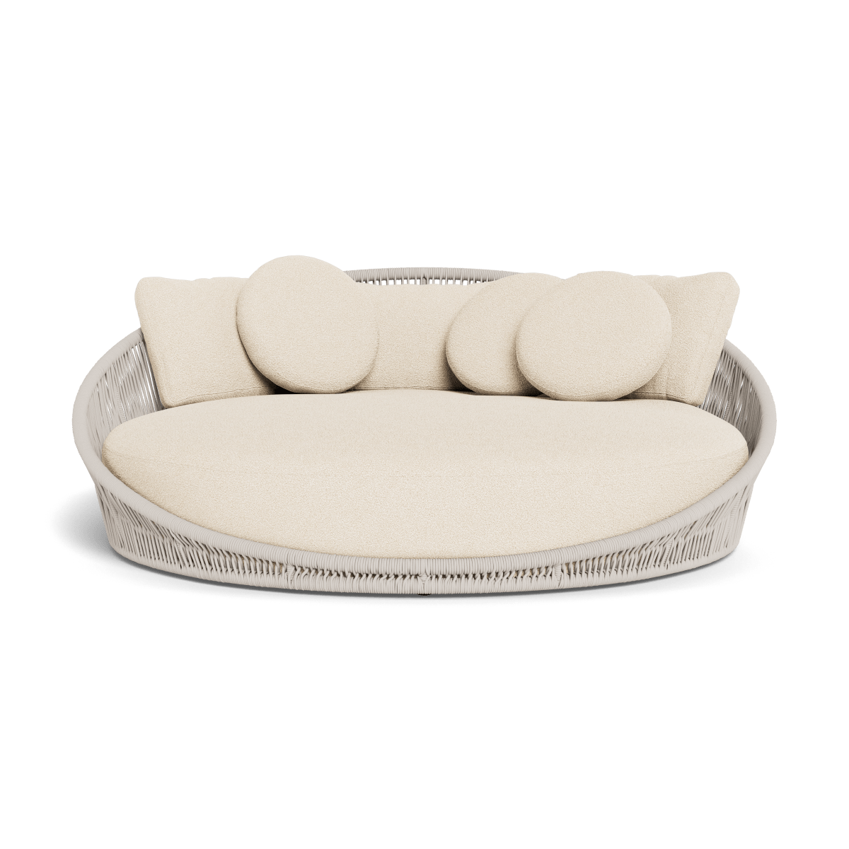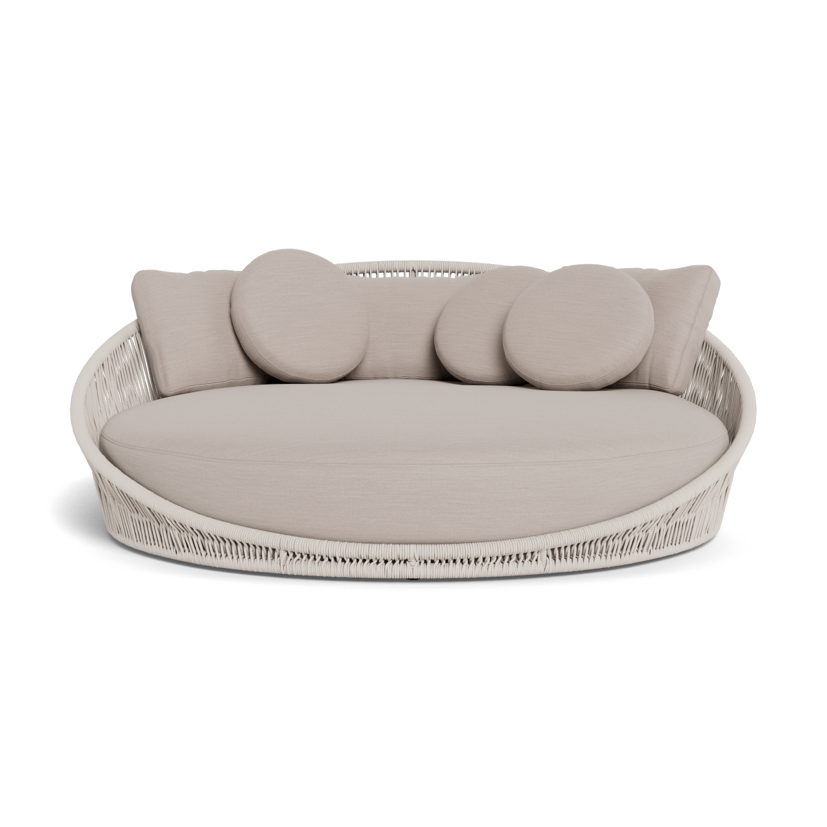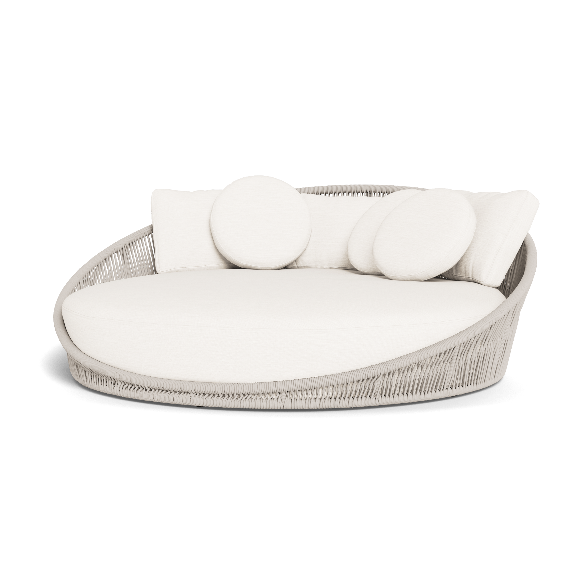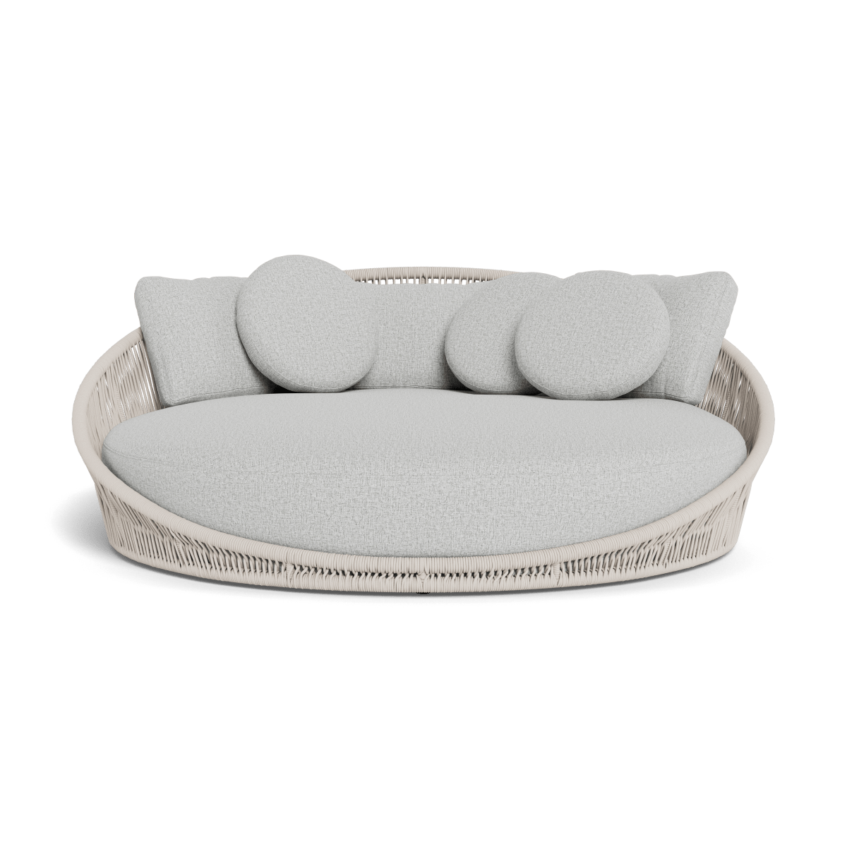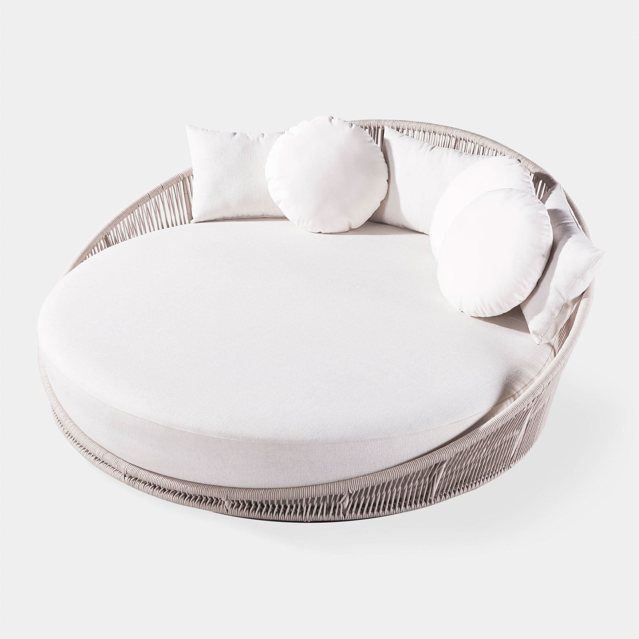 Designed by Marcel Wanders Studio. Featuring a signature radial rope pattern that creates a sophisticated rhythm, our Maui collection is nomadic luxury. Interpreting the elements of the Maui style in a poolside daybed, the Maui Daybed is a fun, bold focal point for your space — enjoy a plush lounge cushion with room for several, hand wrapped with rope in a naturally tapering shape. A casual mix of round and rectangular back pillows completes the aesthetic. Refined and yet Bohemian, this conversation piece amplifies any space.