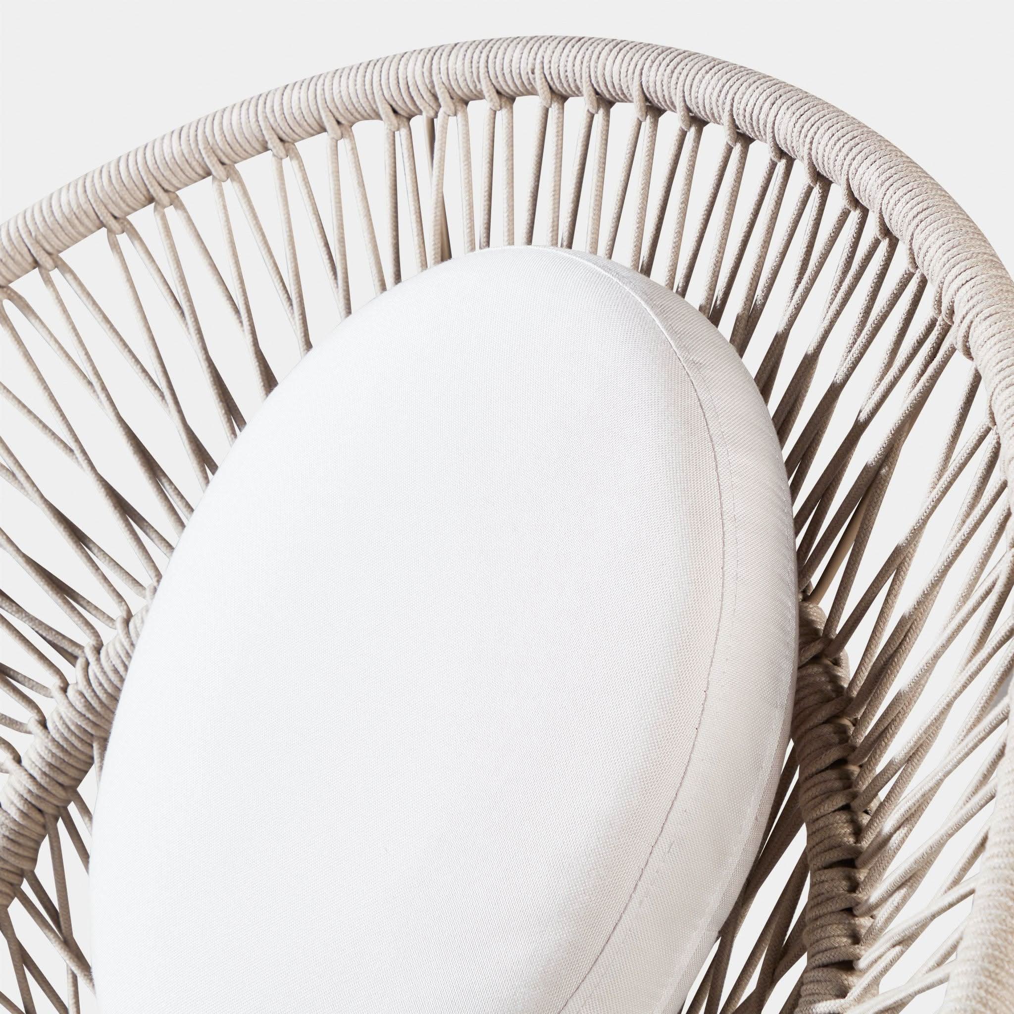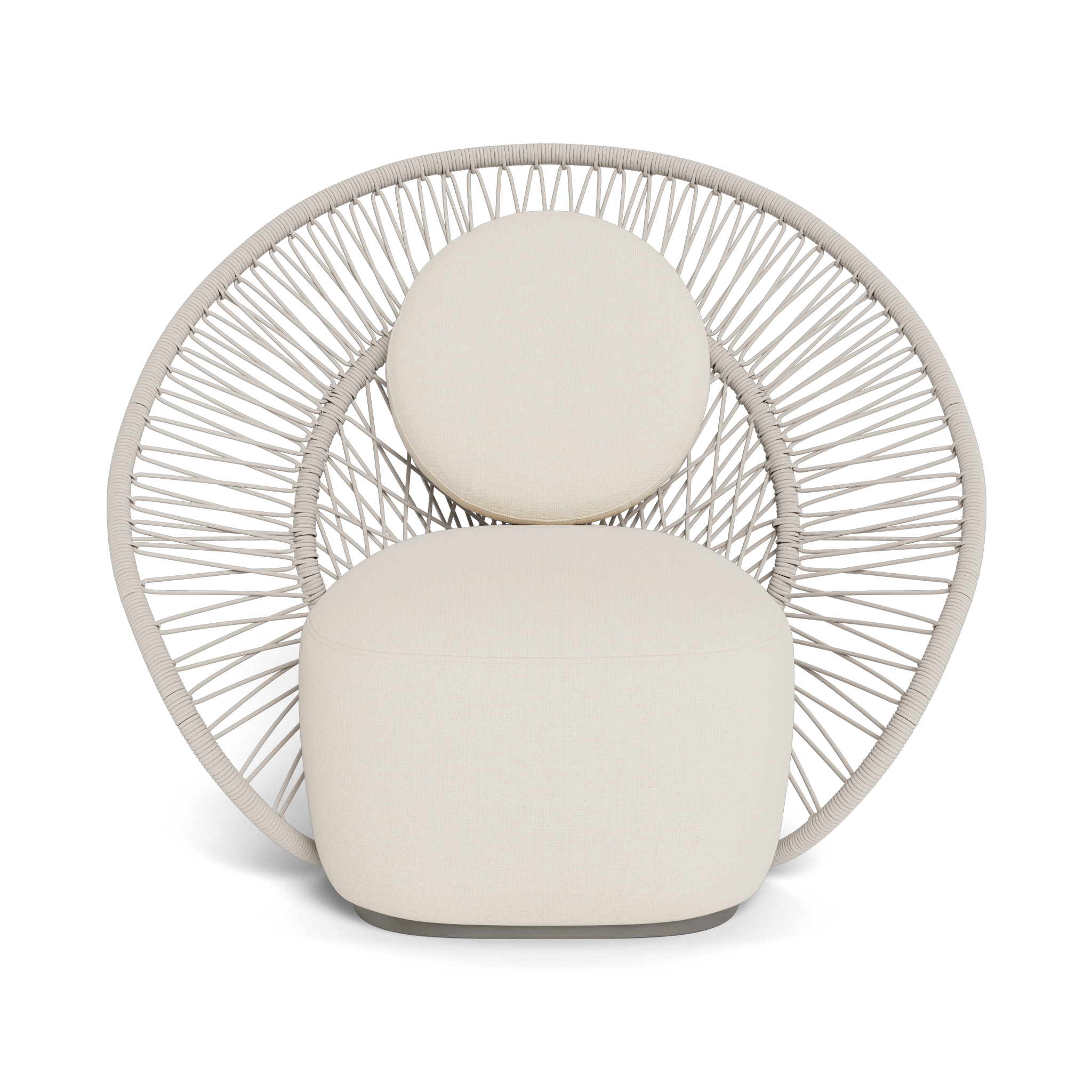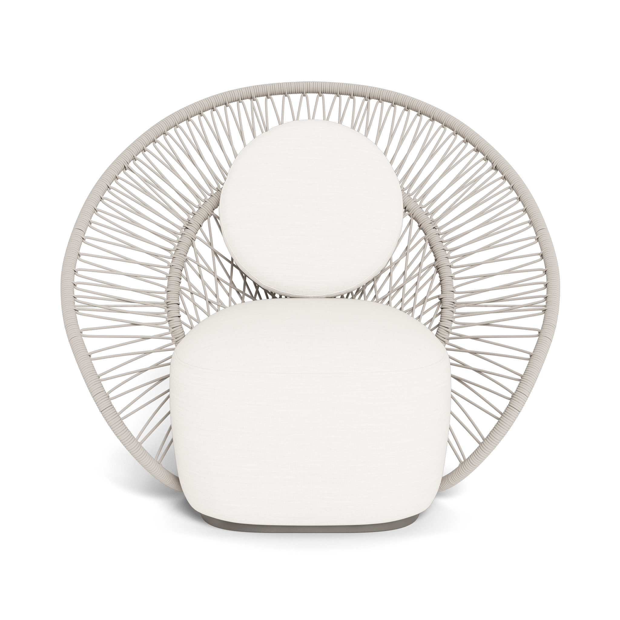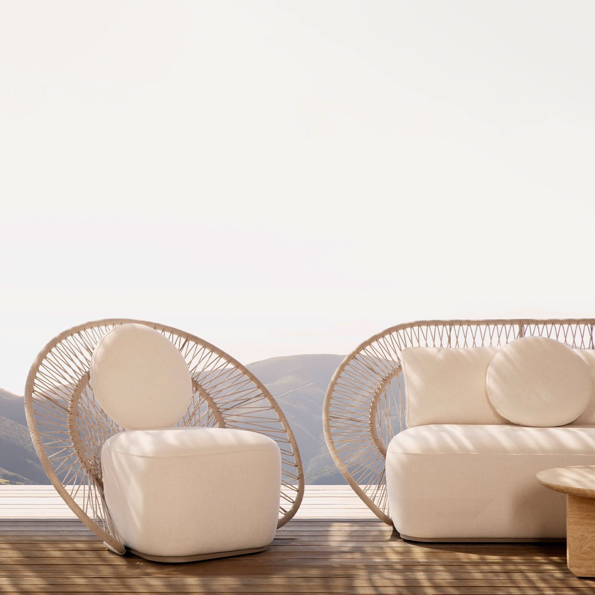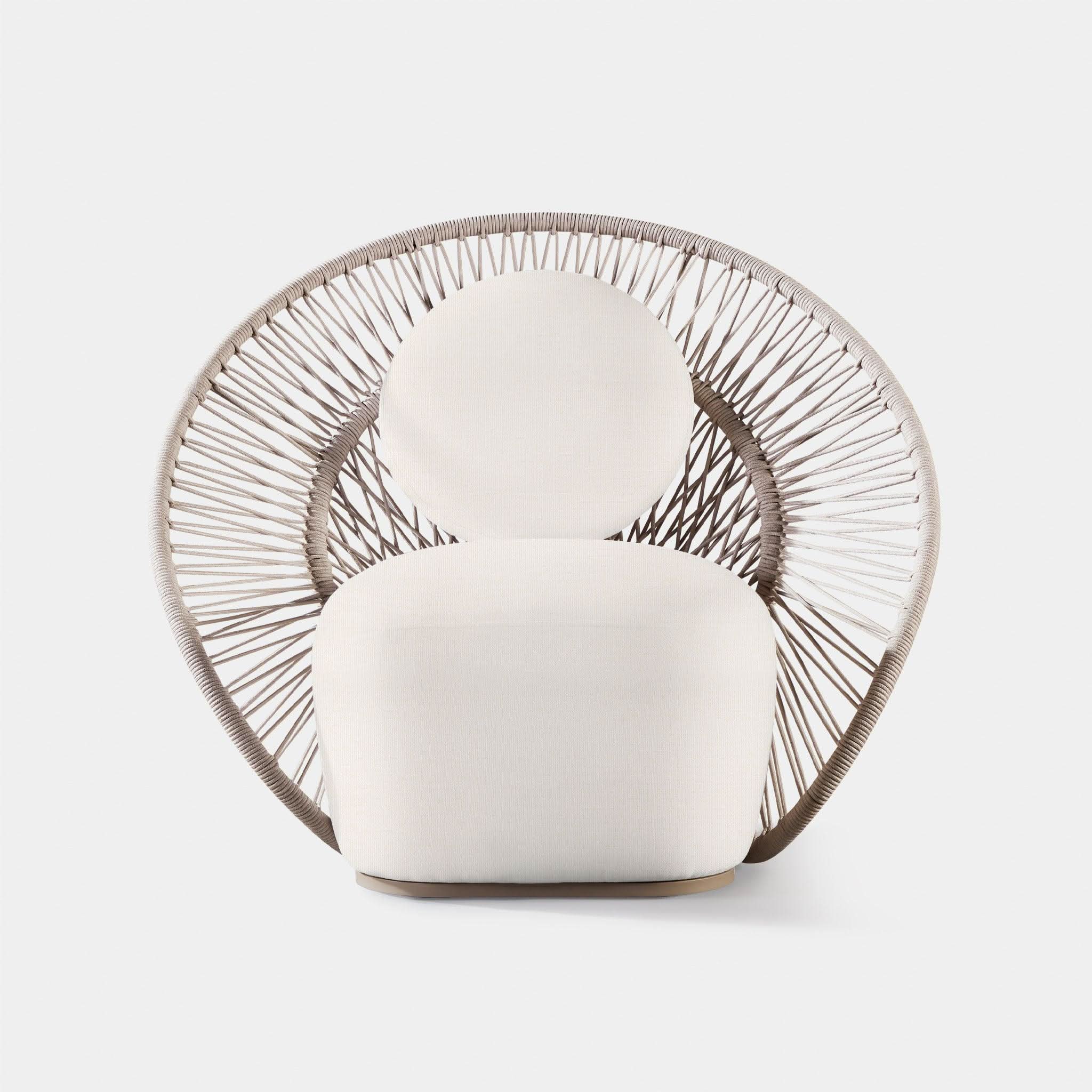Designed by Marcel Wanders Studio. Featuring a signature radial rope pattern that creates a sophisticated rhythm, our Maui collection is nomadic luxury. Inspired by the rounded forms of a wide-brimmed straw hat, the Maui Lounge Chair is the grounding element to your space — enjoy a generous seat cushion with a multi-dimensional rounded back hand woven from all-weather taupe rope, all on a sliver of an aluminum plinth base. A casual mix of round and rectangular back pillows completes the aesthetic. Refined and yet Bohemian, this conversation piece amplifies any space.