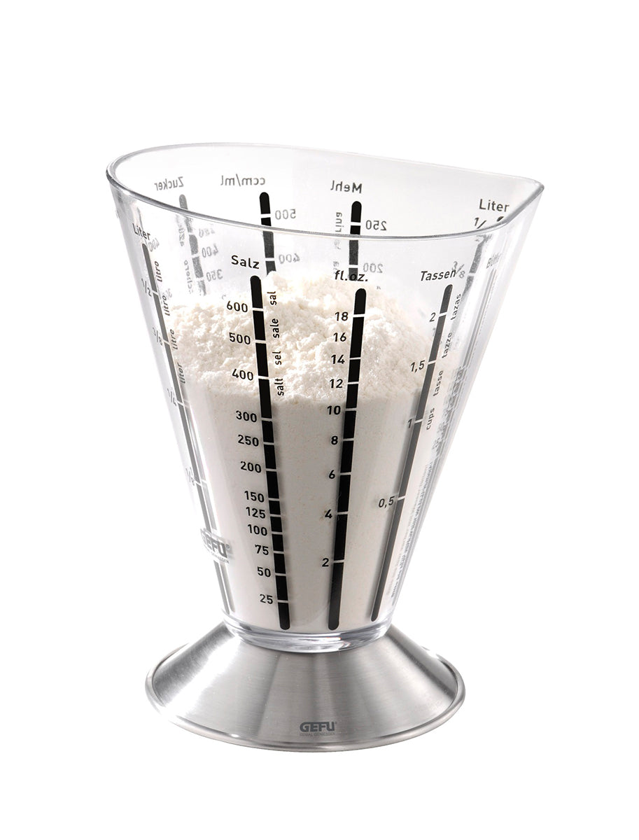The outside graduation of this useful measuring cup makes it possible to read even tiny quantities. In addition, it allows the weighing of butter through displacement of water. For measuring: flour, sugar, rice / pot barley, salt, weighing butter. More Parameters: liters, ccm / ml, fl. oz, cups