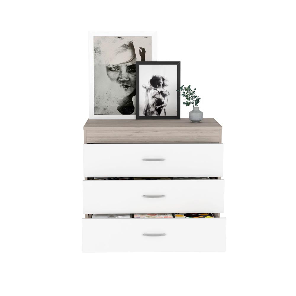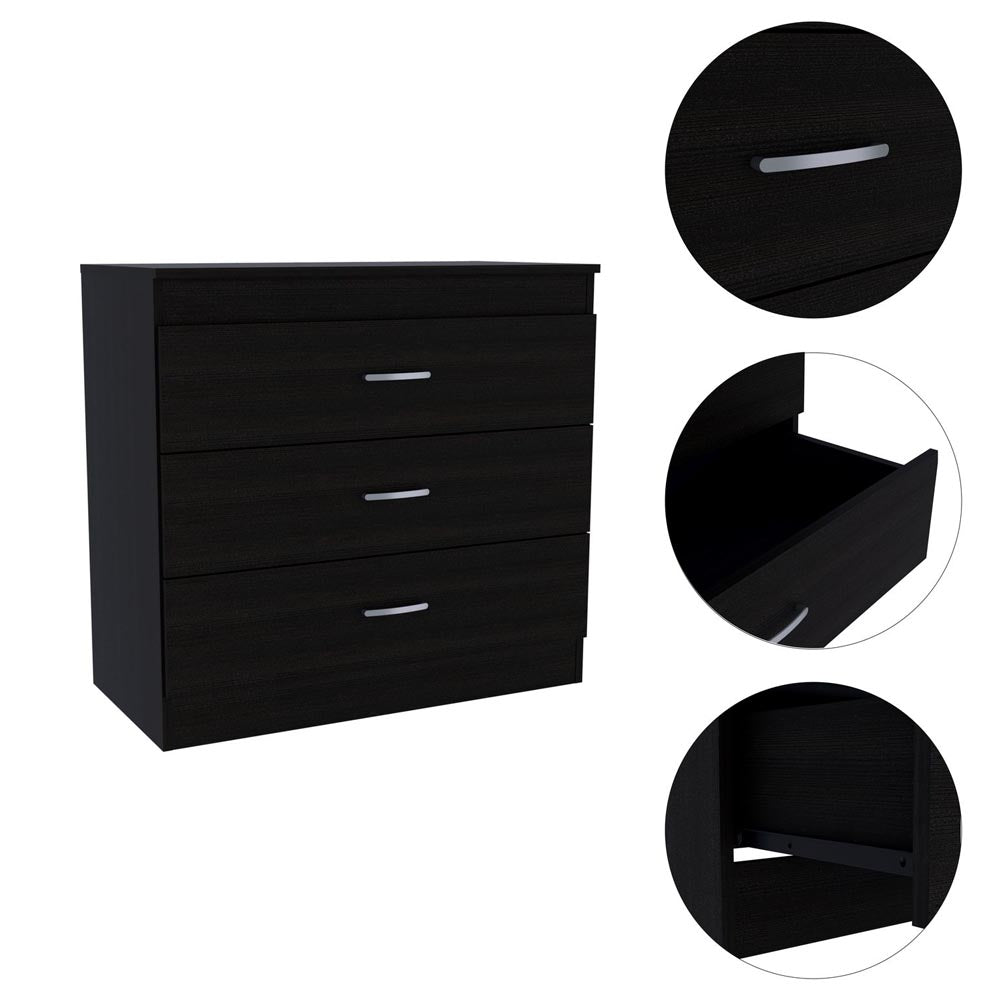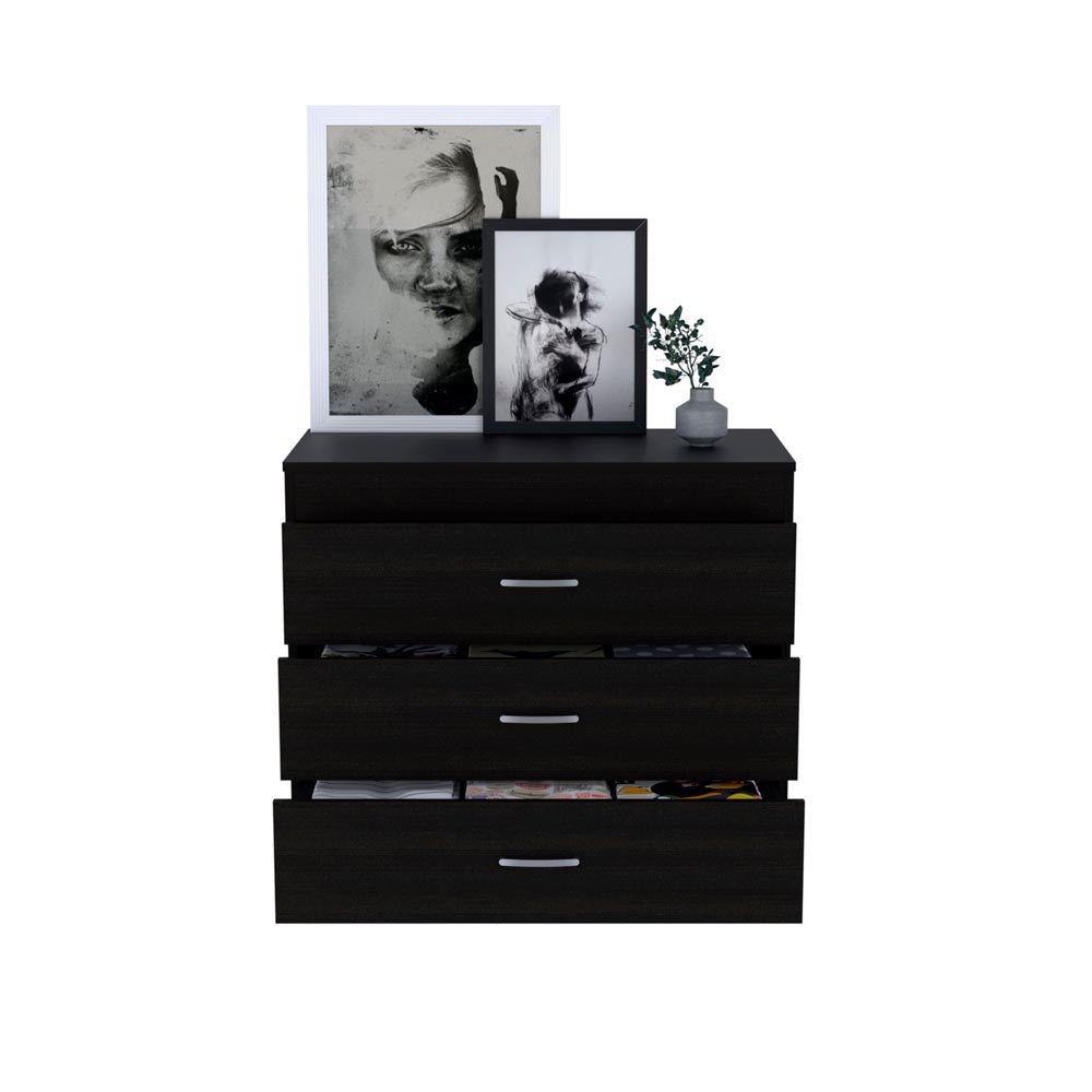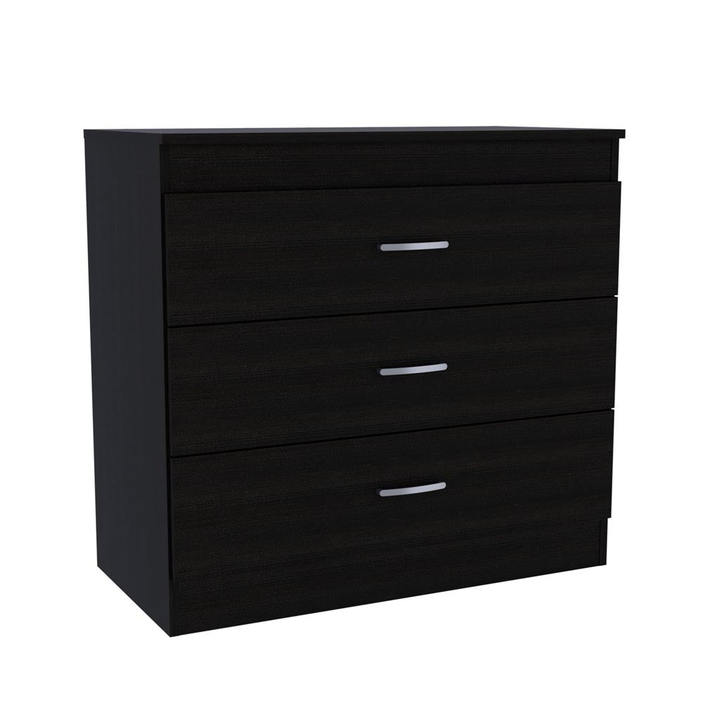 Melia Three Drawer Dresser is a minimalist, and modern design with a touch of sophistication, while the classic look blends well with existing design themes, allowing it to combine multiple styles and providing a great place to display decorative items as well. It features three spacious drawers to hold extra clothing and other accessories that will give you that extra storage space without sacrificing style or functionality. Each drawer had a smooth finish metal handle and slides out smoothly. Designed with elegant Black, Light Gray manufactured wood.