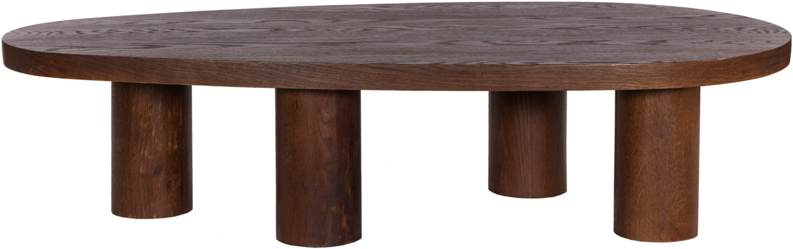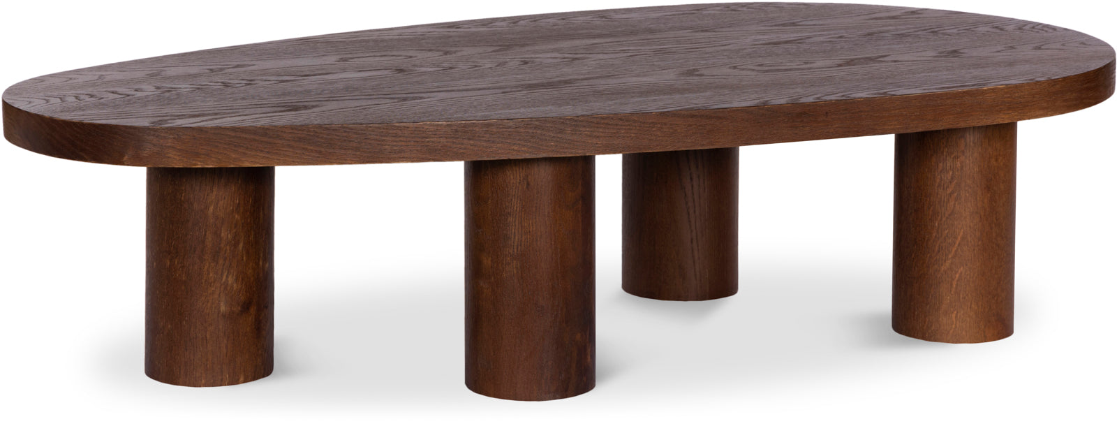 Merge style with durability when you add this brown Beekman coffee table to your room. Crafted from solid oak wood with a sleek brown finish, this table exudes both classic elegance and contemporary charm. The table's oval shape and columnar legs add an art deco slant to its design, so it's a showstopper in your space. Whether you're serving drinks or displaying decor, this table combines form and function effortlessly.