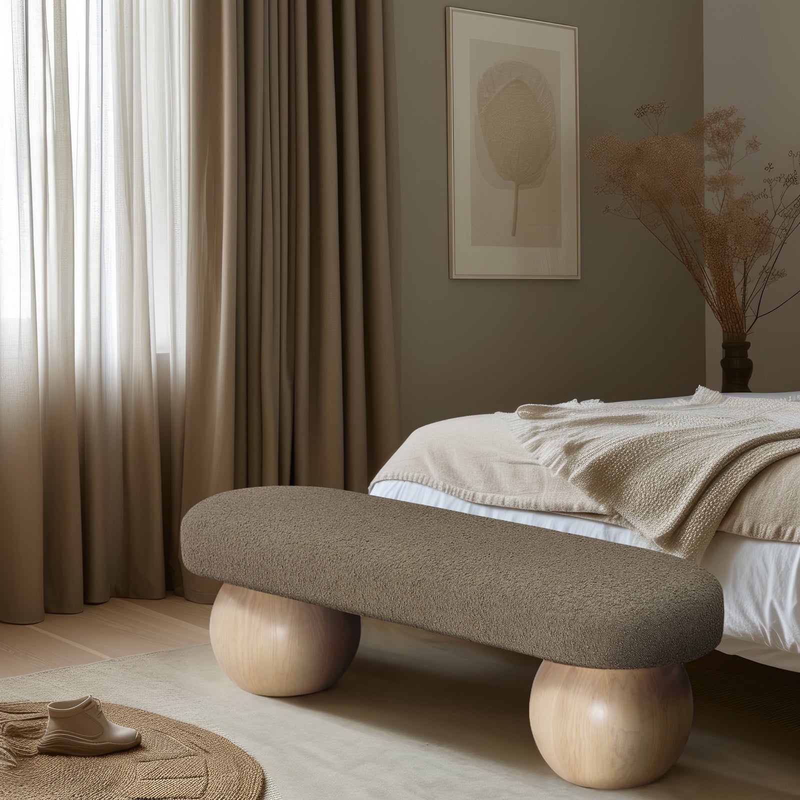 Bowie Boucle Fabric Bench – Luxurious Art Deco Design with Natural Ash Wood Legs for Elegant Spaces