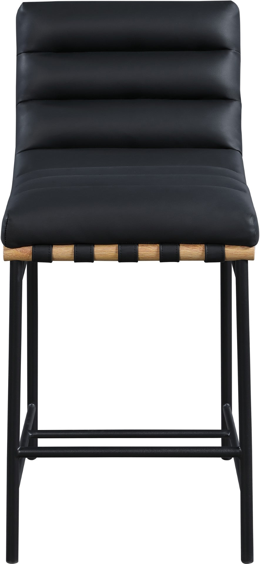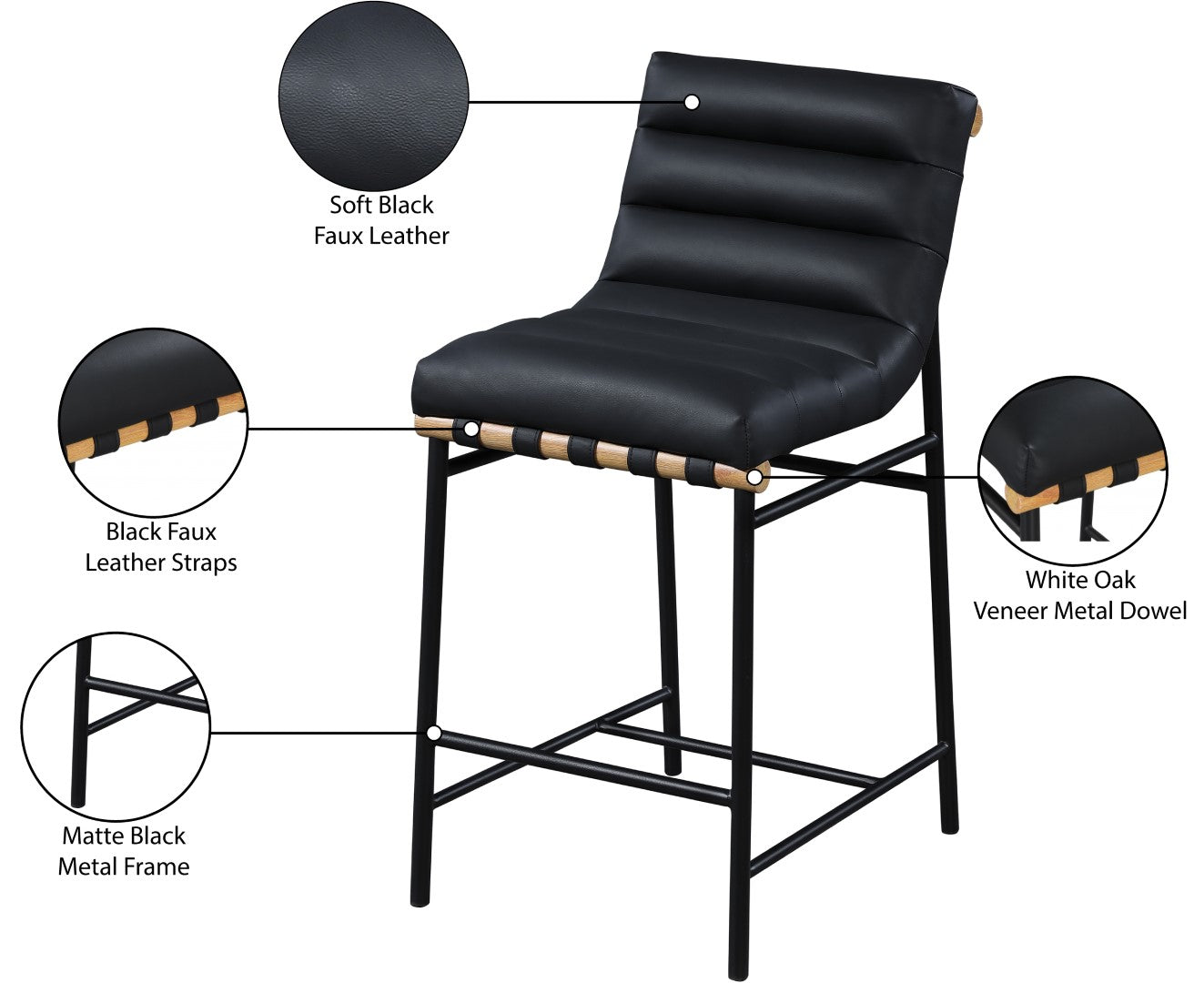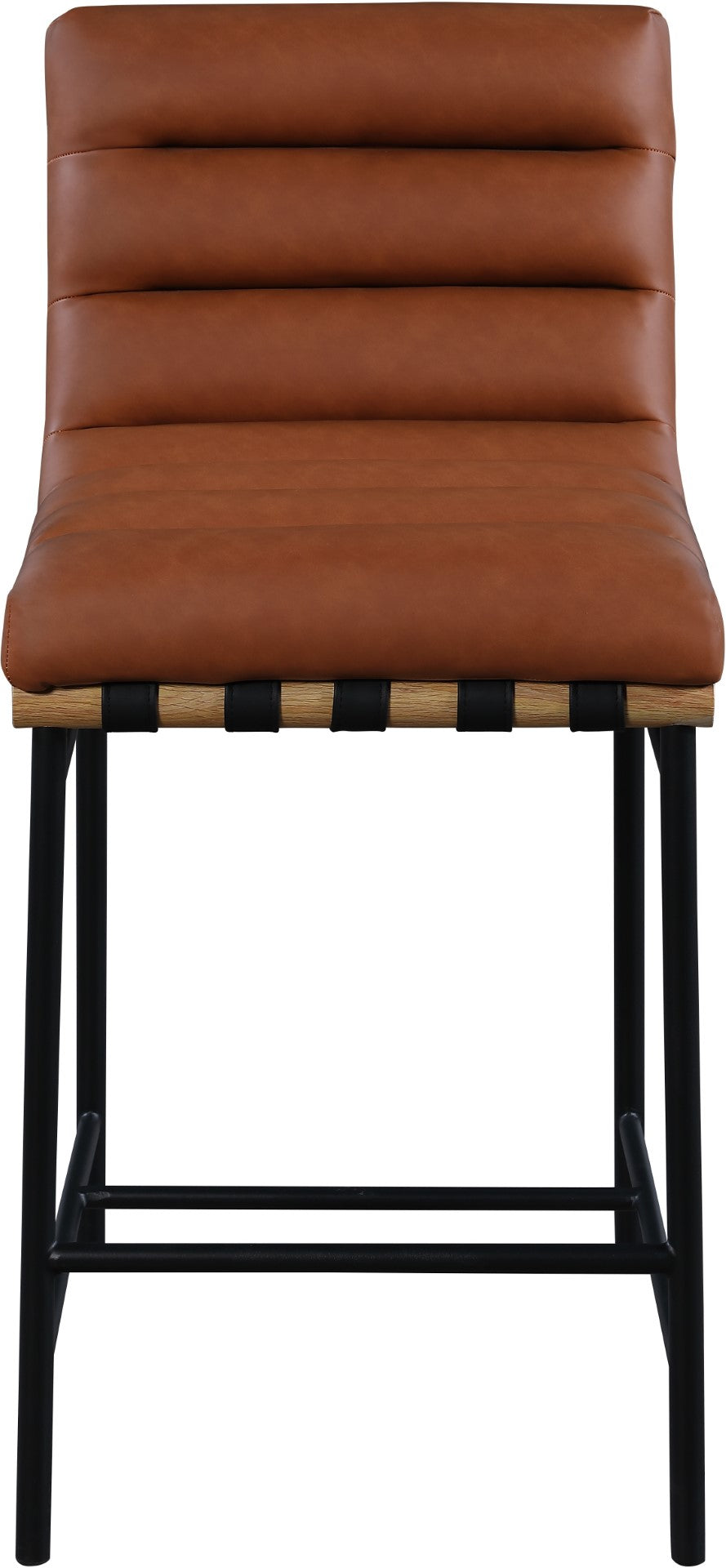 Kick back and relax with a drink in your hand with this Burke cognac vegan leather counter stool. Featuring soft cognac vegan leather upholstery and black vegan leather straps, this counter stool is cozy and stylish. Its matte black metal frame provides sturdy support so you can enjoy this stool for years to come. A white oak veneer metal dowel is tucked firmly in place beneath the front of the stool, providing extra support and added style.