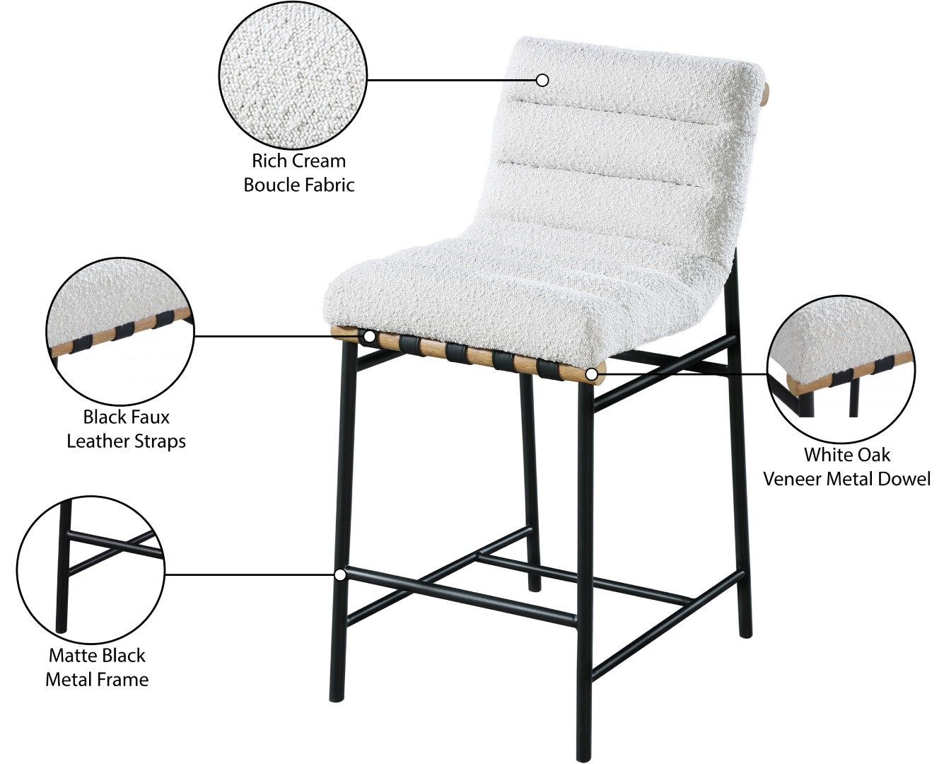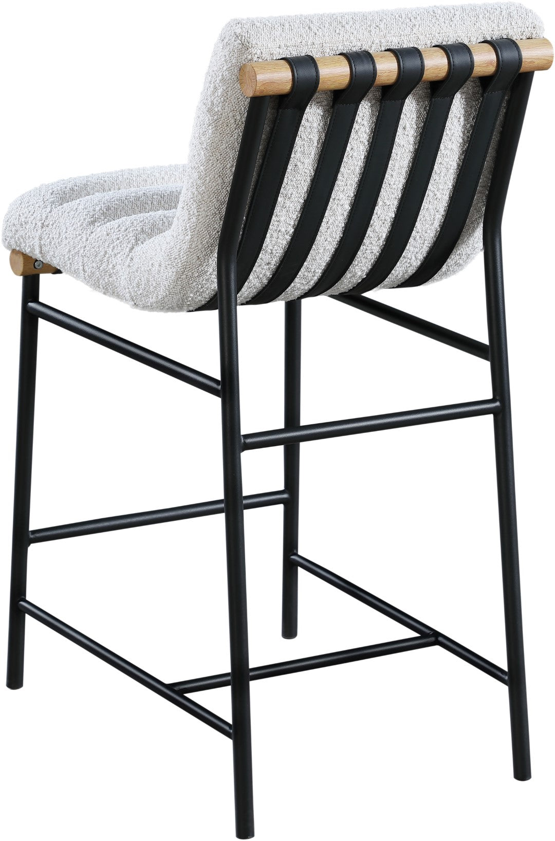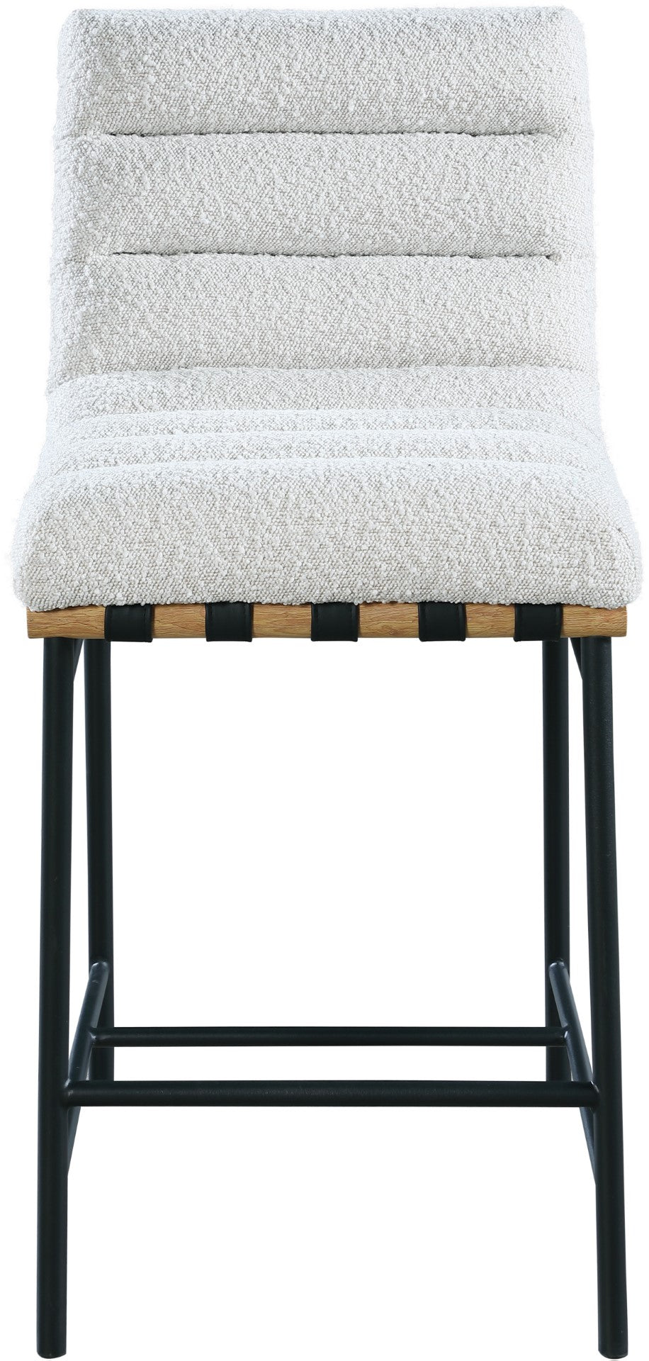 Kick back and relax with a drink in your hand with this Burke cognac vegan leather counter stool. Featuring soft cognac vegan leather upholstery and black vegan leather straps, this counter stool is cozy and stylish. Its matte black metal frame provides sturdy support so you can enjoy this stool for years to come. A white oak veneer metal dowel is tucked firmly in place beneath the front of the stool, providing extra support and added style.