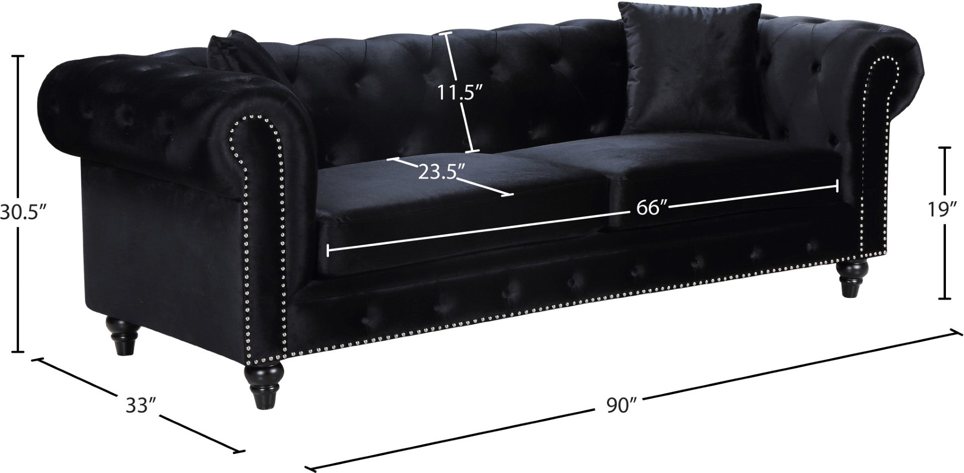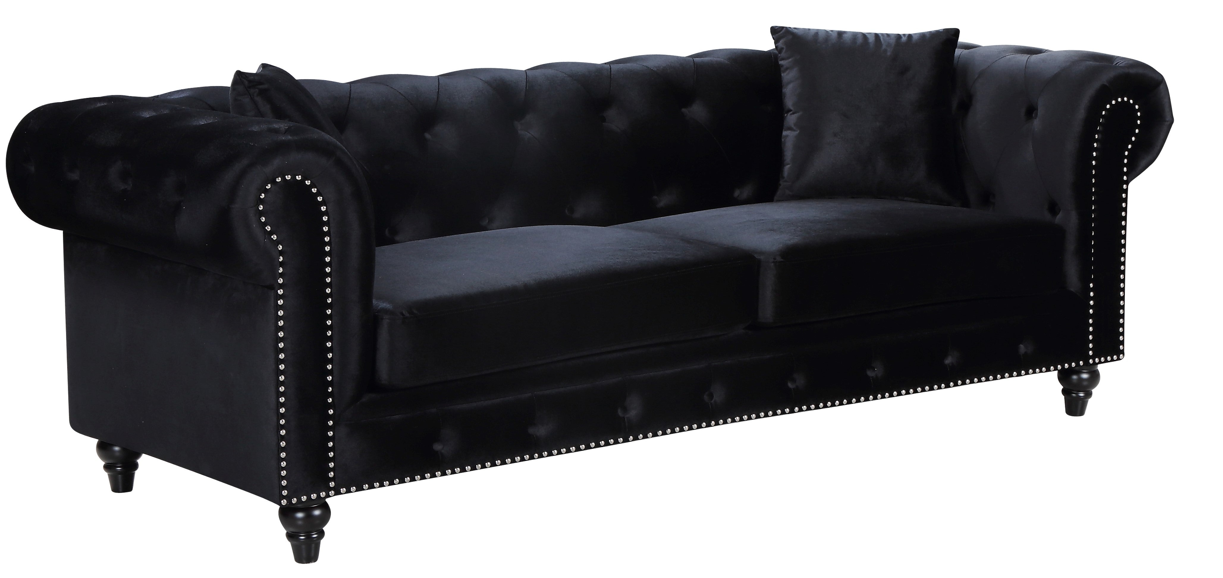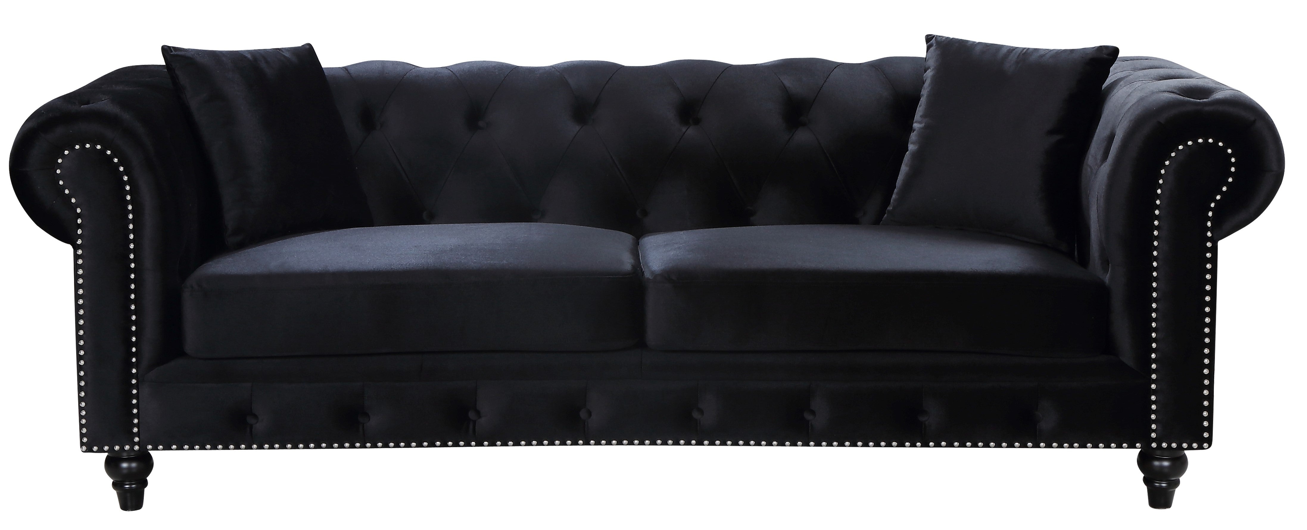 Chesterfield Elegant Black Velvet Contemporary Sofa with Silver Nailheads & Plush Throw Pillows