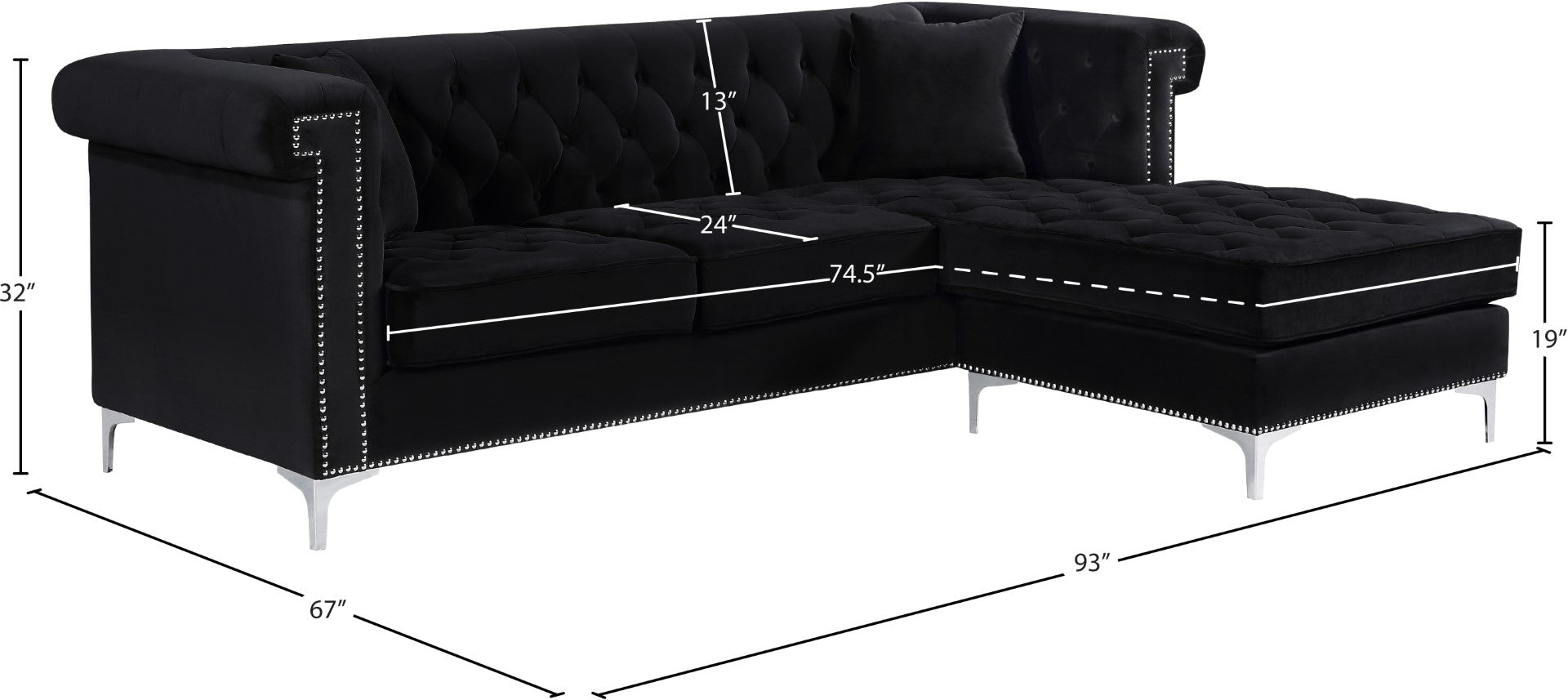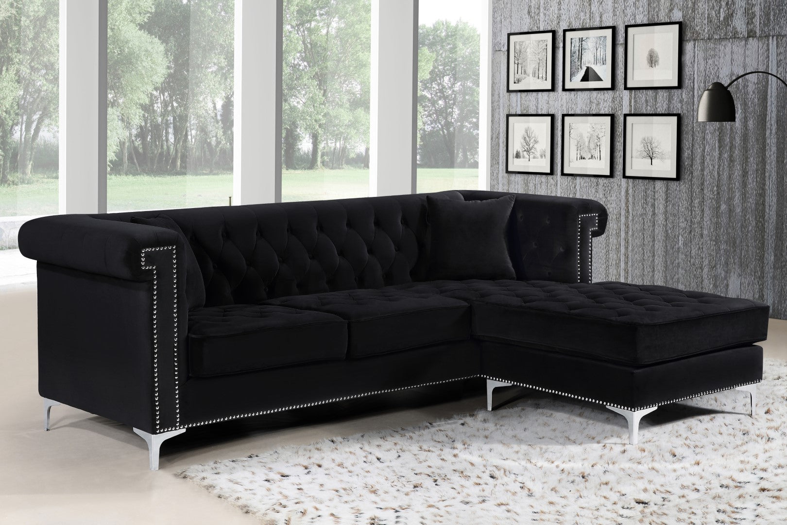 Curl up and take it easy on this two-piece Damian black velvet reversible sectional sofa. A reversible chaise on one end ensures...