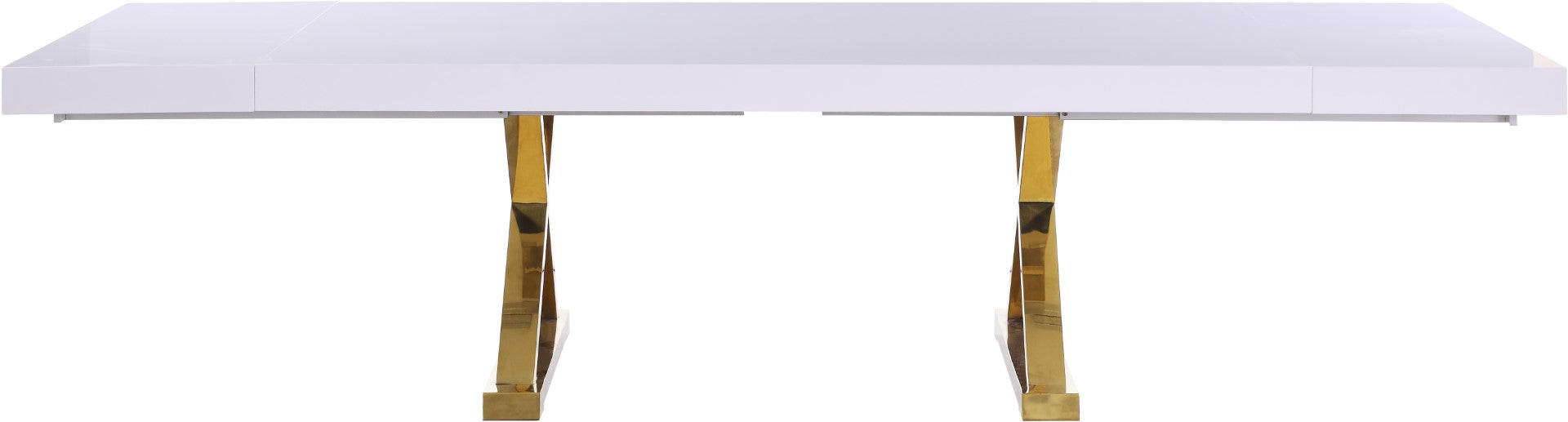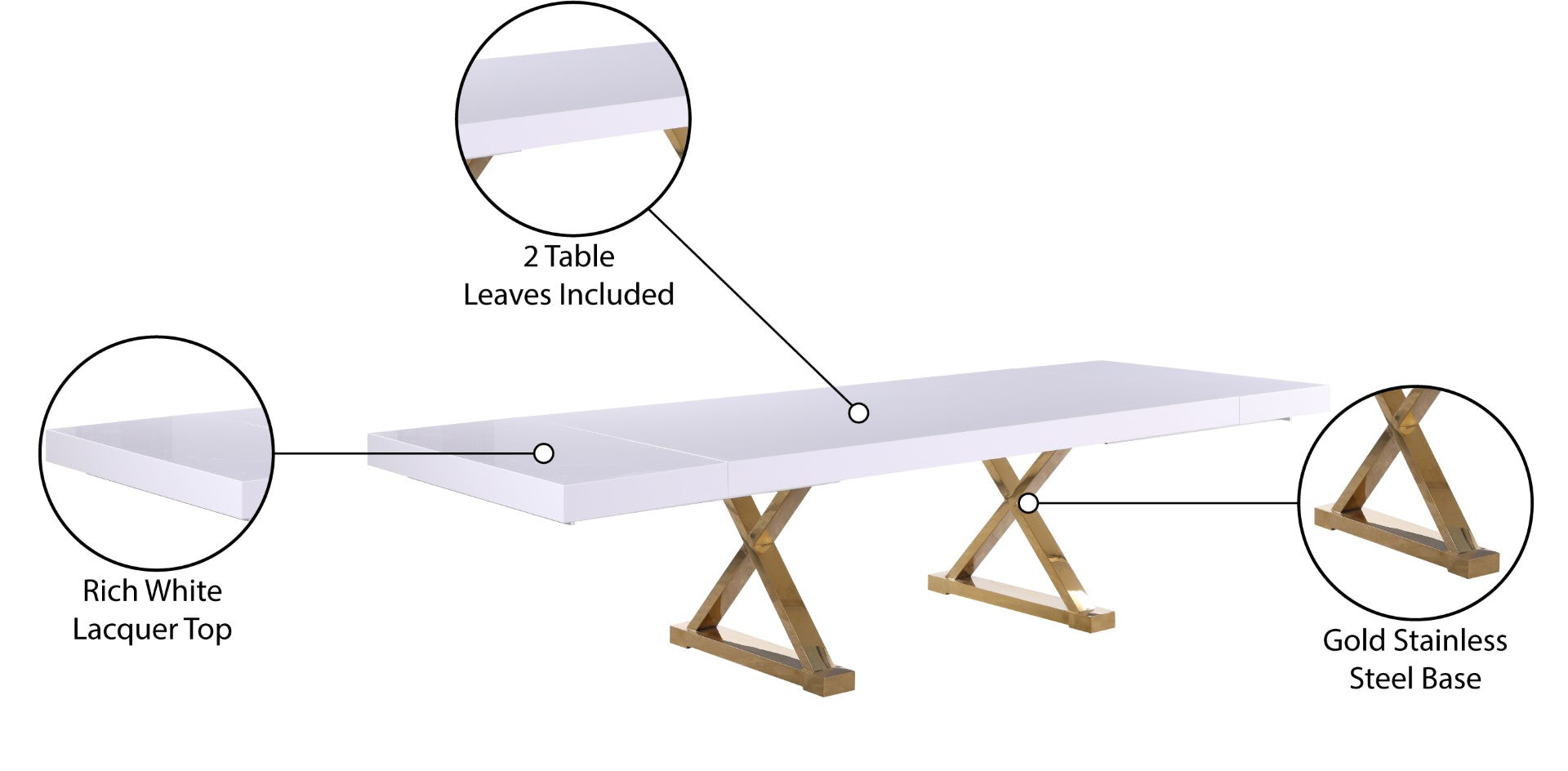 Excel Extendable Dining Table with White Lacquer Top & Gold Stainless Steel Base - Perfect for Gatherings!