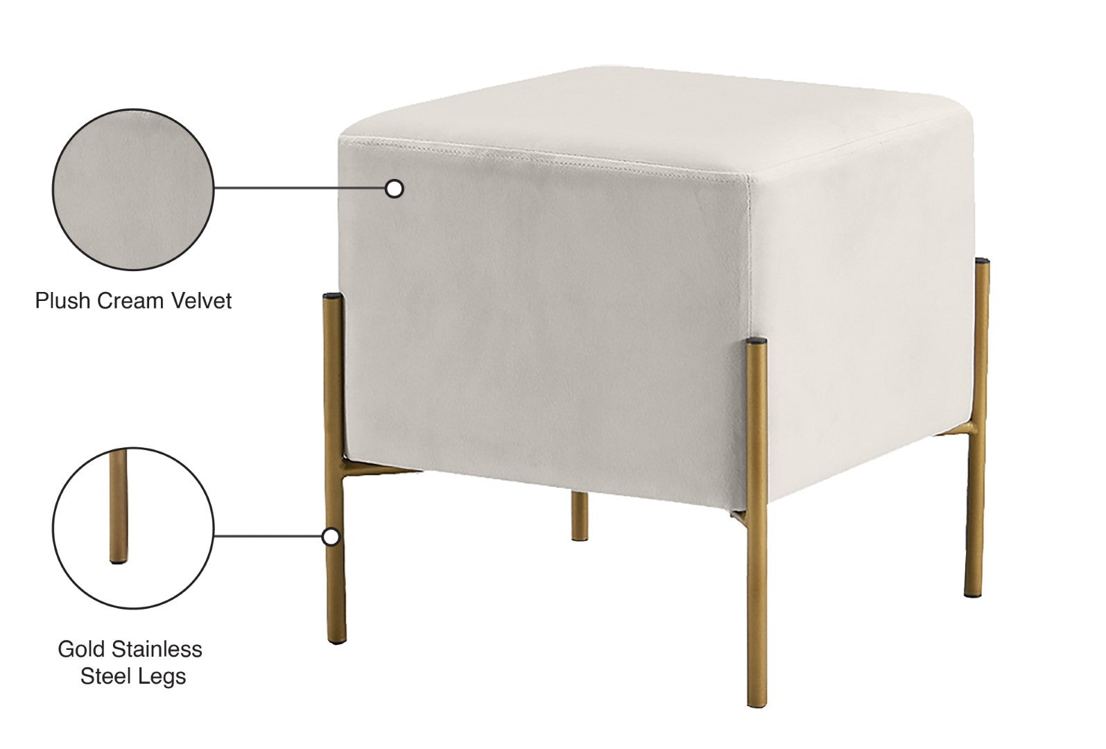 Isla Contemporary Velvet Ottoman with Stylish Gold Stainless Steel Legs for Modern Interiors