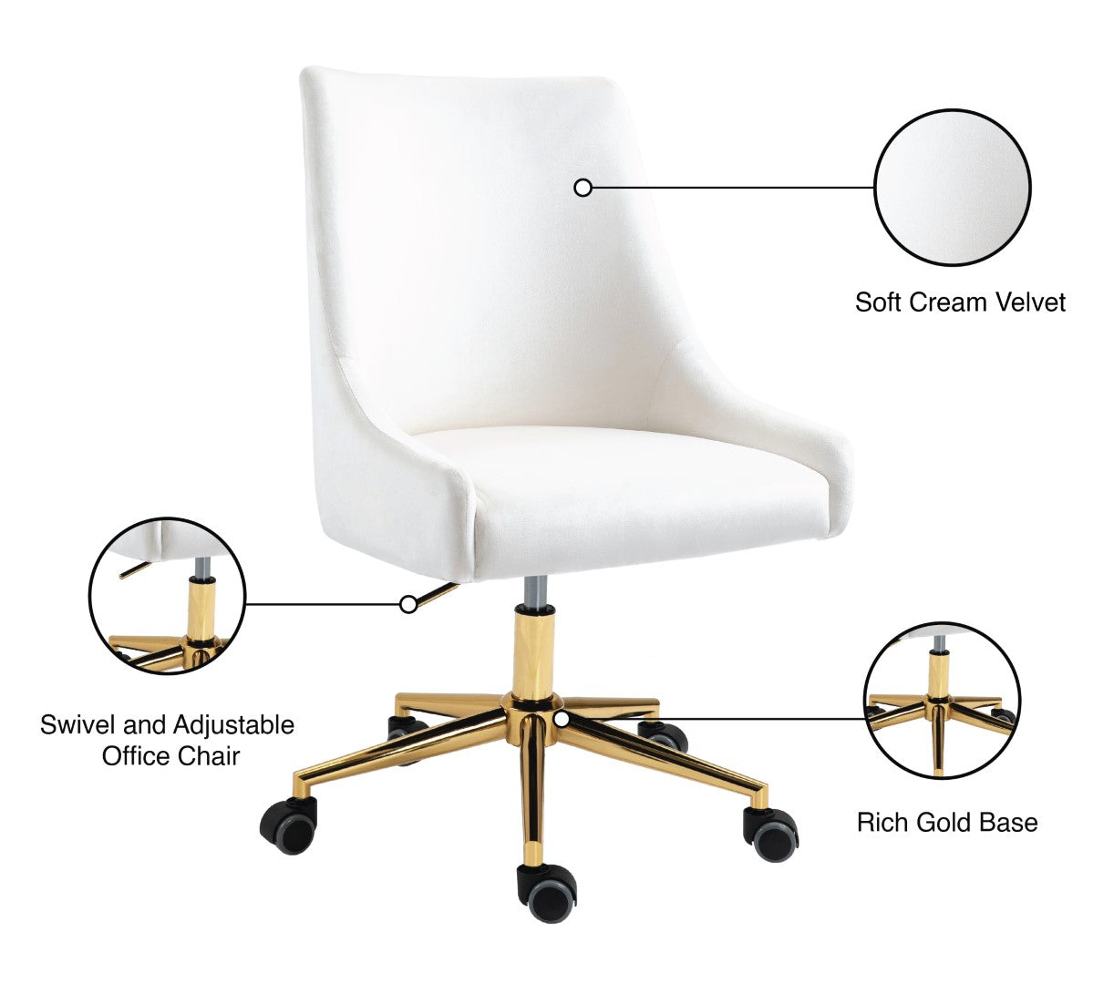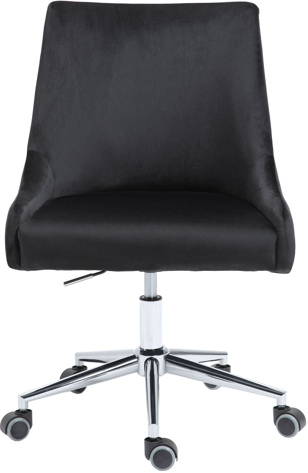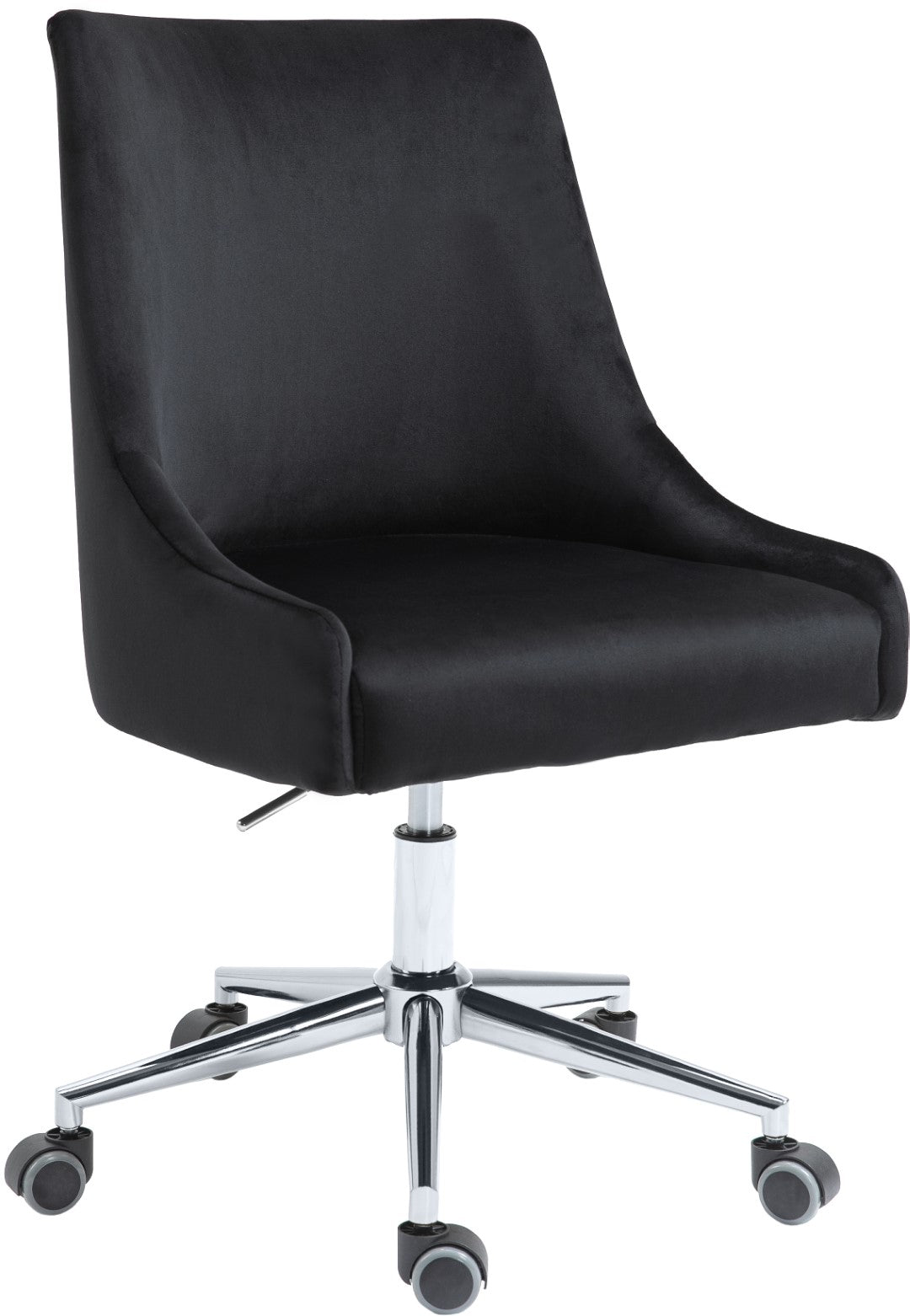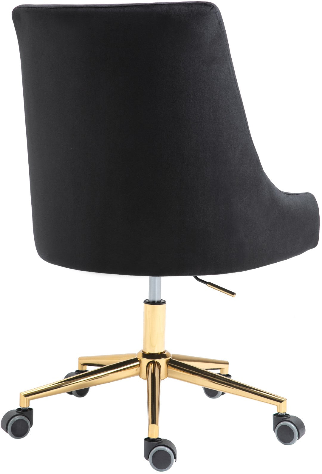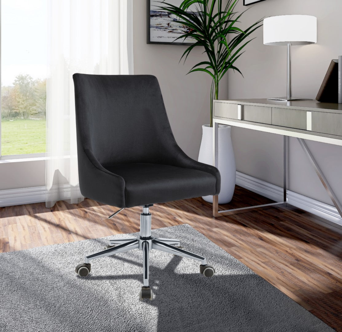 Bring functional beauty to the limelight whenyou'rere seated in the comforting confines of this Karina Velvet Office Chair. This chair isn't just another handsome face for your office, althoughyou'rell fall for its soft black velvet upholstery and rich gold base. This contemporary chair is just as utilitarian as it is attractive, with its swiveling design and five-star base with casters to make it easy to maneuver around your workstation. The chair is also adjustable, so it's easy to get comfortable and find your favorite sitting position.