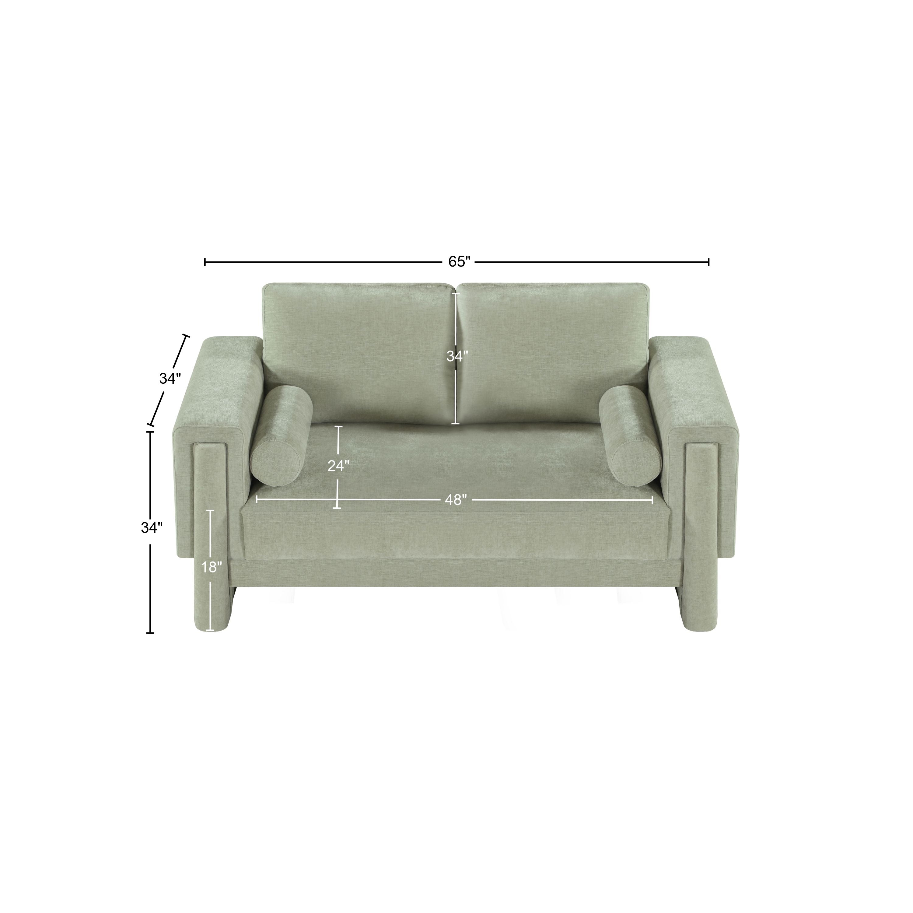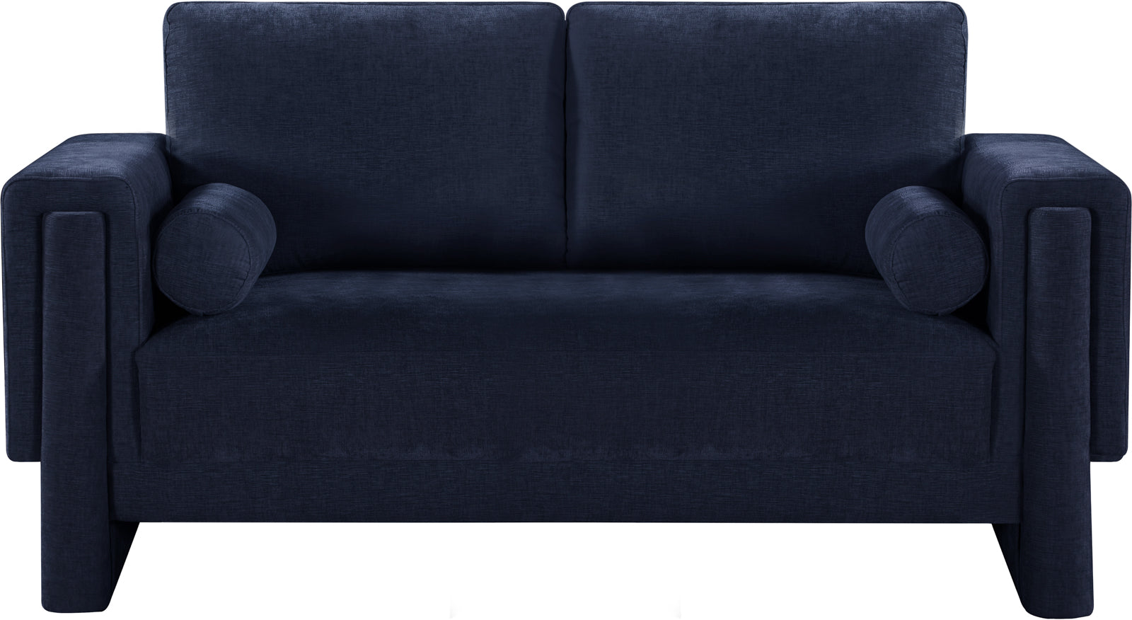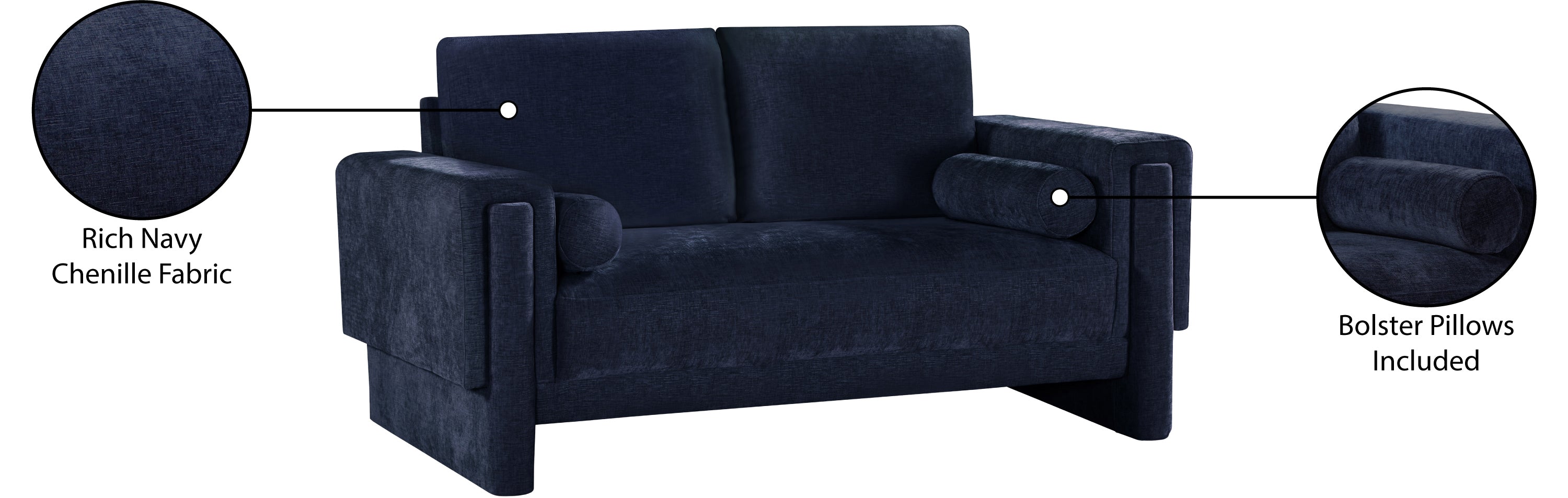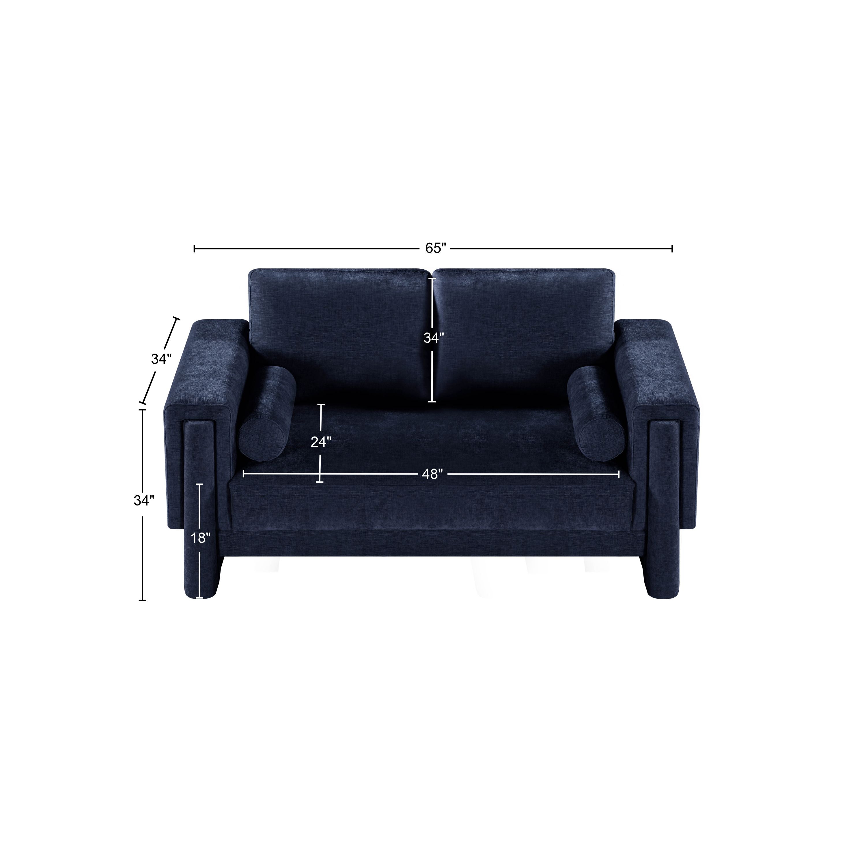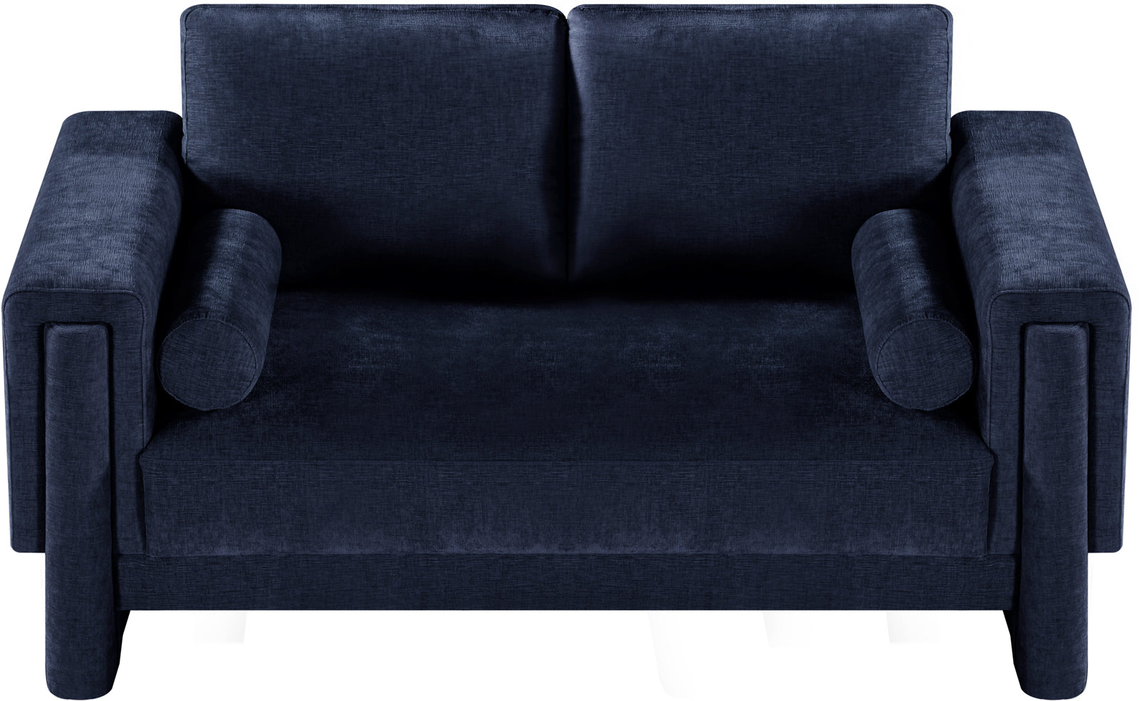 Refresh your living space with this Madeline chenille fabric living room loveseat. It's upholstered in navy chenille fabric with plush padding and bolster pillows that complete the look while supporting your body while you relax and unwind. The loveseat's modish design ensures it seamlessly complements any decor and fits well with other items in the Madeline collection. Whether you're entertaining guests or unwinding with a book, this chair provides both coziness and sophistication.