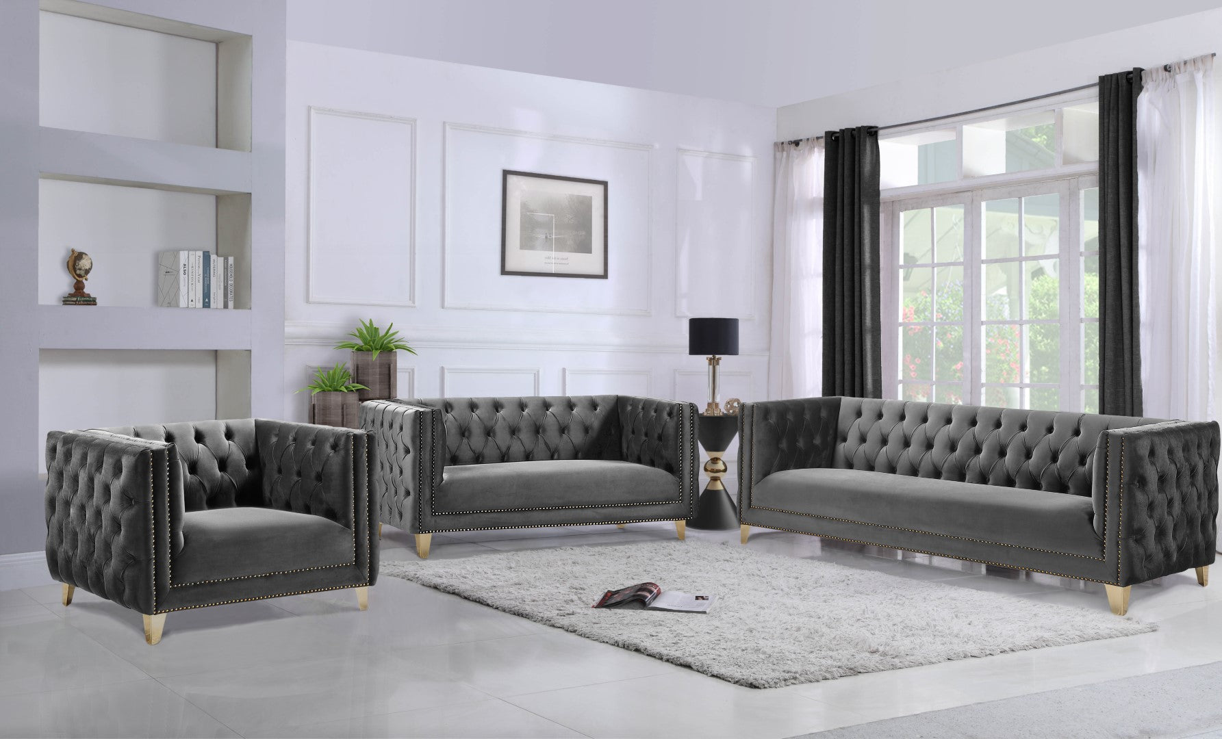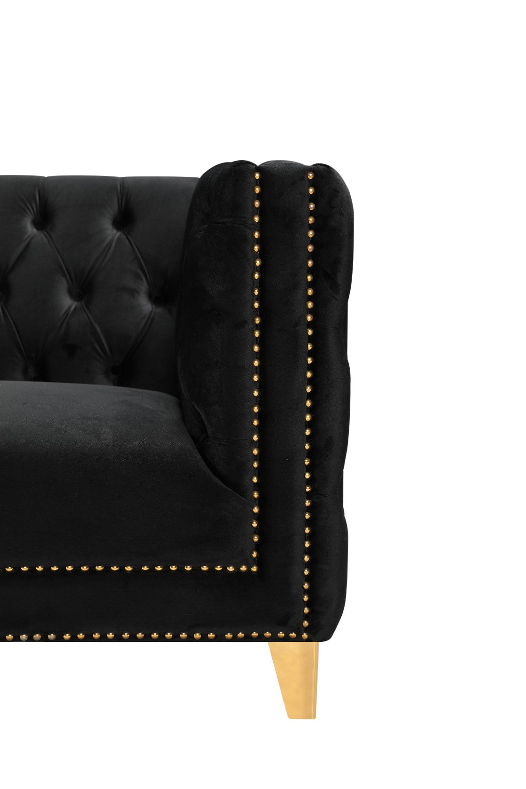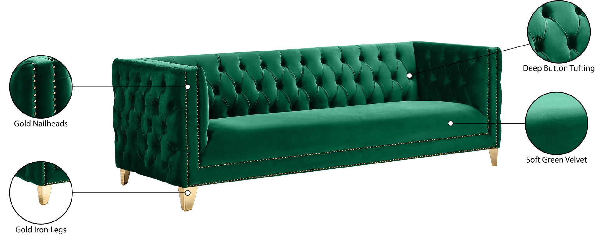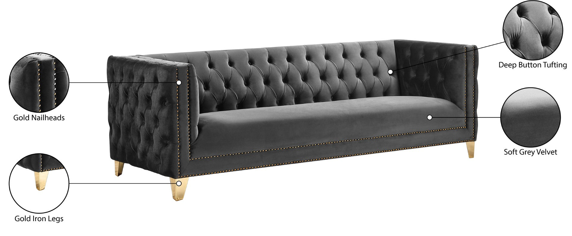 Michelle Velvet Sofa with Gold Nailhead Trim and Iron Legs - Glamorous Contemporary Design