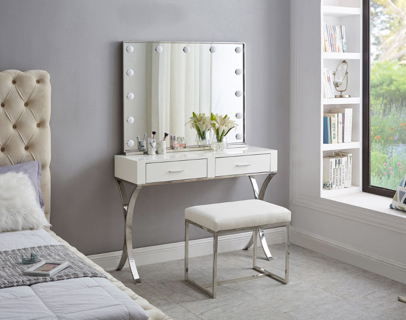 Monroe Faux Leather Contemporary Ottoman with Elegant Stainless Steel Base for Any Room Decor