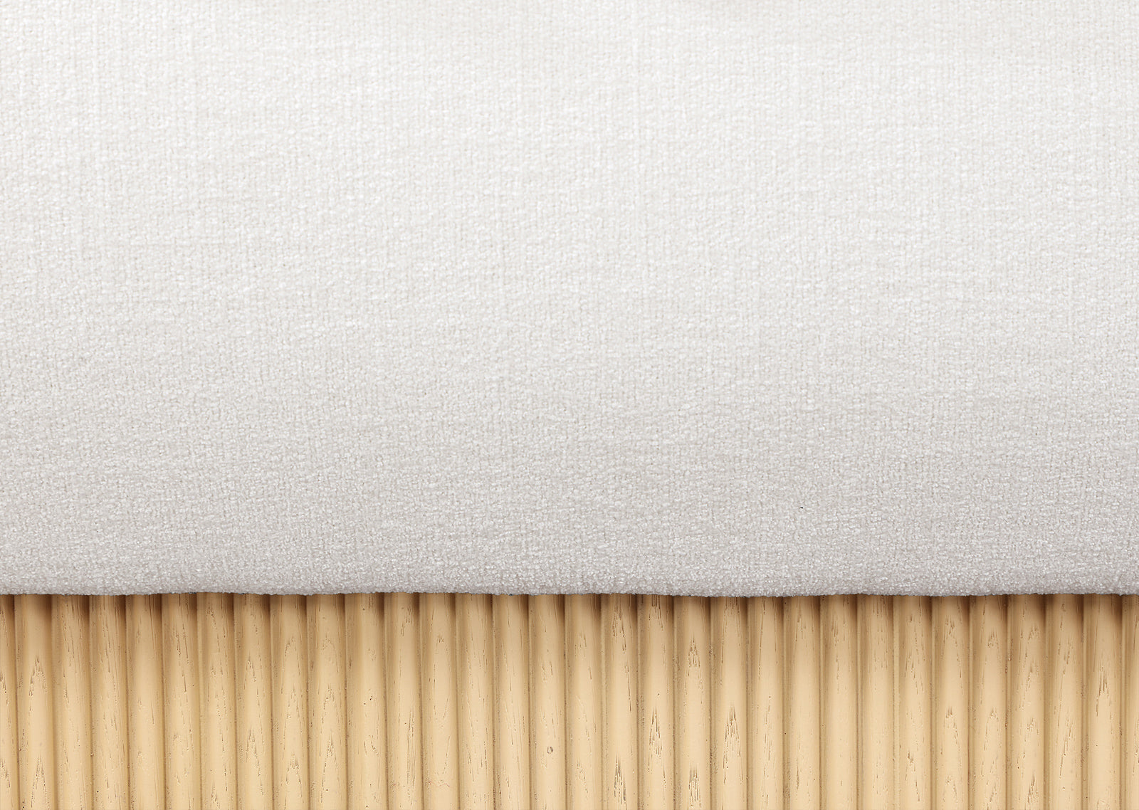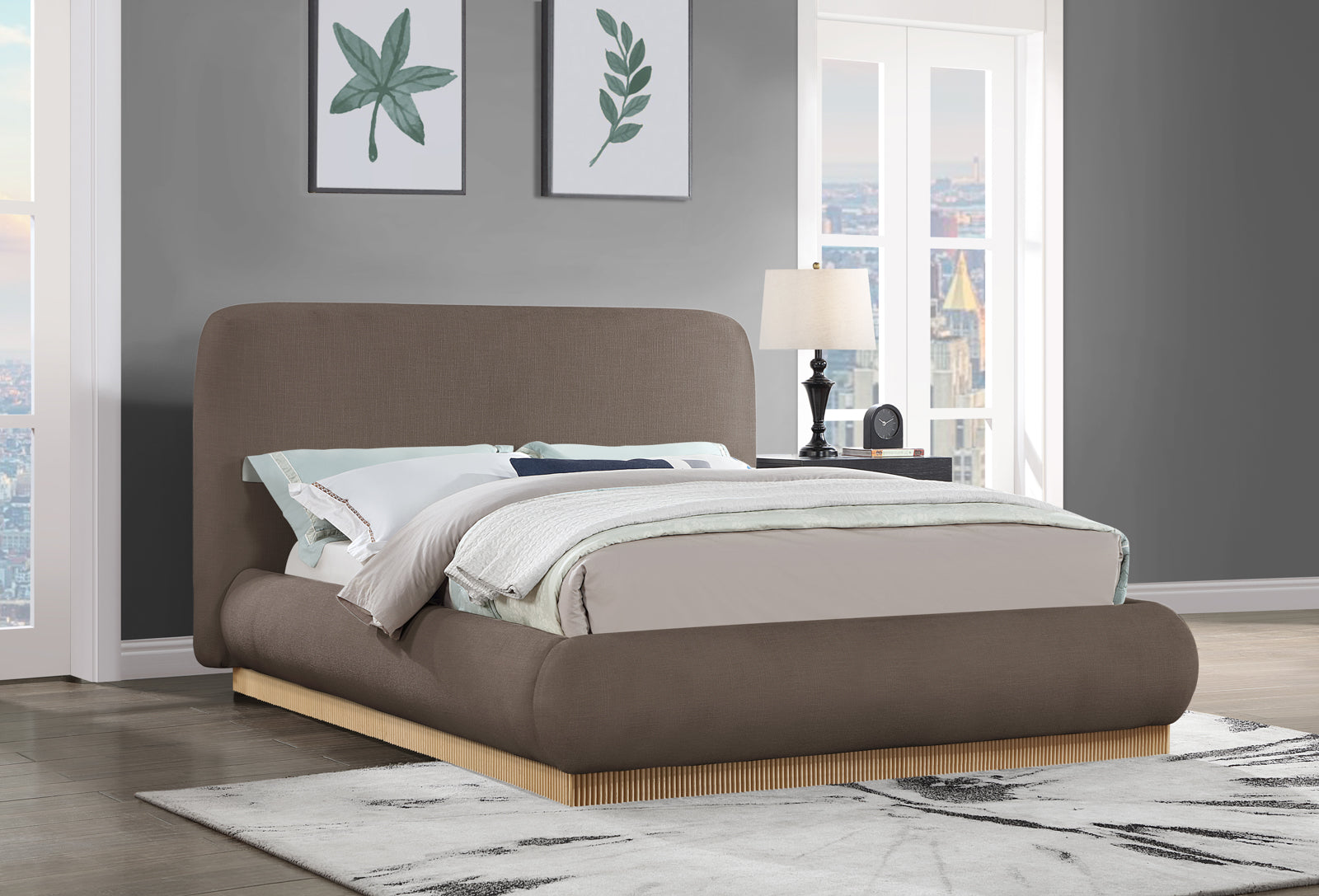 Rigby Art Deco King Bed in Rich Brown Linen Fabric with Fully Slatted Design and Natural Finish