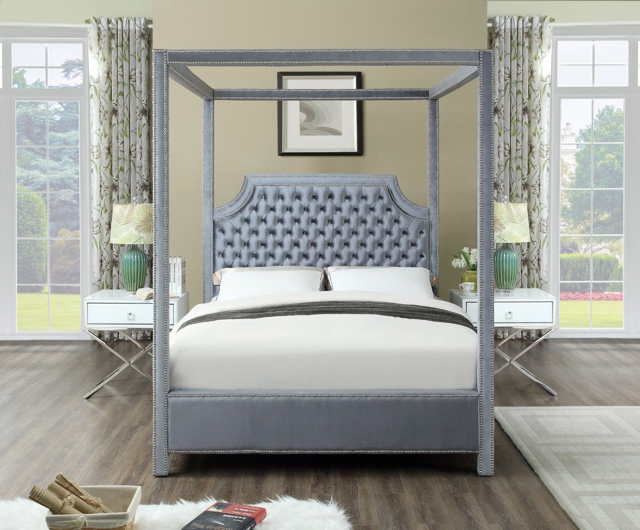 Rowan Velvet Canopy Bed with Luxurious Tufting and Chrome Nailheads for a Regal Bedroom Retreat
